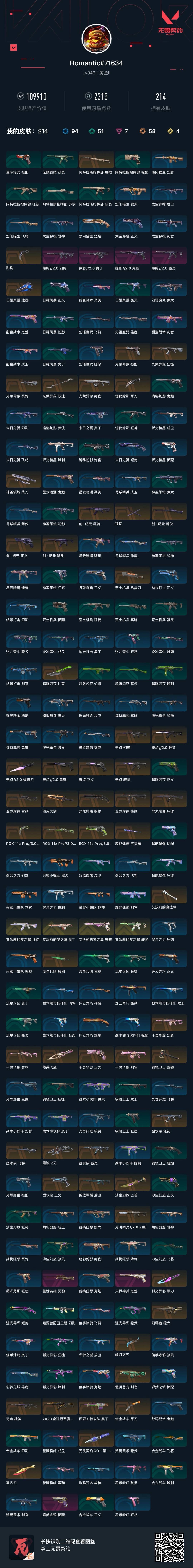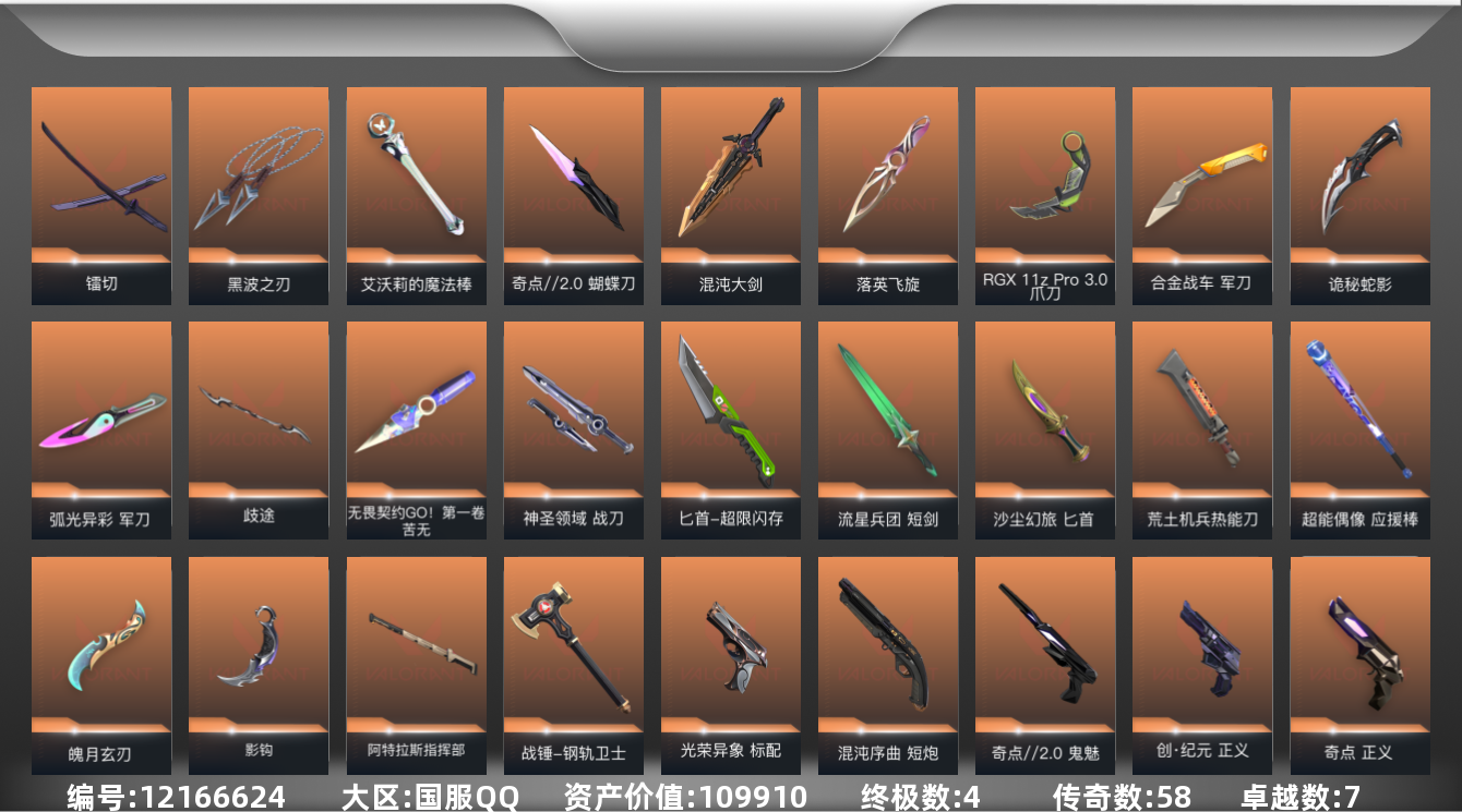 [12166624]58橙皮 4金皮 7紫皮 214皮肤 27英雄 299卡面 2315已用源晶 黄金 优质装备:塑水宗套装,艾沃莉的梦之翼套装,混沌序曲套装,千灵华绽套装,RGX 11z Pro//3.0套装,奇点//2.0套装,离火刃,正义-奇点,狂徒-2023全球冠军赛,狂徒-塑水宗,幻影-千灵华绽,冥驹-千灵华绽,狂徒-艾沃莉的梦之翼,狂徒-混沌序曲,冥驹-混沌序曲,幻影-奇点,獠犬-归零者,幻影-光明哨兵2.0,正义-塑水宗,正义-千灵华绽,正义-RGX 11z Pro 3.0,狂徒-奇点//2.0,奥丁-艾沃莉的梦之翼,骇灵-艾沃莉的梦之翼,标配-紫阙金琅,骇灵-奇点,奥丁-砰砰X特攻队,军刀-合金战车,苦无-无畏契约GO!第一卷,判官-偃月苍龙,魄月玄刃,鬼魅-天界神兵,戍卫-破败军械,黑波之刃,飞将-塑水宗,骇灵-塑水宗,判官-千灵华绽,落英飞旋,鬼魅-艾沃莉的梦之翼,艾沃莉的魔法棒,爪刀-RGX 11z Pro 3.0,混沌大剑,匕首-超限闪存,鬼魅-奇点//2.0,蝴蝶刀-奇点//2.0,荒土机兵热能刀,镭切,神圣领域 战刀,诡秘蛇影,光荣异象,阿特拉斯指挥部,影钩 套装:掠影2.0套装,光荣异象,创·纪元套装 佩枪皮肤:正义-创·纪元,短炮-混沌序曲,标配-光荣异象,鬼魅-掠影2.0 冲锋枪皮肤:骇灵-掠影2.0,骇灵-创·纪元,蜂刺-混沌序曲 霰弹枪皮肤:判官-光荣异象 步枪皮肤:狂徒-创·纪元,幻影-掠影2.0,狂徒-光荣异象 狙击枪皮肤:莽侠-创·纪元,冥驹-光荣异象,冥驹-盖世英雄,莽侠-RGX 11z Pro 3.0 机枪皮肤:战神-奇点,奥丁-掠影2.0 近战武器皮肤:战锤-钢轨卫士,短剑-流星兵团,匕首-沙尘幻旅,超能偶像 应援棒,军刀-弧光异彩