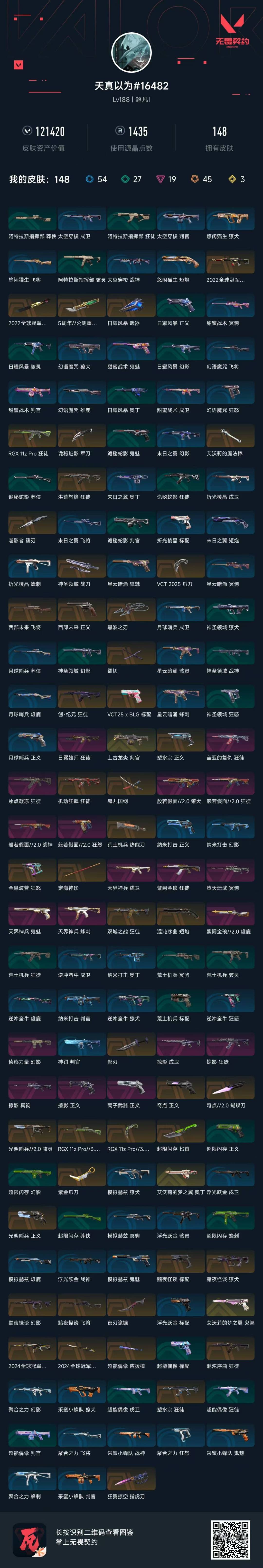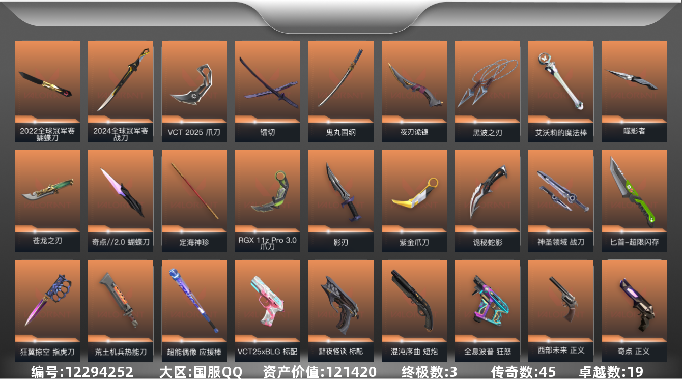 [12294252]45橙皮 3金皮 19紫皮 148皮肤 27英雄 139卡面 1435已用源晶 超凡 优质装备:黯夜怪谈套装,掠影套装,2024全球冠军赛套装,正义-奇点,狂徒-塑水宗,幻影-2024全球冠军赛,狂徒-混沌序曲,狂徒-掠影,狂徒-紫阙金琅,狂徒-盖亚的复仇,幻影-侦察力量,狂徒-机动狂飙,正义-塑水宗,冥驹-堕天遗武,狂徒-洪荒怒焰,正义-离子武器,狂徒-日冕雄师,幻影-黯夜怪谈,正义-光明哨兵,正义-掠影,冥驹-掠影,奥丁-艾沃莉的梦之翼,戍卫-掠影,狂徒-冰点凝冻,鬼魅-天界神兵,戍卫-天界神兵,定海神珍,骇灵-光明哨兵2.0,紫金爪刀,黑波之刃,鬼魅-艾沃莉的梦之翼,艾沃莉的魔法棒,爪刀-RGX 11z Pro 3.0,狂翼掠空指虎刀,夜刃诡镰,匕首-超限闪存,蝴蝶刀-奇点//2.0,影刃,荒土机兵热能刀,鬼丸国纲,镭切,神圣领域 战刀,VCT 2025 爪刀,噬影者簇刃,诡秘蛇影,苍龙之刃,雄鹿-紫阙金琅2.0 亮点皮肤:战刀-2024全球冠军赛,幻影-2022全球冠军赛,2022全球冠军赛 蝴蝶刀 套装:般若假面//2.0套装,2022全球冠军赛,VCT 2025赛季礼包,VCTCN2025套装 佩枪皮肤:标配-VCT25xBLG,标配-黯夜怪谈,狂怒-般若假面//2.0,短炮-混沌序曲,正义-西部未来,狂怒-全息波普 冲锋枪皮肤:蜂刺-天界神兵 霰弹枪皮肤:判官-上古龙炎 步枪皮肤:狂徒-创·纪元,獠犬-黯夜怪谈,狂徒-双城之战,狂徒-般若假面//2.0,獠犬-般若假面//2.0,RGX 11z pro 狂徒 狙击枪皮肤:飞将-黯夜怪谈,飞将-西部未来,莽侠-RGX 11z Pro 3.0 机枪皮肤:战神-般若假面//2.0 近战武器皮肤:超能偶像 应援棒