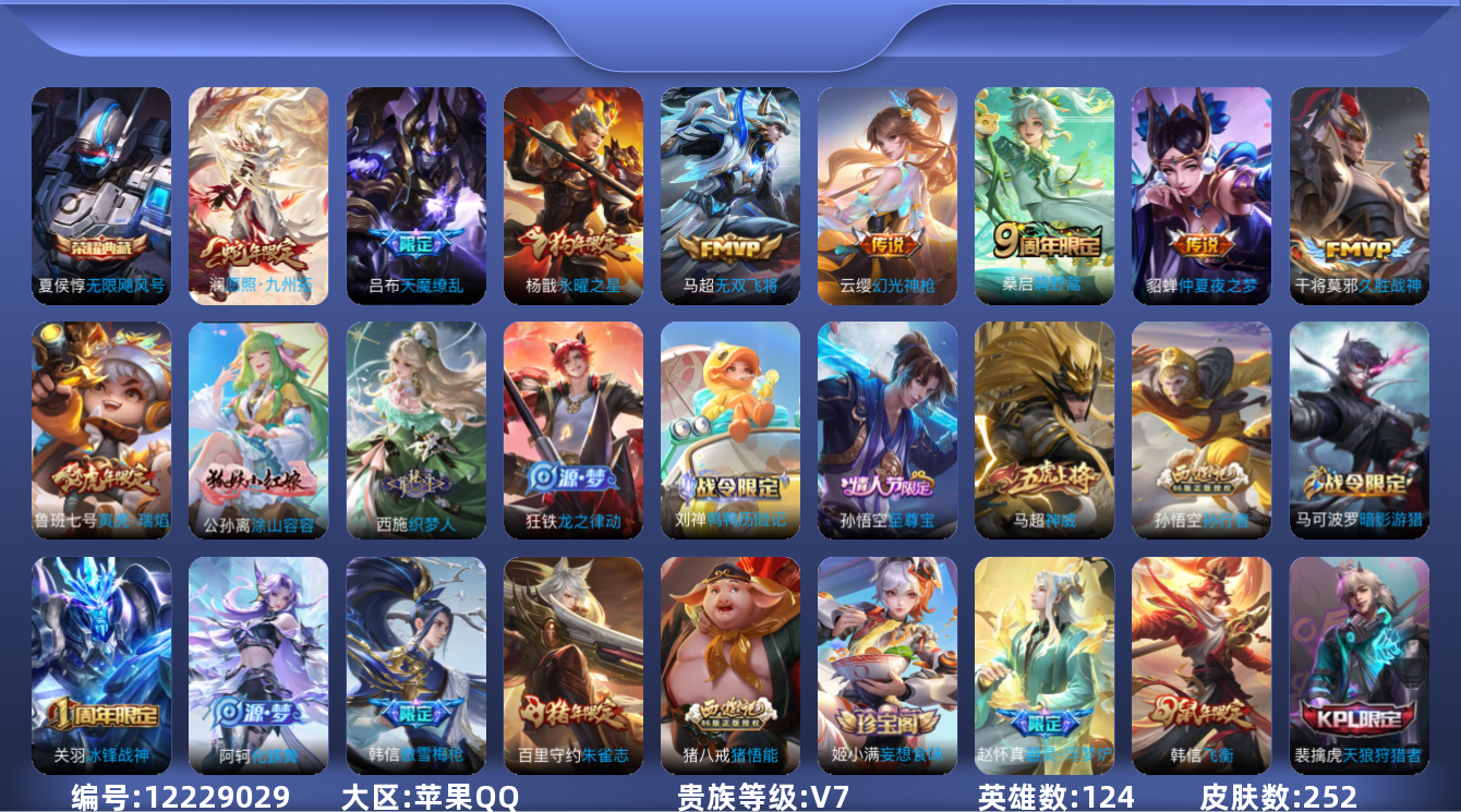 [12229029]V7 1典藏 9传说 124英雄 252皮肤 可修改实名 优质装备:无限飓风号(高达),久胜战神,仲夏夜之梦(大飞蛾),无双飞将,涂山容容 传说皮:幻光神枪 珍宝阁皮:妄想食味,女武神 限定皮:愿照·九州拓(澜年限),鸣野蒿,至尊宝,傲雪梅枪,神威(电光马子),飞衡(韩信年限),高山流水,五谷丰年,冰锋战神,天狼狩猎者,李小龙,朱雀志(守约年限),永曜之星,孙行者,猪悟能,天魔缭乱,寅虎·瑞焰(虎皮蛋子) 史诗皮:器灵·浮梦炉,化蝶舞,鸭鸭历险记-刘禅,龙之律动,茶境仙,破空之剑,织梦人,苍穹之光,电玩小子(小书包),白龙吟,黄金分割率,特工魅影,千年之狐,永昼,江河有灵,电玩·爆裂旋风,匿光破解者,暗夜猫娘,末日机甲-吕布,猫狗日记-孙策,乱世虎臣,修罗,女仆咖啡,摇滚巨星,水果甜心,绅士熊喵,心灵骇客,时之奇旅-安琪拉,功夫厨神,暗隐猎兽者,鬼剑武藏,心灵战警,地狱岩魂,纤云弄巧,拒霜思,缤纷独角兽,乘风破浪,逐浪之夏,水晶猎龙者,箭羽风息,金属风暴,原初追逐者,圣诞狂欢,圣诞恋歌,鹰眼统帅,魅力维加斯,黎明之约,赏金猎手,无心,未来纪元-赵云