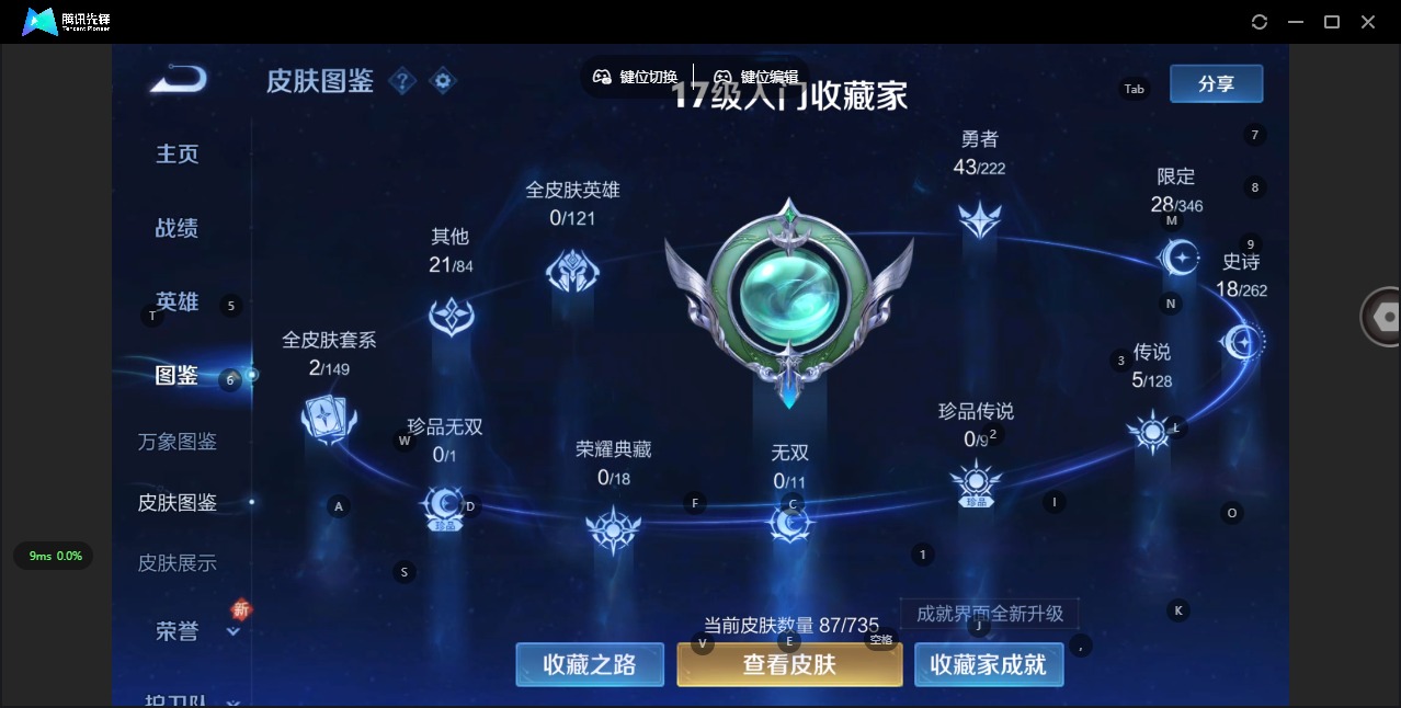 - PX_2083264-46 苹果QQ/至尊星耀/269皮肤/124英雄/1典藏/0珍品无双/1无双/2珍品传说/23传说/78史诗/8稀有英雄 【2 珍品传说】怪盗基德 马可波罗,时之奇旅 孙策, 【1 典藏皮肤】拾光映像 瑶, 【1 无双皮肤】器灵·螭龙剑 曜, 【23 传说皮肤】启明星使 虞姬,云霓雀翎 虞姬,逐花归海 澜,诗剑行 李白,浮生妄 夏洛特,落雪白狼 亚连,惊梅引 宫本武藏,祈雪灵