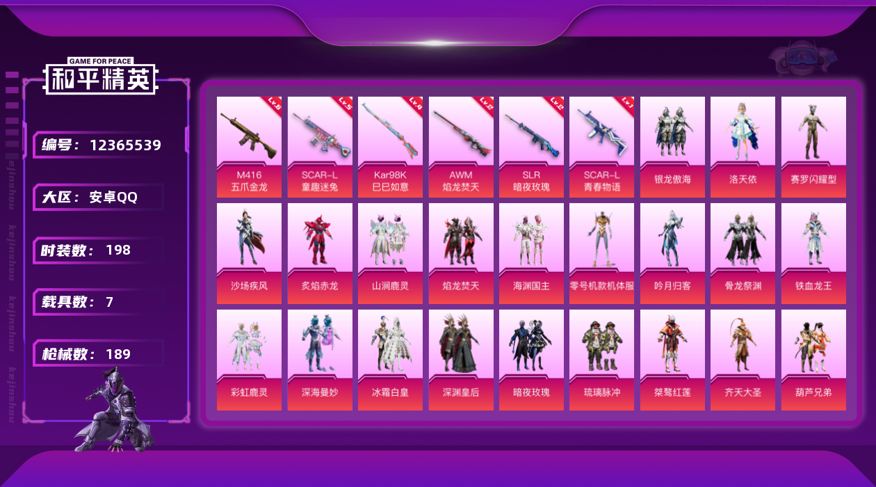 【粉色枪皮等级】:SCAR-L-童趣迷兔(五级),SCAR-L-青春物语(一级),M416-五爪金龙(六级),Kar98K-巳巳如意(四级),AWM-焰龙焚天(二级),SLR-暗夜玫瑰(二级)