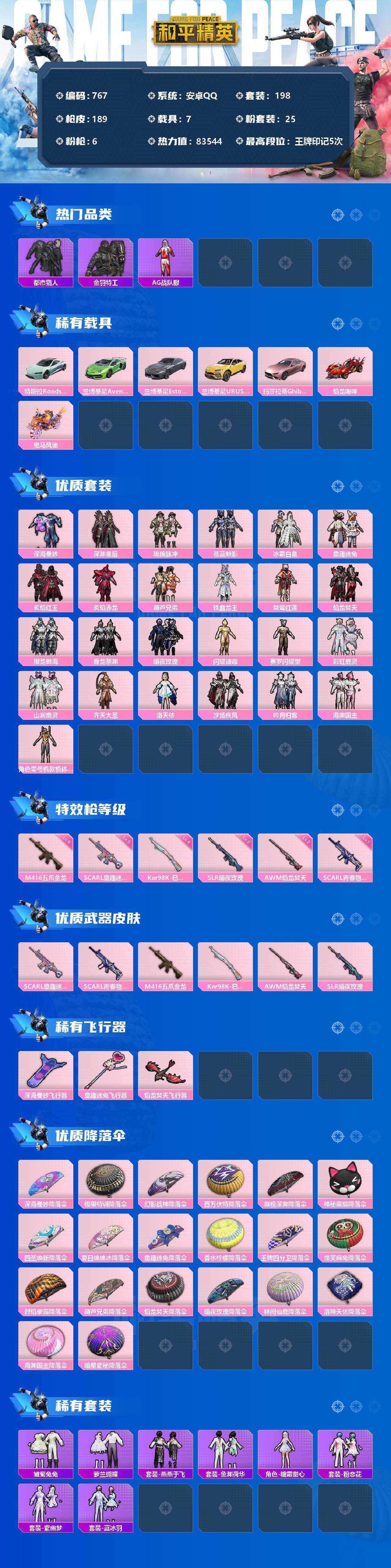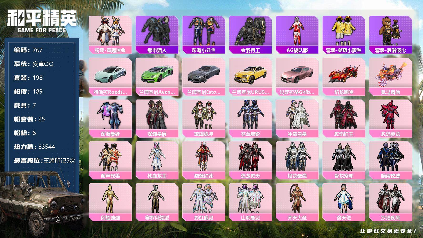 [12365539]【商品标题】:安卓 手Q-25粉装-6特效枪-7载具-3粉色飞行器-83544热力值-5王牌印记-198套装-189枪皮 【热门品类】:粉装-童趣迷兔,套装-都市猎人,套装-深海小丑鱼,套装-金羽特工,套装-AG战队服,套装-潮萌小黄鸭,套装-浪漫波比 【粉色载具】:特斯拉Roadster(水滴蓝),兰博基尼Aventador SVJ(翡翠绿),兰博基尼Estoque(银翼灰),兰博基尼URUS(明艳黄),玛莎拉蒂Ghibli(粉),焰龙咆哮,鬼马风驰 【粉色套装】:粉装-深海曼妙,粉装-深渊皇后,粉装-琉璃脉冲,粉装-苍蓝魅影,粉装-冰霜白皇,粉装-童趣迷兔,粉装-炙焰红王,粉装-炙焰赤龙,粉装-葫芦兄弟,粉装-铁血龙王,粉装-桀骜红莲,粉装-焰龙焚天,粉装-银龙傲海,粉装-骨龙祭渊,粉装-暗夜玫瑰,角色-闪耀迪迦,角色-赛罗闪耀型,粉装-彩虹鹿灵,粉装-山涧鹿灵,粉装-齐天大圣,角色-洛天依,粉装-沙场疾风,粉装-吟月归客,粉装-海渊国主,角色-零号机款机体服 【粉色枪皮等级】:SCAR-L-童趣迷兔(五级),SCAR-L-青春物语(一级),M416-五爪金龙(六级),Kar98K-巳巳如意(四级),AWM-焰龙焚天(二级),SLR-暗夜玫瑰(二级) 【粉色枪皮】:SCAR-L-童趣迷兔,SCAR-L-青春物语,M416-五爪金龙,Kar98K-巳巳如意,AWM-焰龙焚天,SLR-暗夜玫瑰 【粉色飞行器】:深海曼妙飞行器,童趣迷兔飞行器,焰龙焚天飞行器 【粉色降落伞】:深海曼妙降落伞,极限特训降落伞,幻影战神降落伞,百万伏特降落伞,凝视深渊降落伞,神秘黑猫降落伞,四圣焕新降落伞,夏日绵绵冰降落伞,童趣迷兔降落伞,香水柠檬降落伞,王牌四分卫降落伞,怪笑疯兔降落伞,烈焰拳霸降落伞,葫芦兄弟降落伞,焰龙焚天降落伞,暗夜玫瑰降落伞,林间仙鹿降落伞,洛神天依降落伞,海渊国主降落伞,暗星紫秘降落伞 【稀有套装】:套装-雏菊兔兔,套装-萝兰蝴蝶,套装-燕燕于飞,套装-鱼渊荷华,角色-糖霜甜心,套装-粉恋花,套装-紫幽梦,套装-蓝冰羽 【稀有枪皮】:AKM-冰凉西瓜,AKM-四圣焕新,AKM-夜灯,AKM-彩虹符号,AKM-影袭,AKM-星之彼岸,AKM-春暖花开,AKM-海渊国主,AKM-生命誓言,AKM-百万伏特,AKM-萌趣颜团子,AKM-虎虎生威,AKM-霓虹街区,M