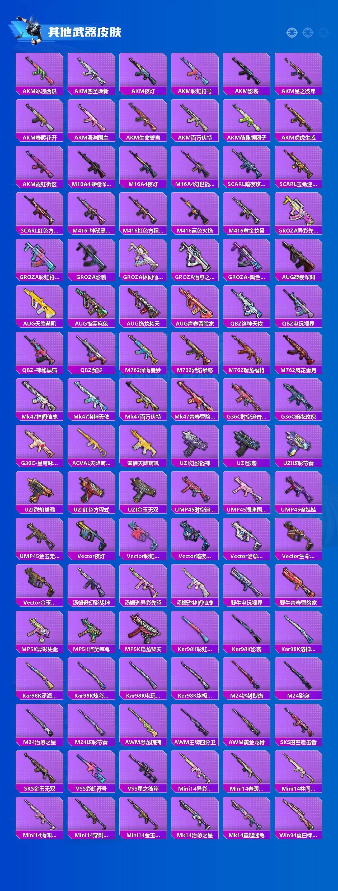 【稀有枪皮】:AKM-冰凉西瓜,AKM-四圣焕新,AKM-夜灯,AKM-彩虹符号,AKM-影袭,AKM-星之彼岸,AKM-春暖花开,AKM-海渊国主,AKM-生命誓言,AKM-百万伏特,AKM-萌趣颜团子,AKM-虎虎生威,AKM-霓虹街区,M