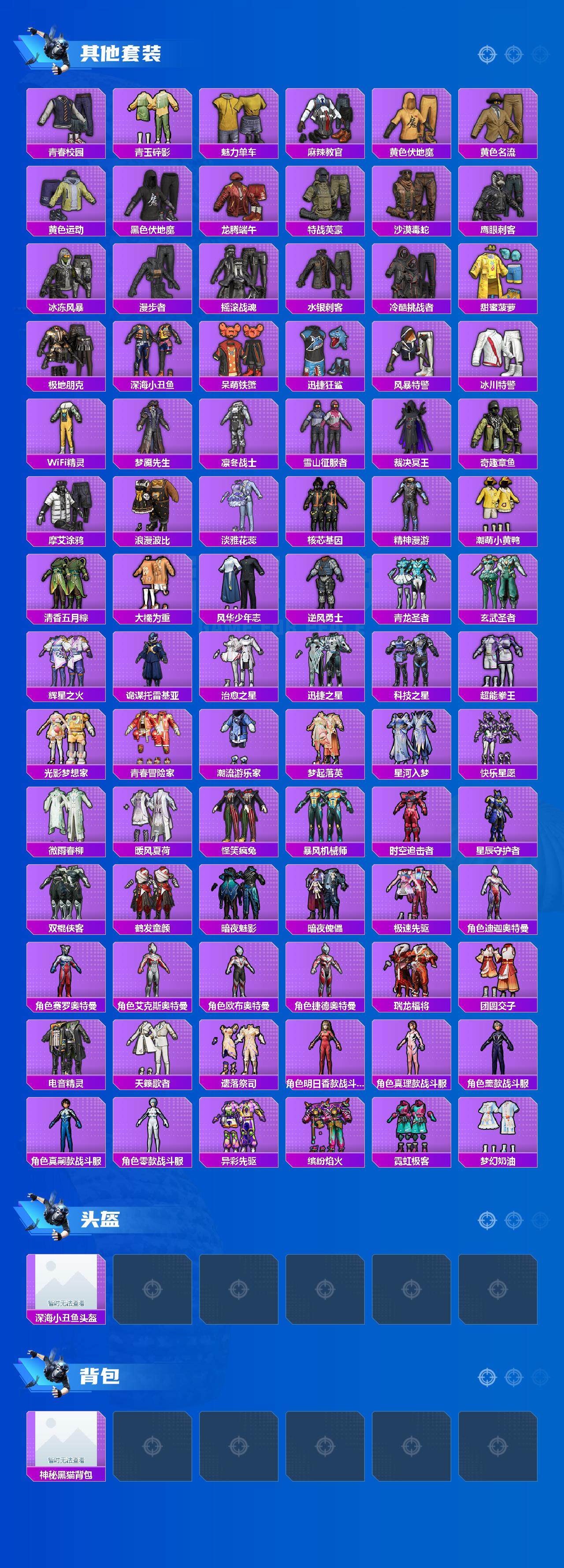 【粉色套装】:粉装-深海曼妙,粉装-深渊皇后,粉装-琉璃脉冲,粉装-苍蓝魅影,粉装-冰霜白皇,粉装-童趣迷兔,粉装-炙焰红王,粉装-炙焰赤龙,粉装-葫芦兄弟,粉装-铁血龙王,粉装-桀骜红莲,粉装-焰龙焚天,粉装-银龙傲海,粉装-骨龙祭渊,粉装-暗夜玫瑰,角色-闪耀迪迦,角色-赛罗闪耀型,粉装-彩虹鹿灵,粉装-山涧鹿灵,粉装-齐天大圣,角色-洛天依,粉装-沙场疾风,粉装-吟月归客,粉装-海渊国主,角色-零号机款机体服