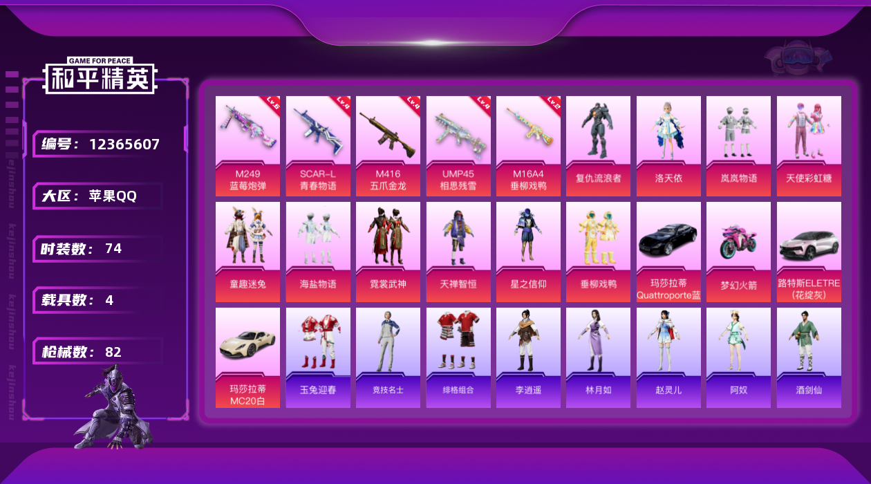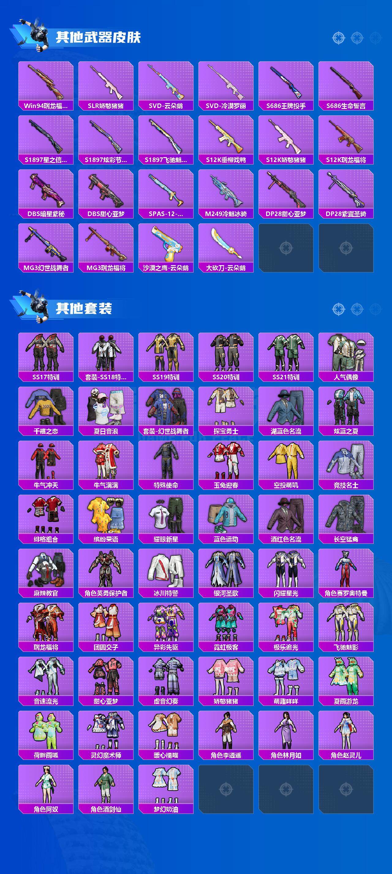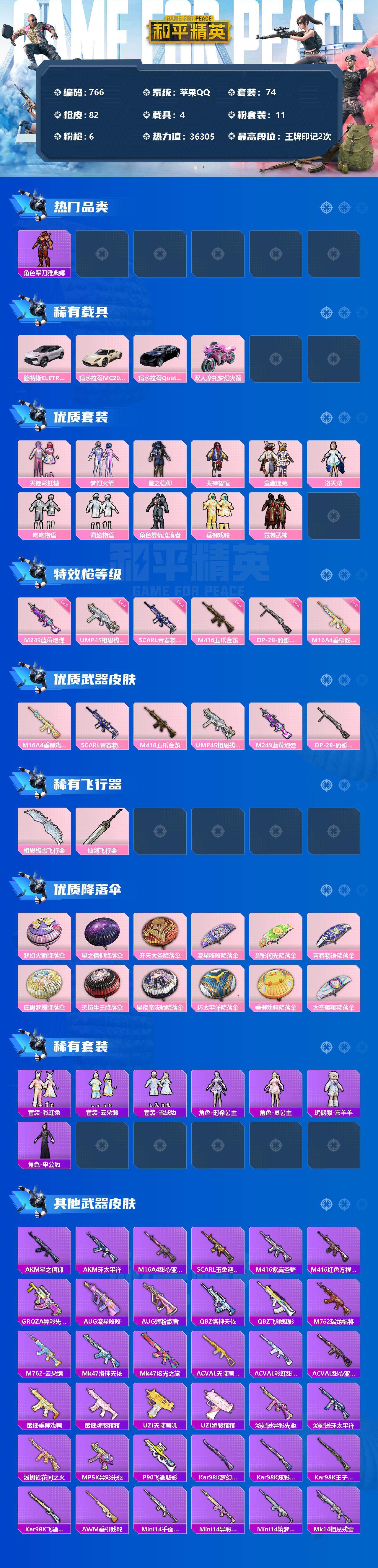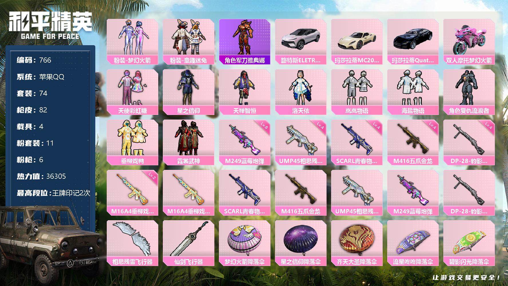 [12365607]【商品标题】:苹果 手Q-11粉装-6特效枪-4载具-2粉色飞行器-36305热力值-2王牌印记-74套装-82枪皮 【热门品类】:粉装-梦幻火箭,粉装-童趣迷兔,角色-军刀雅典娜 【粉色载具】:路特斯ELETRE(花绽灰),玛莎拉蒂MC20(星石白),玛莎拉蒂Quattroporte(夜幕蓝),双人摩托-梦幻火箭 【粉色套装】:粉装-天使彩虹糖,粉装-梦幻火箭,粉装-星之信仰,粉装-天禅智恒,粉装-童趣迷兔,角色-洛天依,粉装-岚岚物语,粉装-海盐物语,角色-复仇流浪者,粉装-垂柳戏鸭,粉装-霓裳武神 【粉色枪皮等级】:M16A4-垂柳戏鸭(二级),SCAR-L-青春物语(四级),M416-五爪金龙(四级),UMP45-相思残雪(四级),M249-蓝莓炮弹(六级),DP-28-豹影疾电(四级) 【粉色枪皮】:M16A4-垂柳戏鸭,SCAR-L-青春物语,M416-五爪金龙,UMP45-相思残雪,M249-蓝莓炮弹,DP-28-豹影疾电 【粉色飞行器】:相思残雪飞行器,仙剑飞行器 【粉色降落伞】:梦幻火箭降落伞,星之信仰降落伞,齐天大圣降落伞,流星咚咚降落伞,碧影闪光降落伞,青春物语降落伞,庄周梦蝶降落伞,炙焰牛王降落伞,星夜魔法师降落伞,环太平洋降落伞,垂柳戏鸭降落伞,太空嘟嘟降落伞 【稀有套装】:套装-彩虹兔,套装-云朵鹅,套装-雪绒豹,角色-时希公主,角色-灵公主,玩偶服-喜羊羊,角色-申公豹 【稀有枪皮】:AKM-星之信仰,AKM-环太平洋,M16A4-甜心亚梦,SCAR-L-玉兔迎春,M416-紫翼圣骑,M416-红色方程式,GROZA-异彩先驱,AUG-流星咚咚,AUG-耀粉歌者,QBZ-洛神天依,QBZ-飞驰魅影,M762-瑞龙福将,M762-云朵鹅,Mk47-洛神天依,Mk47-炫光之旅,AC-VAL-天降萌叽,AC-VAL-彩虹甜喵,AC-VAL-甜心亚梦,蜜獾-垂柳戏鸭,蜜獾-娇憨猪猪,UZI-天降萌叽,UZI-娇憨猪猪,汤姆逊-异彩先驱,汤姆逊-环太平洋,汤姆逊-花间之火,MP5K-异彩先驱,P90-飞驰魅影,Kar98K-梦幻火箭,Kar98K-炫彩节奏,Kar98K-王子的夏天,Kar98K-飞驰魅影,AWM-垂柳戏鸭,Mini14-千面幻镜,Mini14-异彩先驱,Mini14-筑梦精灵,Mk14-相思残雪,Win94-瑞龙福将,SLR
