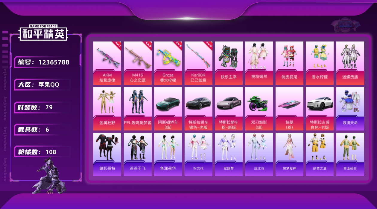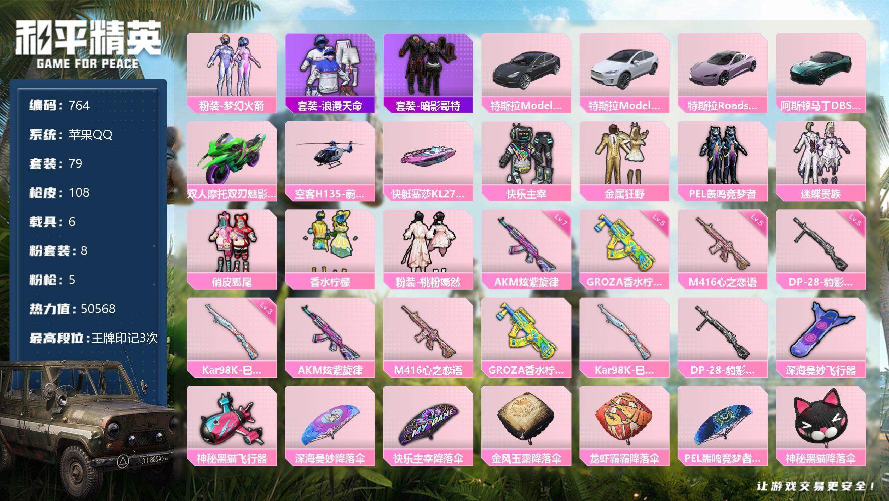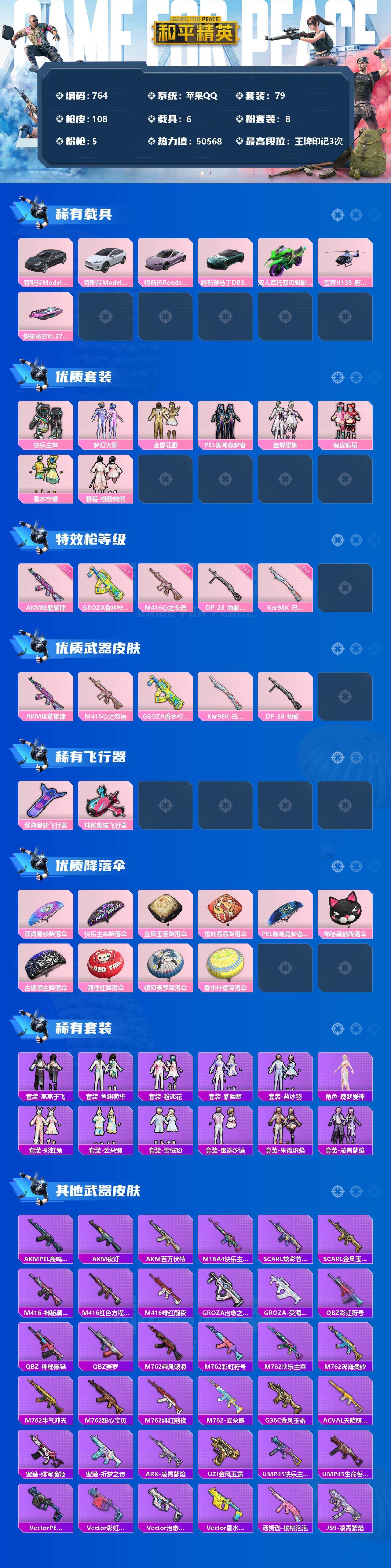 [12365788]【商品标题】:苹果 手Q-8粉装-5特效枪-6载具-2粉色飞行器-50568热力值-3王牌印记-79套装-108枪皮 【热门品类】:粉装-梦幻火箭,套装-浪漫天命,套装-暗影哥特 【粉色载具】:特斯拉Model 3(冷光银),特斯拉Model X(珍珠白),特斯拉Roadster(沁心粉),阿斯顿马丁DBS(绿),双人摩托-双刃魅影(绿),空客H135-蔚蓝之翼,快艇-塞莎KL27(霓虹粉) 【粉色套装】:粉装-快乐主宰,粉装-梦幻火箭,粉装-金属狂野,粉装-PEL轰鸣竞梦者,粉装-迷蝶贵族,粉装-俏皮狐尾,粉装-香水柠檬,粉装-桃粉嫣然 【粉色枪皮等级】:AKM-炫紫旋律(七级),M416-心之恋语(五级),GROZA-香水柠檬(五级),Kar98K-巳巳如意(三级),DP-28-豹影疾电(五级) 【粉色枪皮】:AKM-炫紫旋律,M416-心之恋语,GROZA-香水柠檬,Kar98K-巳巳如意,DP-28-豹影疾电 【粉色飞行器】:深海曼妙飞行器,神秘黑猫飞行器 【粉色降落伞】:深海曼妙降落伞,快乐主宰降落伞,金风玉露降落伞,龙虾霸霸降落伞,PEL轰鸣竞梦者降落伞,神秘黑猫降落伞,古堡领主降落伞,阿狸红降落伞,银刃赛罗降落伞,香水柠檬降落伞 【稀有套装】:套装-燕燕于飞,套装-鱼渊荷华,套装-粉恋花,套装-紫幽梦,套装-蓝冰羽,角色-瑰梦爱神,套装-彩虹兔,套装-云朵鹅,套装-雪绒豹,套装-蜜露汐语,套装-朱霞炽焰,套装-凌霄紫焰 【稀有枪皮】:AKM-PEL轰鸣竞梦者,AKM-夜灯,AKM-百万伏特,M16A4-快乐主宰,SCAR-L-炫彩节奏,SCAR-L-金风玉露,M416-神秘黑猫,M416-红色方程式,M416-绯红前夜,GROZA-治愈之星,GROZA-荧海星豚,QBZ-彩虹符号,QBZ-神秘黑猫,QBZ-赛罗,M762-乘风破浪,M762-彩虹符号,M762-快乐主宰,M762-深海曼妙,M762-牛气冲天,M762-甜心宝贝,M762-绯红前夜,M762-云朵鹅,G36C-金风玉露,AC-VAL-天降萌叽,蜜獾-绯穹魔姬,蜜獾-折梦之诗,ARX-凌霄紫焰,UZI-金风玉露,UMP45-快乐主宰,UMP45-生命誓言,Vector-PEL轰鸣竞梦者,Vector-彩虹符号,Vector-治愈之星,Vector-香水柠檬,汤姆逊-樱桃泡泡,JS9-凌