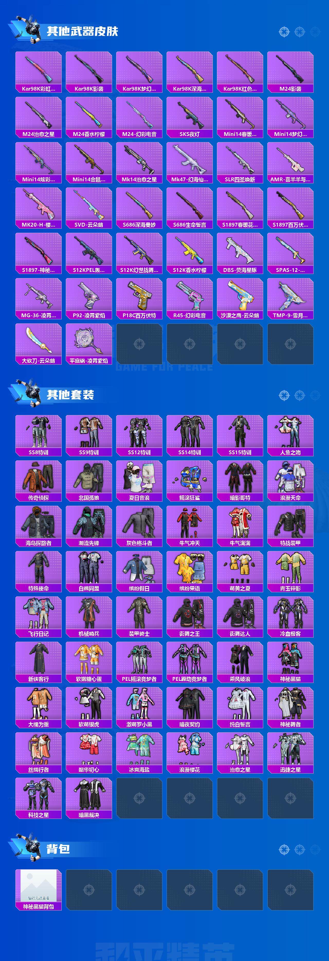 - PX_2108566-?? 星星裤 双马尾 哥特】 YXc12516【可二次】【因赛季更新游戏段付以上号为准!】苹果Q-4w热力值 8王牌印记 历史卓越王牌19星 131套装 141枪皮 【3稀有】 AKM-缤纷海域 浪漫天命 天网终结者 【4粉装】羊梦糖心 荧海星豚 星际漫游者 幻影战神 【4特效枪】 SCAR-L-锦绣绵绵 (5级) AKM-绿萝繁花 (5级) Kar98K-巳巳如意 (5级)