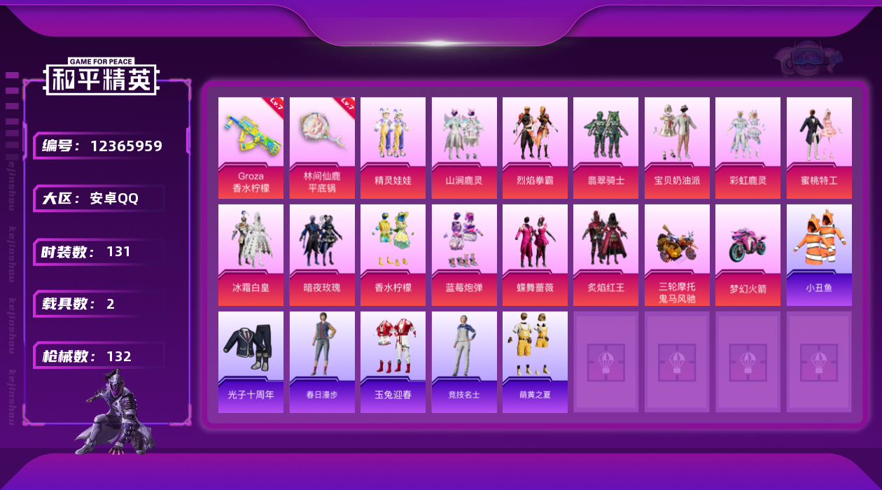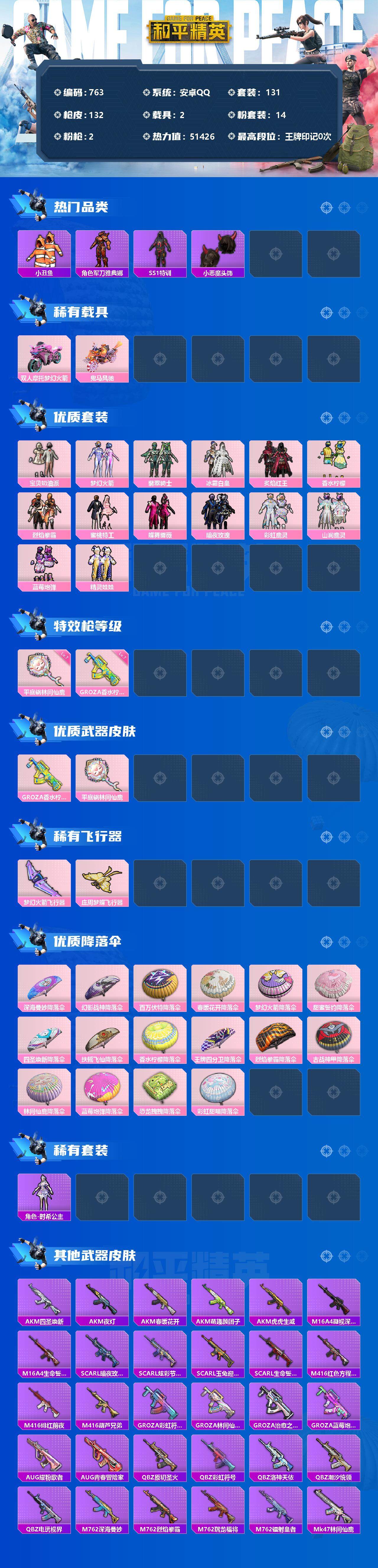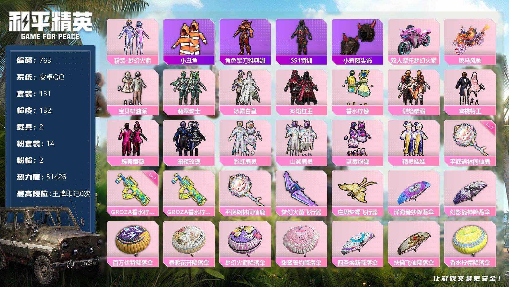 [12365959]【商品标题】:安卓 手Q-14粉装-2特效枪-2载具-2粉色飞行器-51426热力值-1王牌印记-131套装-132枪皮