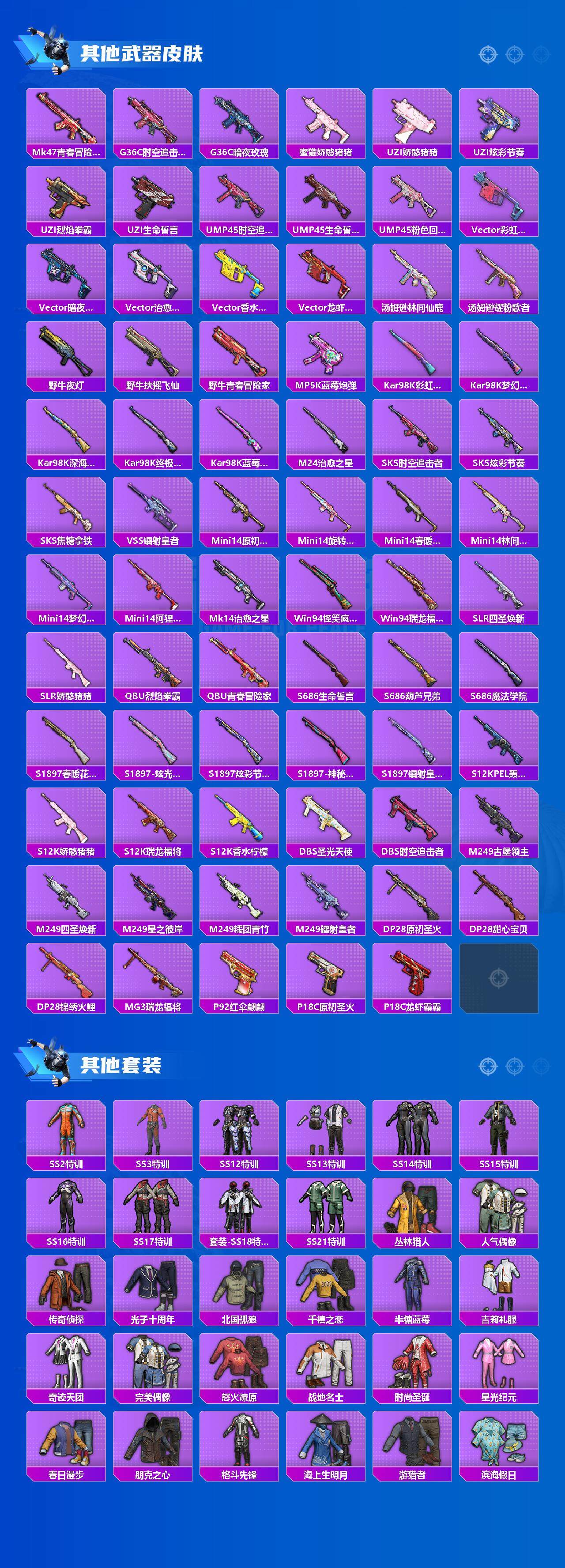 【稀有枪皮】:AKM-四圣焕新,AKM-夜灯,AKM-春暖花开,AKM-萌趣颜团子,AKM-虎虎生威,M16A4-凝视深渊,M16A4-生命誓言,SCAR-L-暗夜玫瑰,SCAR-L-炫彩节奏,SCAR-L-玉兔迎春,SCAR-L-生命誓言,M416-红色方程式,M416-绯红前夜,M416-葫芦兄弟,GROZA-彩虹符号,GROZA-林间仙鹿,GROZA-治愈之星,GROZA-蓝莓炮弹,AUG-耀粉歌者,AUG-青春冒险家,QBZ-原初圣火,QBZ-彩虹符号,QBZ-洛神天依,QBZ-潮汐统领,QBZ-电玩视界,M762-深海曼妙,M762-烈焰拳霸,M762-瑞龙福将,M762-镭射皇者,Mk47-林间仙鹿,Mk47-青春冒险家,G36C-时空追击者,G36C-暗夜玫瑰,蜜獾-娇憨猪猪,UZI-娇憨猪猪,UZI-炫彩节奏,UZI-烈焰拳霸,UZI-生命誓言,UMP45-时空追击者,UMP45-生命誓言,UMP45-粉色回忆,Vector-彩虹符号,Vector-暗夜玫瑰,Vector-治愈之星,Vector-香水柠檬,Vector-龙虾霸霸,汤姆逊-林间仙鹿,汤姆逊-耀粉歌者,野牛-夜灯,野牛-扶摇飞