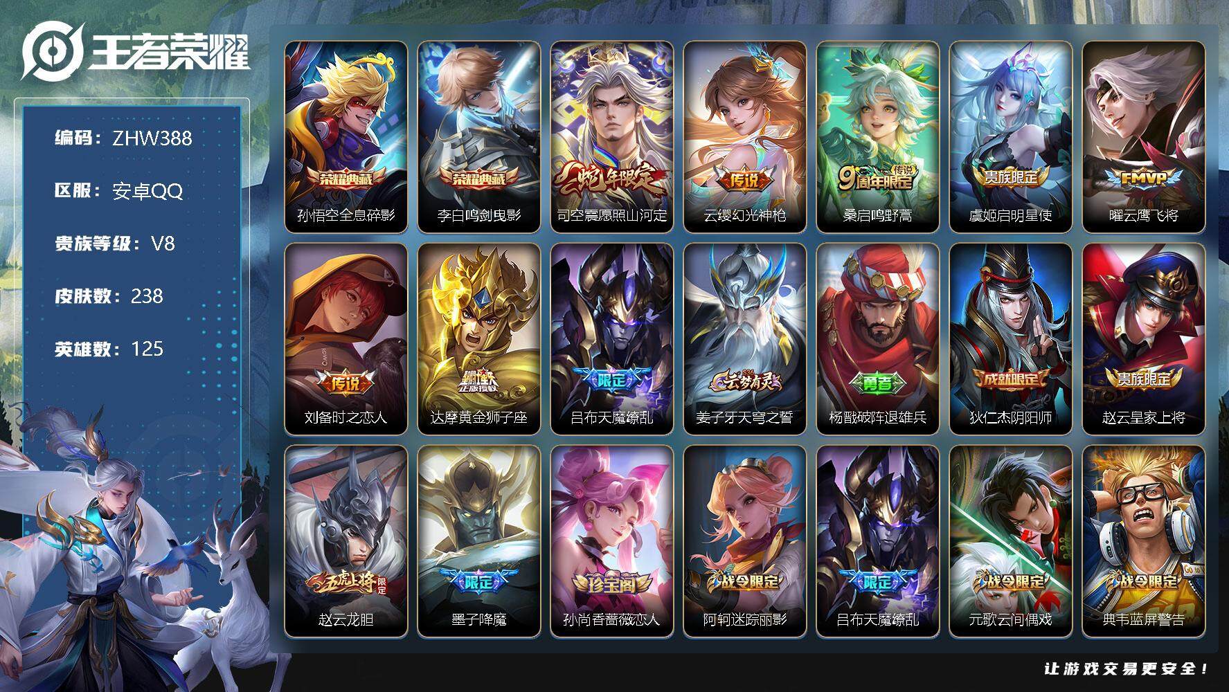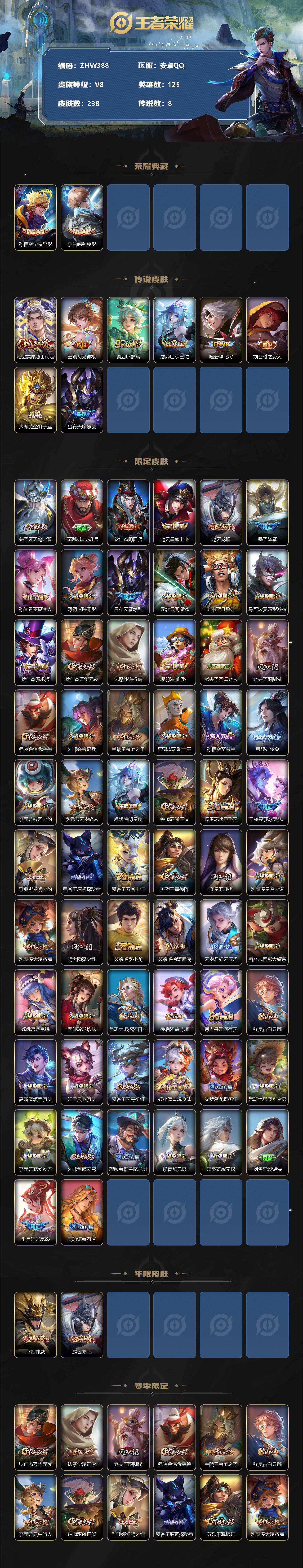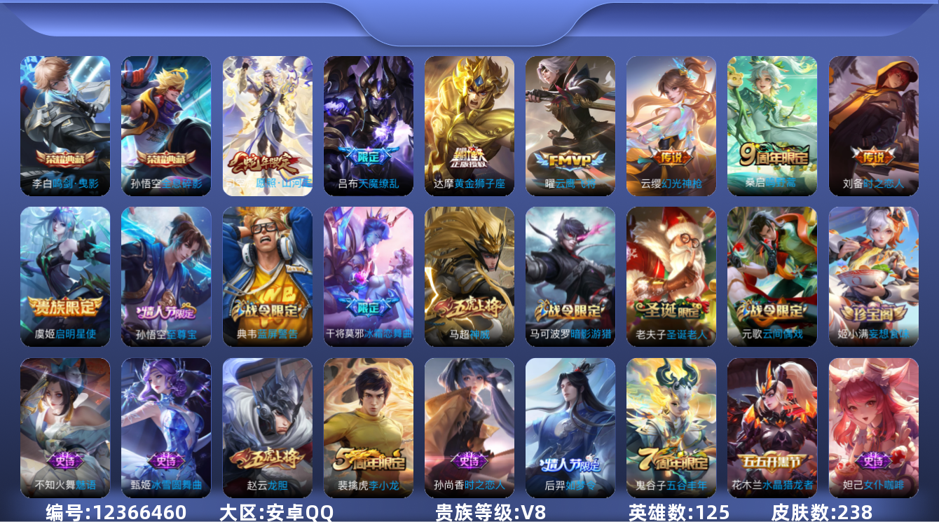 [12366460]【特价急出/详情看图】:安卓Q-V8-最强王者段位-125英雄-238皮肤-2典藏-8传说-66史诗
