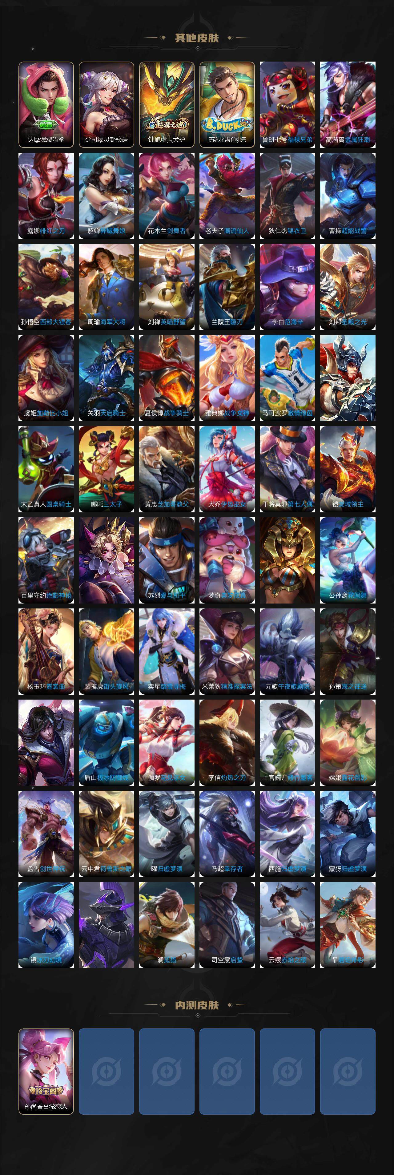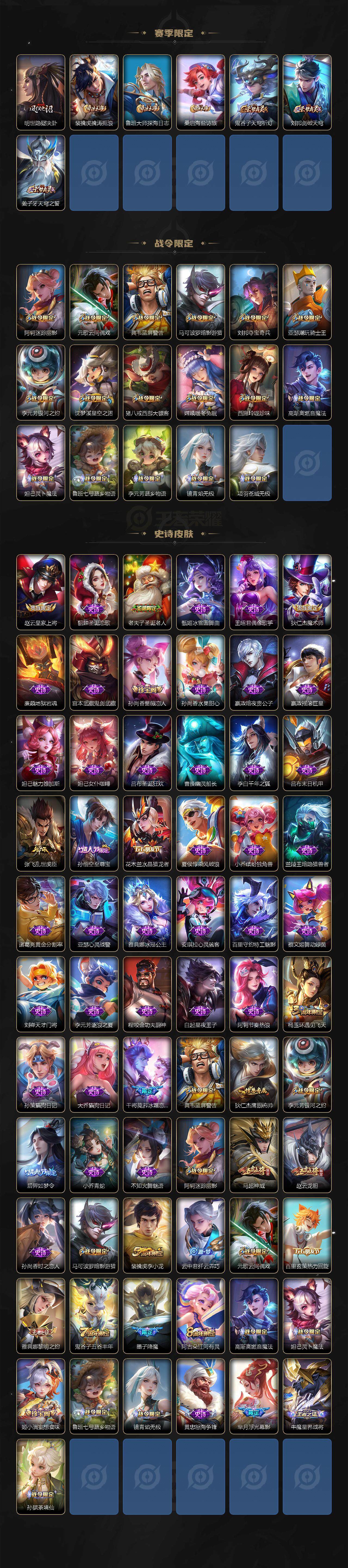 【赛季限定】:狄仁杰万华元夜,达摩沙漠行僧,老夫子醍醐杖,程咬金演武夺筹,兰陵王金庭之子,张良古海寻踪,李元芳云中旅人,钟馗驱傩正仪,雅典娜黎明之约,鬼谷子原初探秘者,苏烈千军破阵,弈星混沌棋,沈梦溪大漠名商,明世隐疑决卦,裴擒虎擒涛扼浪,鲁班大师探海日志,桑启海盐诗旅,鬼谷子天穹祈灯,刘邦剑破天穹,姜子牙天穹之誓