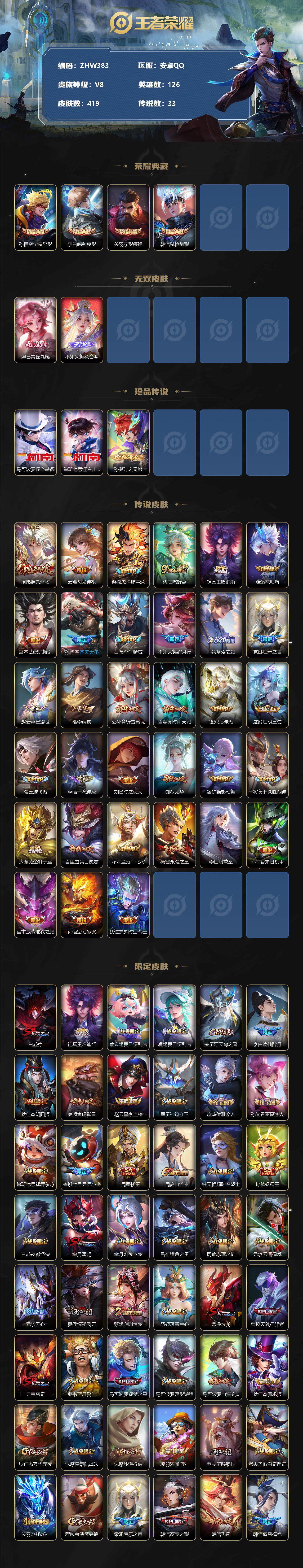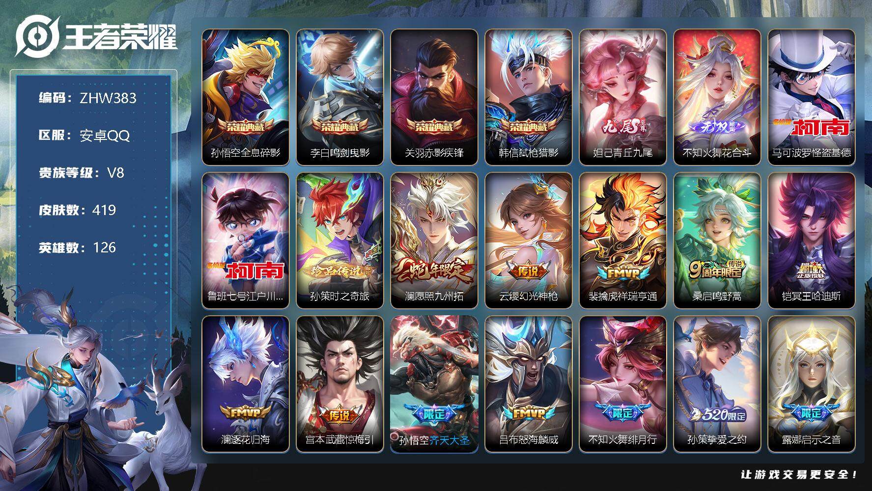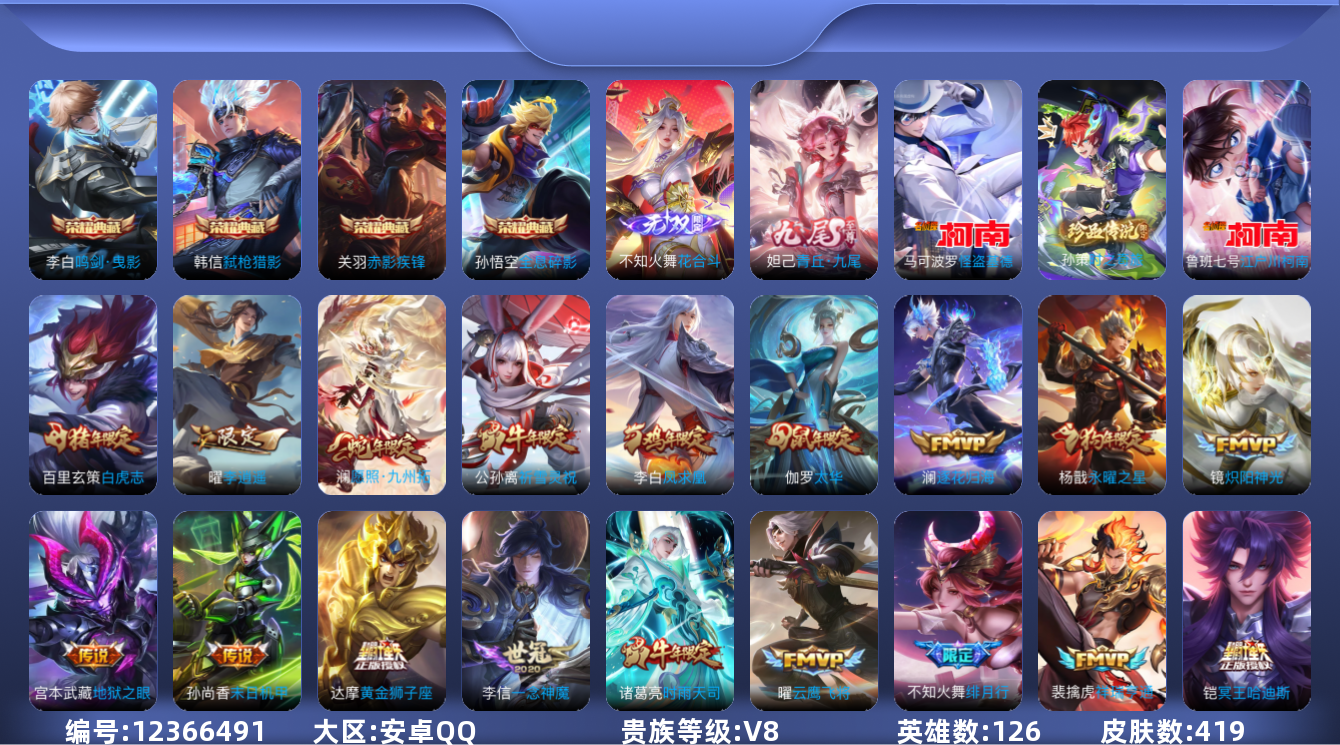 [12366491]【特价急出/详情看图】:安卓Q-V8-最强王者段位-126英雄-419皮肤-4典藏-2无双-3珍品传说-33传说-133史诗