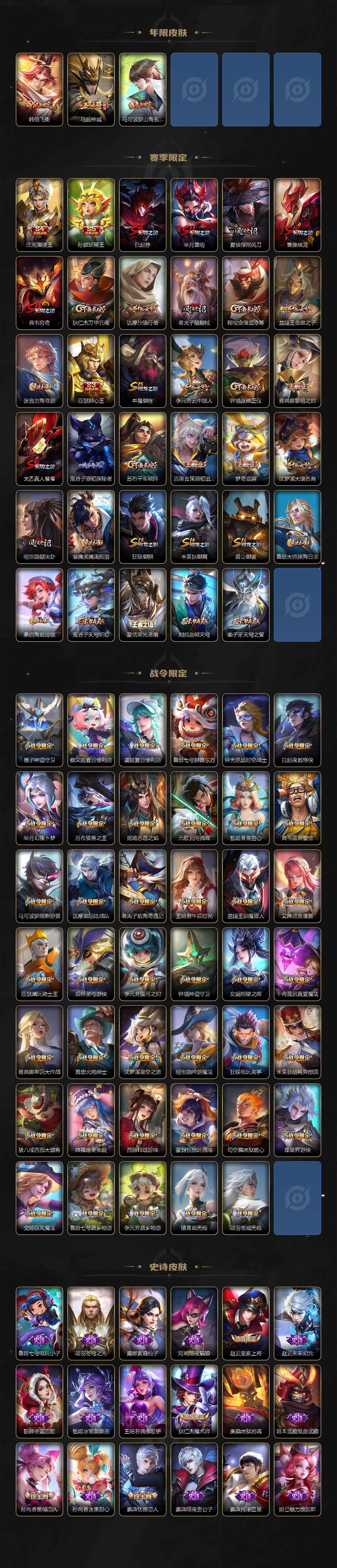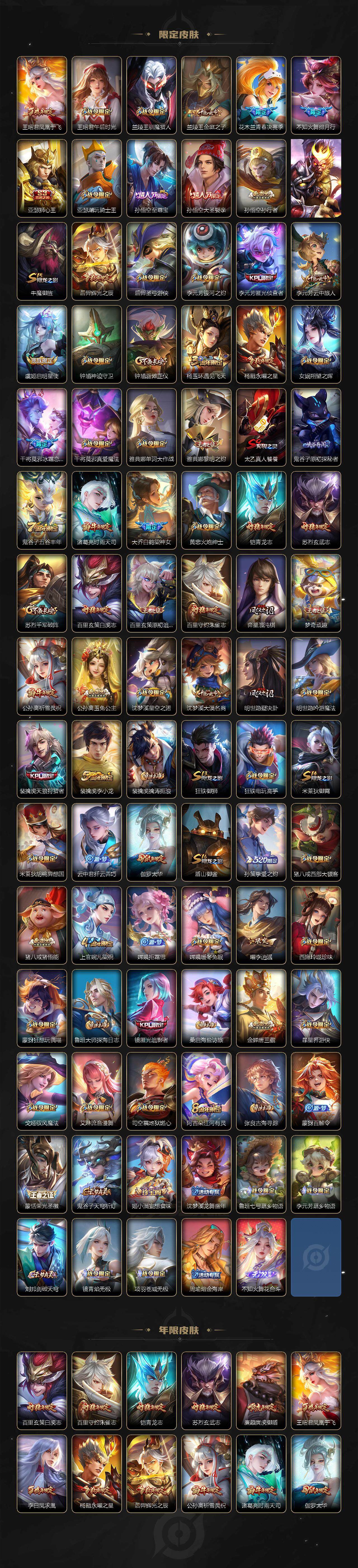 【限定皮肤】:白起狰,铠冥王哈迪斯,蔡文姬夏日便利店,虞姬夏日便利店,姜子牙天穹之誓,李白谪仙醉月,狄仁杰阴阳师,廉颇寅虎御盾,赵云皇家上将,墨子神迹守卫,嬴政优雅恋人,孙尚香蔷薇恋人,鲁班七号狮舞东方,鲁班七号乒乒小将,庄周蜃楼王,庄周高山流水,钟无艳超时空战士,孙膑妖精王,白起夜都怪侠,芈月重明,芈月幻夜卜梦,吕布猎兽之王,周瑜赤莲之焰,元歌云间偶戏,元歌无心,夏侯惇朔风刀,甄姬游园惊梦,甄姬落雪兰心,曹操烛龙,曹操天狼征服者,典韦穷奇,典韦蓝屏警告,马可波罗逐梦之星,马可波罗暗影游猎,马可波罗山海玄木吟,狄仁杰魔术师,狄仁杰万华元夜,达摩星际陆战队,达摩沙漠行僧,项羽海滩派对,老夫子醍醐杖,老夫子航海奇遇记,关羽冰锋战神,程咬金演武夺筹,露娜启示之音,韩信逐梦之影,韩信飞衡,韩信傲雪梅枪,王昭君凤凰于飞,王昭君午后时光,兰陵王驯魔猎人,兰陵王金庭之子,花木兰青春决赛季,不知火舞绯月行,亚瑟狮心王,亚瑟潮玩骑士王,孙悟空至尊宝,孙悟空大圣娶亲,孙悟空孙行者,孙悟空齐天大圣,牛魔御旌,后羿辉光之辰,后羿圣弓游侠,李元芳银河之约,李元芳匿光侦查者,李元芳云中旅人,虞姬启明星使,钟馗神迹守卫,钟馗驱傩正仪,杨玉环遇见飞天,杨戬永曜之星,女娲朔望之晖,干将莫邪冰霜恋