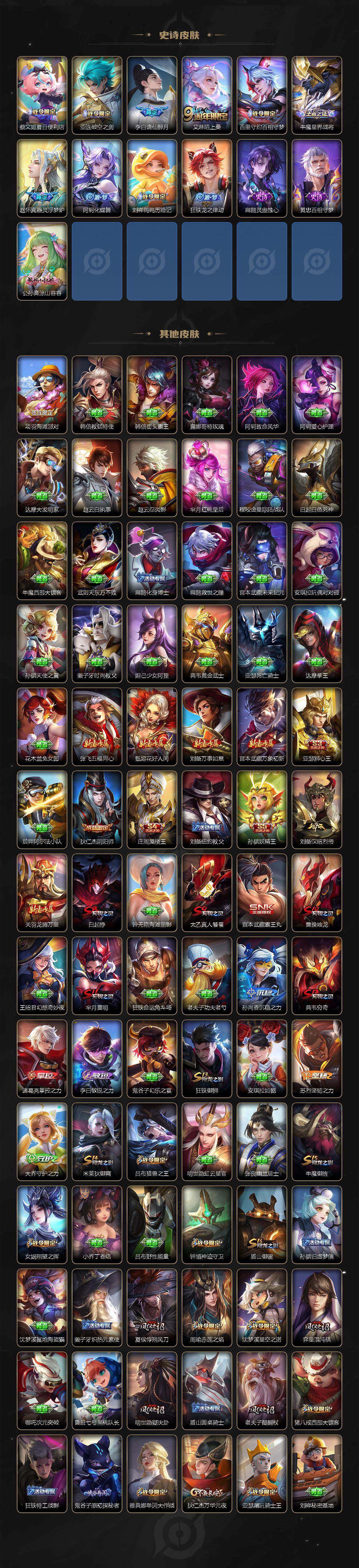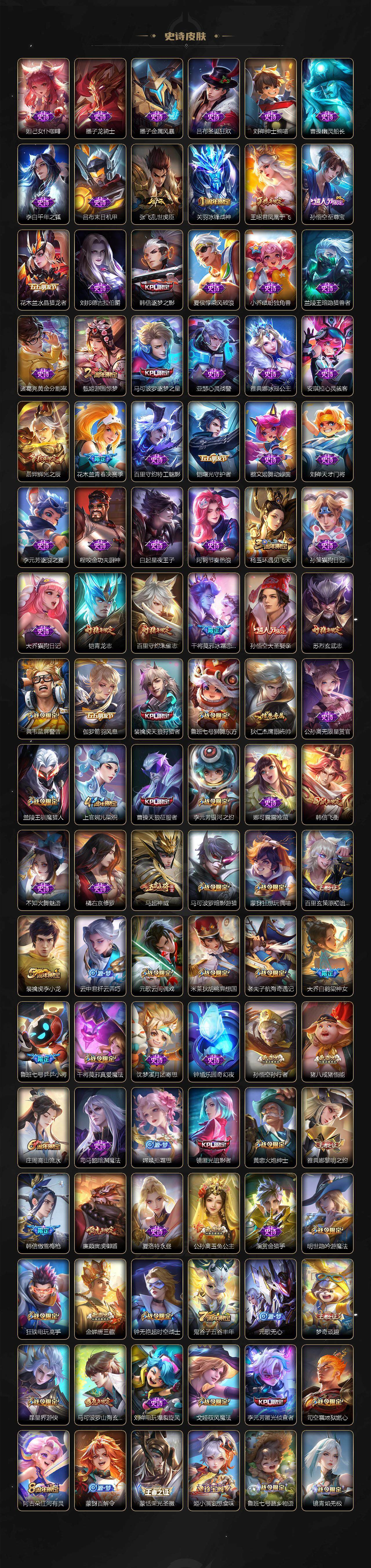 亚瑟狮心王,庄周蜃楼王,孙膑妖精王,白起狰,太乙真人饕餮,曹操烛龙,芈月重明,典韦穷奇,狂铁御狮,米莱狄御霄,牛魔御旌,盾山御銮,夏侯惇朔风刀,明世隐疑决卦,老夫子醍醐杖,鬼谷子原初探秘者,狄仁杰万华元夜,程咬金演武夺筹,钟馗驱傩正仪,苏烈千军破阵,吕布猎兽之王,女娲朔望之晖,典韦蓝屏警告,钟馗神迹守卫,鲁班七号狮舞东方,沈梦溪星空之诺,李元芳银河之约,马可波罗暗影游猎,蒙犽狂想玩偶喵,元歌云间偶戏,弈星混沌棋,达摩沙漠行僧,兰陵王金庭之子,沈梦溪大漠名商,李元芳云中旅人,桑启海盐诗旅,裴擒虎擒涛扼浪,鲁班大师探海日志,张良古海寻踪,项羽苍威无极,镜青焰无极