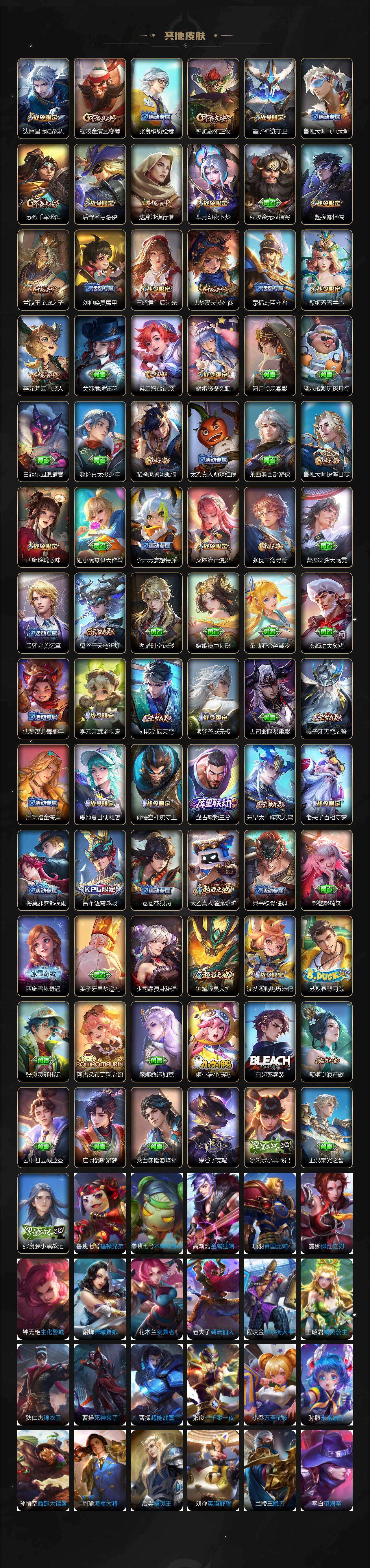 娜可露露晚萤,伽罗箭羽风息,李元芳逐浪之夏,不知火舞魅语,公孙离无限星赏官,大乔猫狗日记,孙策猫狗日记,阿轲节奏热浪,露娜紫霞仙子,诸葛亮黄金分割率,王昭君偶像歌手,项羽苍穹之光,阿轲暗夜猫娘,雅典娜冰冠公主,吕布末日机甲,鲁班七号电玩小子,橘右京修罗,墨子龙骑士,嬴政摇滚巨星,刘禅绅士熊喵,刘禅天才门将,白起星夜王子,安琪拉心灵骇客,程咬金功夫厨神,刘邦德古拉伯爵,兰陵王暗隐猎兽者,曹操幽灵船长,宫本武藏鬼剑武藏,司马懿暗渊魔法,亚瑟心灵战警,钟馗乐园奇幻夜,蔡文姬舞动绿茵,廉颇地狱岩魂,小乔缤纷独角兽,夏侯惇乘风破浪,花木兰水晶猎龙者,铠曙光守护者,墨子金属风暴,百里玄策原初追逐者,吕布圣诞狂欢,貂蝉圣诞恋歌,百里守约特工魅影,嬴政暗夜贵公子,嫦娥拒霜思,雅典娜黎明之约,李白千年之狐,夏洛特永昼,澜赏金猎手,刘禅电玩·爆裂旋风,李元芳匿光侦查者,蒙犽百解令,李白谪仙醉月,赵怀真器灵·浮梦炉