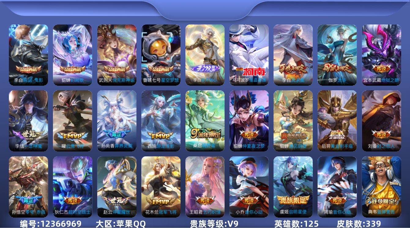 [12366969]【商品标题】:苹果Q-V9-至尊星耀III段位-125英雄-339皮肤-4典藏-0珍品无双-1无双-1珍品传说-20传说-91史诗