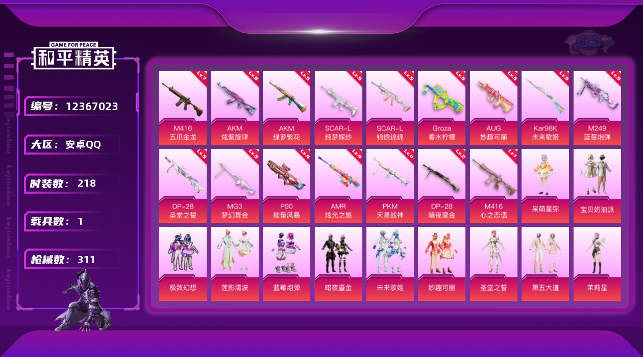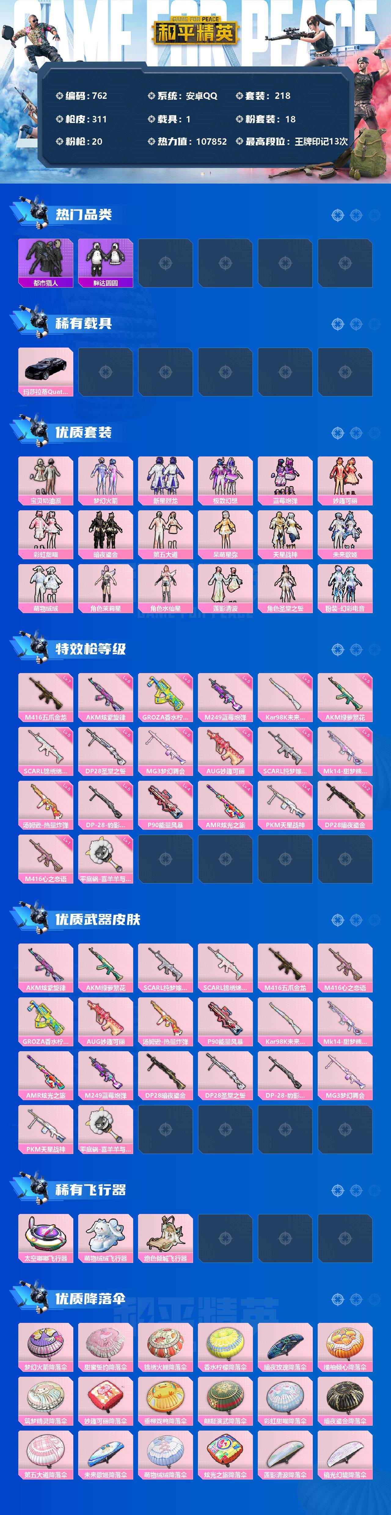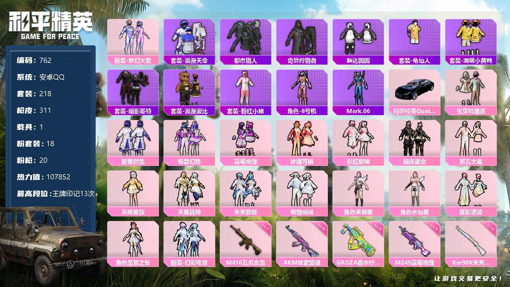 [12367023]【商品标题】:安卓 手Q-18粉装-20特效枪-1载具-3粉色飞行器-107852热力值-13王牌印记-218套装-311枪皮