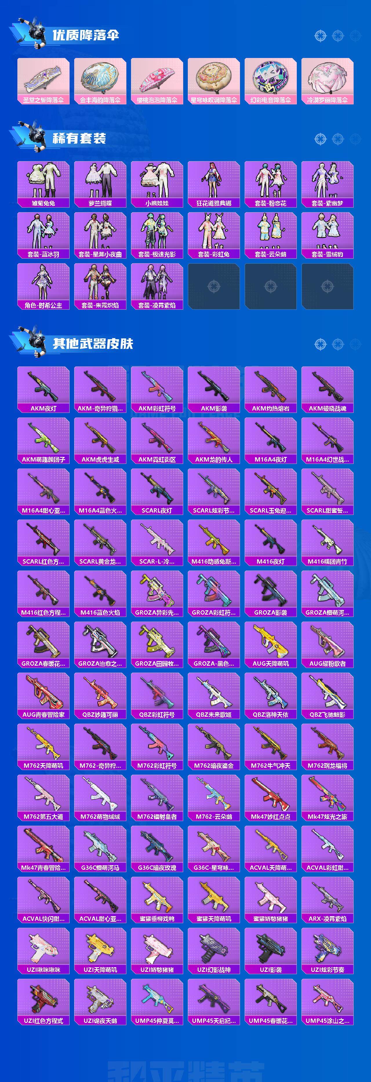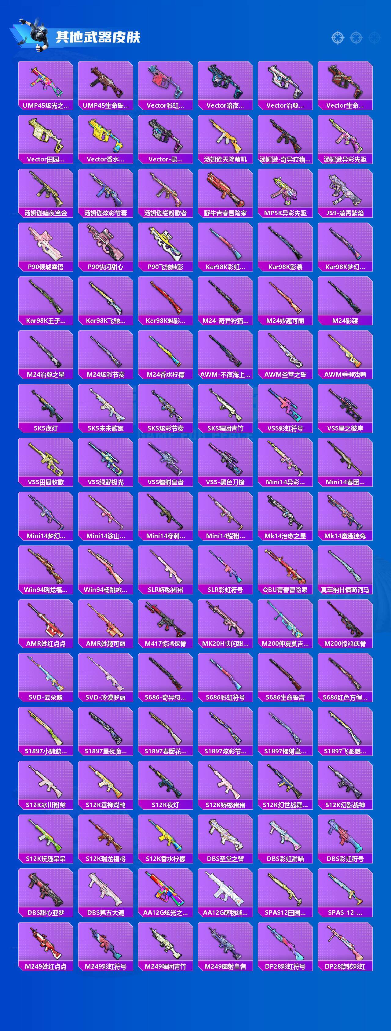 AKM-炫紫旋律,AKM-绿萝繁花,SCAR-L-纯梦嫁纱,M416-五爪金龙,M416-心之恋语,GROZA-香水柠檬,AUG-妙趣可丽,P90-能量风暴,Kar98K-未来歌姬,AMR-炫光之旅,M249-蓝莓炮弹,DP-28-暗夜鎏金,DP-28-圣堂之誓,MG3-梦幻舞会,PKM-天星战神
