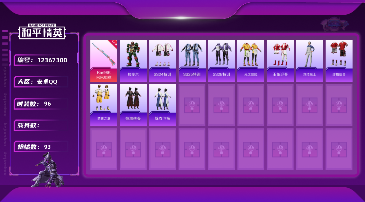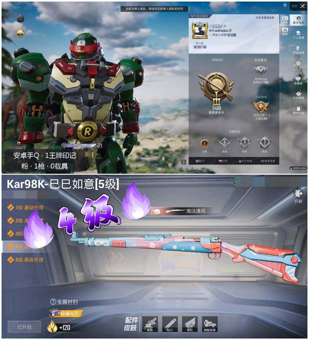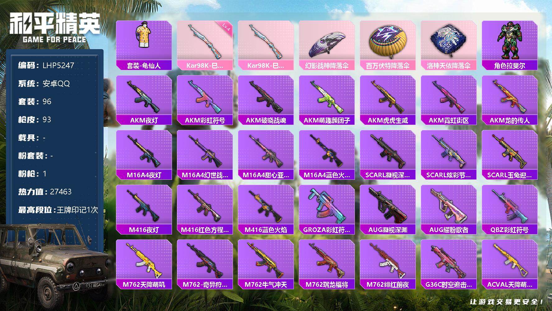 [12367300]【特价急出/详情看图】:安卓 手Q-1特效枪-2.7w热力值-1王牌印记-96套装-93枪皮【热门品类】:套装-龟仙人【粉色枪皮等级】:Kar98K-巳巳如意(四级)