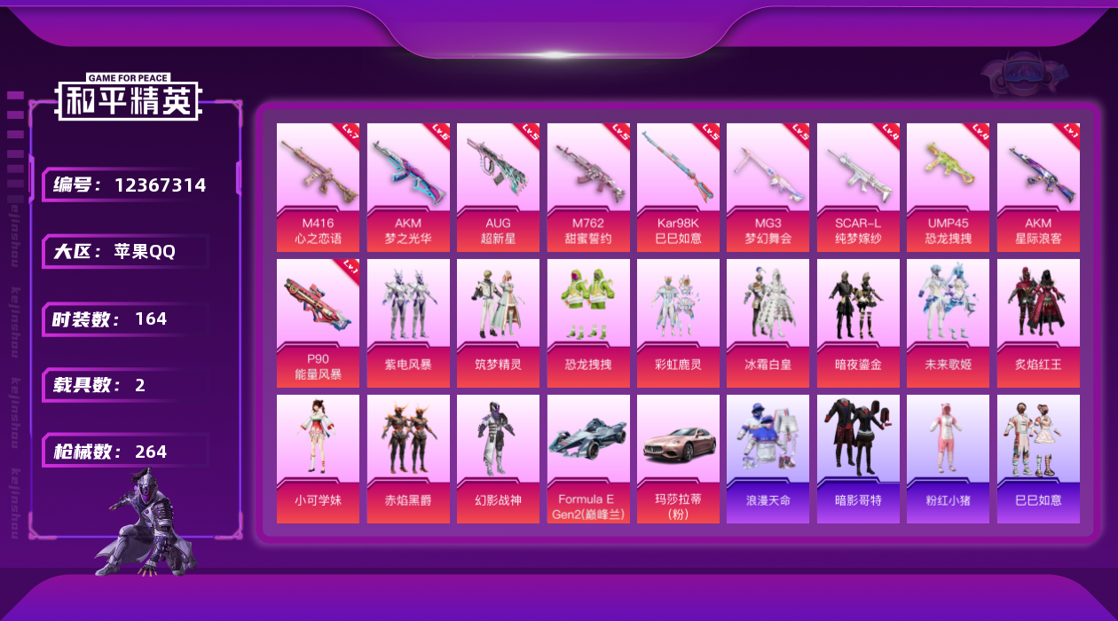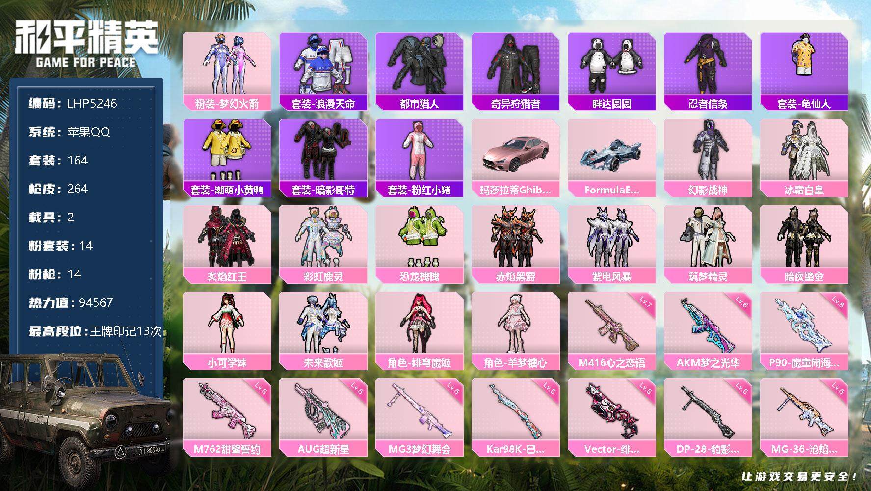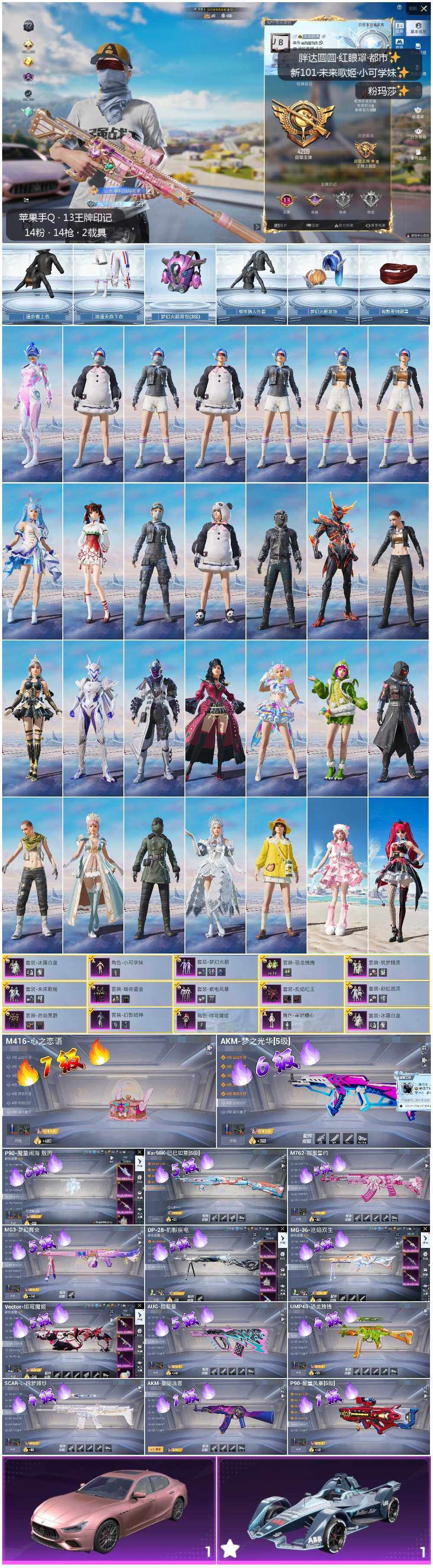 [12367314]素材身法号【特价急出/详情看图】:苹果 手Q-14粉装-14特效枪-2载具-6粉色飞行器-9.4w热力值-13王牌印记-164套装-264枪皮【热门品类】:粉装-梦幻火箭,套装-浪漫天命,套装-都市猎人,套装-奇异狩猎者,套装-胖达圆圆,套装-忍者信条,套装-龟仙人,套装-潮萌小黄鸭,套装-暗影哥特,套装-粉红小猪【粉色载具】:玛莎拉蒂Ghibli(粉),Formula E Gen2(巅峰兰)【粉色套装】:粉装-幻影战神,粉装-梦幻火箭,粉装-冰霜白皇,粉装-炙焰红王,粉装-彩虹鹿灵,粉装-恐龙拽拽,粉装-赤焰黑爵,粉装-紫电风暴,粉装-筑梦精灵,粉装-暗夜鎏金,角色-小可学妹,粉装-未来歌姬,角色-绯穹魔姬,角色-羊梦糖心【粉色枪皮等级】:AKM-梦之光华(六级),AKM-星际浪客(一级),SCAR-L-纯梦嫁纱(四级),M416-心之恋语(七级),AUG-超新星(五级),M762-甜蜜誓约(五级),UMP45-恐龙拽拽(四级),Vector-绯穹魔姬(五级),P90-能量风暴(一级),P90-魔童闹海 敖丙(六级),Kar98K-巳巳如意(五级),DP-28-豹影疾电(五级),MG3-梦幻舞会(五级),MG-36-沧焰双生(五级)【粉色飞行器】:幻梦音符飞行器,纯梦嫁纱飞行翼,灵猫魔法师飞行器,飞天猪飞行器,灵珠游龙飞行器
