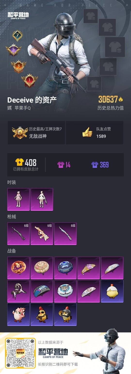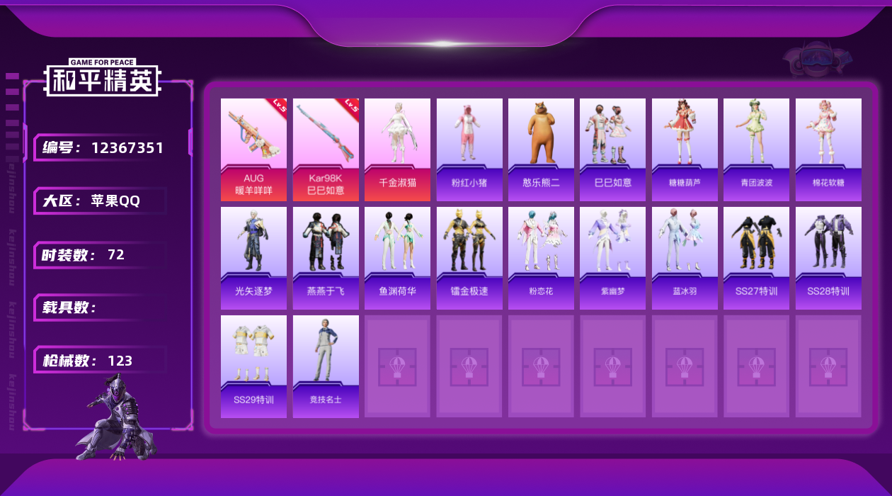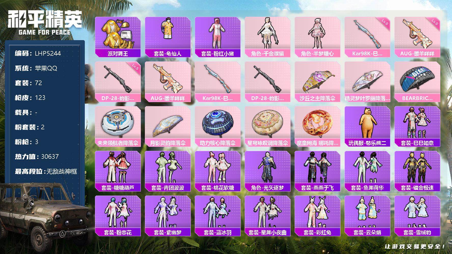 [12367351]无敌战神框3/绝世印记1【特价急出/详情看图】:苹果 手Q-无敌战神框-2粉装-3特效枪-1粉色飞行器-3w热力值-7王牌印记-72套装-123枪皮【热门品类】:套装-派对舞王,套装-龟仙人,套装-粉红小猪【粉色套装】:角色-千金淑猫,角色-羊梦糖心【粉色枪皮等级】:AUG-暖羊咩咩(五级),Kar98K-巳巳如意(五级),DP-28-豹影疾电(五级)