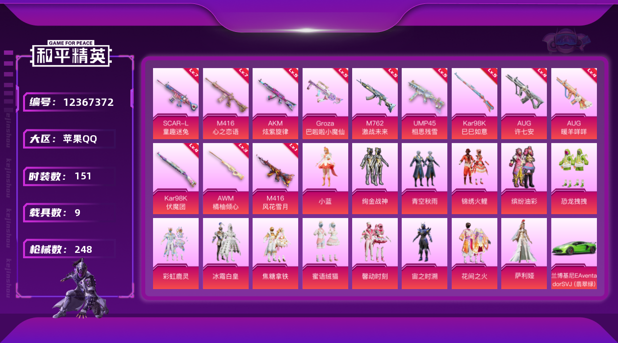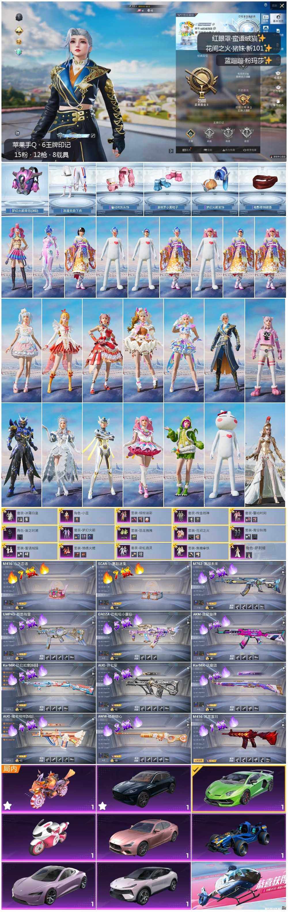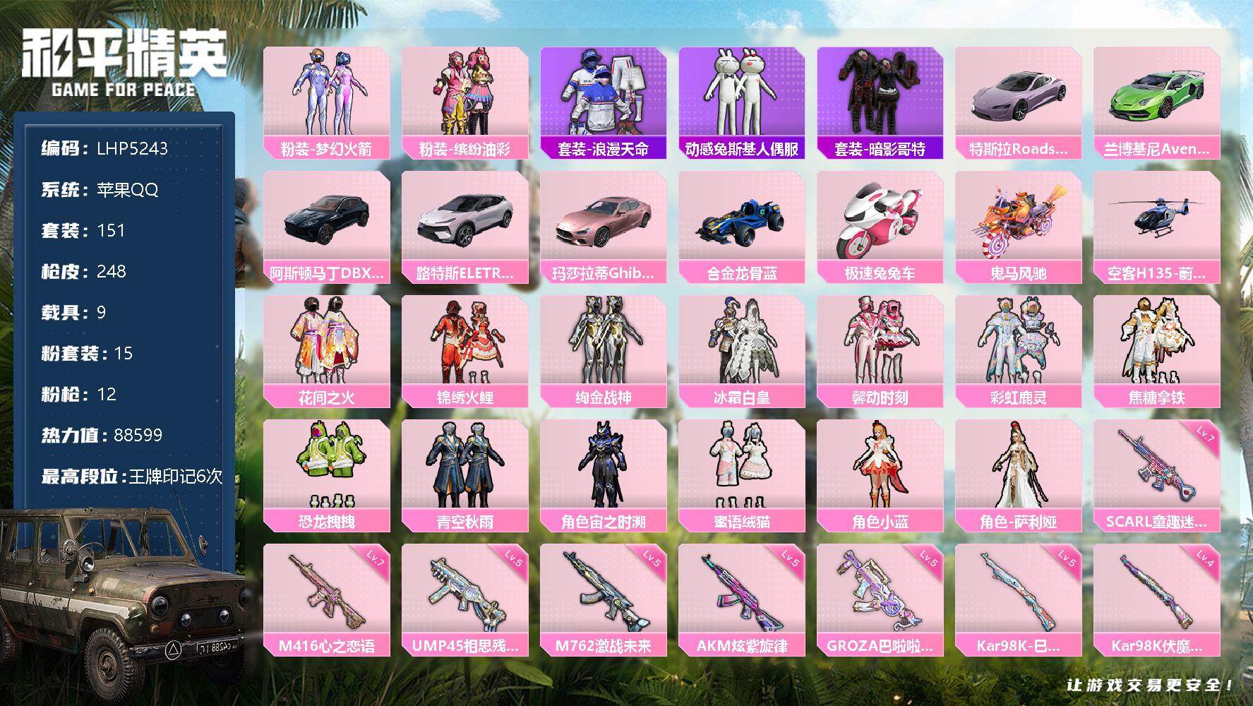 [12367372]素材身法号【特价急出/详情看图】:苹果 手Q-15粉装-12特效枪-9载具-3粉色飞行器-8.8w热力值-6王牌印记-151套装-248枪皮【热门品类】:粉装-梦幻火箭,粉装-缤纷油彩,套装-浪漫天命,套装-动感兔斯基人偶服,套装-暗影哥特【粉色载具】:特斯拉Roadster(沁心粉),兰博基尼Aventador SVJ(翡翠绿),阿斯顿马丁DBX(蓝),路特斯ELETRE(花绽灰),玛莎拉蒂Ghibli(粉),合金龙骨(蓝),极速兔兔车,鬼马风驰,空客H135-蔚蓝之翼【粉色套装】:粉装-梦幻火箭,粉装-缤纷油彩,粉装-花间之火,粉装-锦绣火鲤,粉装-绚金战神,粉装-冰霜白皇,粉装-馨动时刻,粉装-彩虹鹿灵,粉装-焦糖拿铁,粉装-恐龙拽拽,粉装-青空秋雨,角色-宙之时溯,粉装-蜜语绒猫,角色-小蓝,角色-萨利娅【粉色枪皮等级】:AKM-炫紫旋律(五级),SCAR-L-童趣迷兔(七级),M416-心之恋语(七级),M416-风花雪月(一级),GROZA-巴啦啦小魔仙(五级),AUG-许七安(四级),AUG-暖羊咩咩(四级),M762-激战未来(五级),UMP45-相思残雪(五级),Kar98K-伏魔团(四级),Kar98K-巳巳如意(五级),AWM-橘柚倾心(三级)【粉色飞行器】:梦幻火箭飞行器,潮汐统领飞行器,星之彼岸飞行器