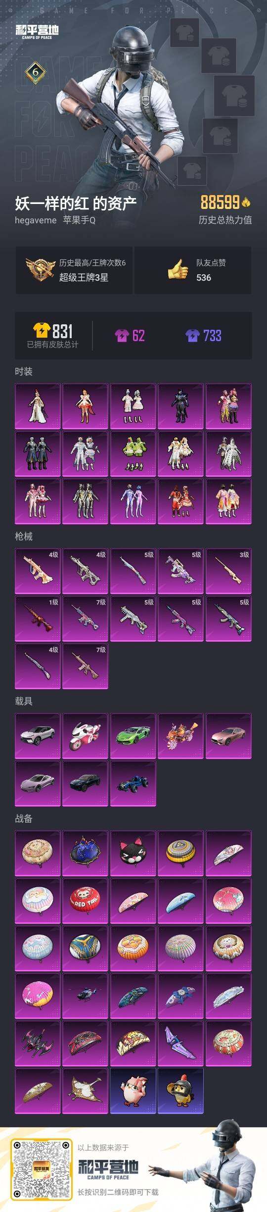 - [11401815]【商品标题】:安卓 手Q-8粉装-4特效枪-5载具-60320热力值-3印记-129套装-168枪皮 【稀有载具】:玛莎拉蒂MC20(星石白),玛莎拉蒂Quattroporte(夜幕蓝),玛莎拉蒂Grecale(薄荷绿),海龙奔腾,极速兔兔车,僚机-萌兔起飞 【特效枪等级】:M416-五爪金龙(七级),GROZA-旋转彩虹(七级),Kar98K-巳巳如意(五级),AMR-智耀战神(五级) 【优质套装】:粉装-霓裳武神,粉装-朗月武圣,粉装-旋转彩虹,粉装-冰川粉黛,粉装-冰川幽秘,粉装-冰川红玫,粉装-桃夭倾城,粉装-暗夜鎏金 【稀有套装】:套装-龟仙人,套装-粉恋花,套装-紫幽梦,套装-蓝冰羽,套装-极速光影,套装-雪绒豹 【优质武器皮肤】:M416-五爪金龙,GROZA-旋转彩虹,Kar98K-巳巳如意,AMR-智耀战神 【稀有武器皮肤】:AKM-墨染幽兰,AKM-夜灯,AKM-彩虹符号,AKM-影袭,AKM-灼热熔岩,AKM-破晓战魂,AKM-霓虹街区,M16A4-幻世战舞者,M16A4-红色方程式,SCAR-L-炫彩节奏,SCAR-L-玉兔迎春,SCAR-L-红色方程式,M416-暗夜行者,M416-糯团青竹,M416-红色方程式,M416-蓝色火焰,GROZA-异彩先驱,GROZA-影袭,GROZA-懵萌河马,GROZA-田园牧歌,AUG-冰川粉黛,AUG-海螺星光,AUG-耀粉歌者,QBZ-彩虹符号,QBZ-赛罗,QBZ-飞驰魅影,M762-天降萌叽,M762-彩虹符号,M762-暗夜鎏金,M762-牛气冲天,M762-瑞龙福将,Mk47-妙红点点,G36C-懵萌河马,AC-VAL-天降萌叽,蜜獾-天降萌叽,蜜獾-娇憨猪猪,蜜獾-桃夭倾城,UZI-墨染幽兰,UZI-天降萌叽,UZI-娇憨猪猪,UZI-影袭,UZI-红色方程式,UMP45-夜灯,UMP45-涂山之恋,UMP45-生命誓言,UMP45-蓝色火焰,Vector-彩虹符号,Vector-生命誓言,Vector-田园牧歌,Vector-音爆索尼克,Vector-魅影蝠王,汤姆逊-异彩先驱,汤姆逊-炫彩节奏,汤姆逊-智耀战神,野牛-桃夭倾城,MP5K-异彩先驱,P90-快闪甜心,P90-翩跹演武,P90-飞驰魅影,Kar98K-影袭,Kar98K-梦幻火箭,Kar98K-炫彩节奏,Kar98K-红