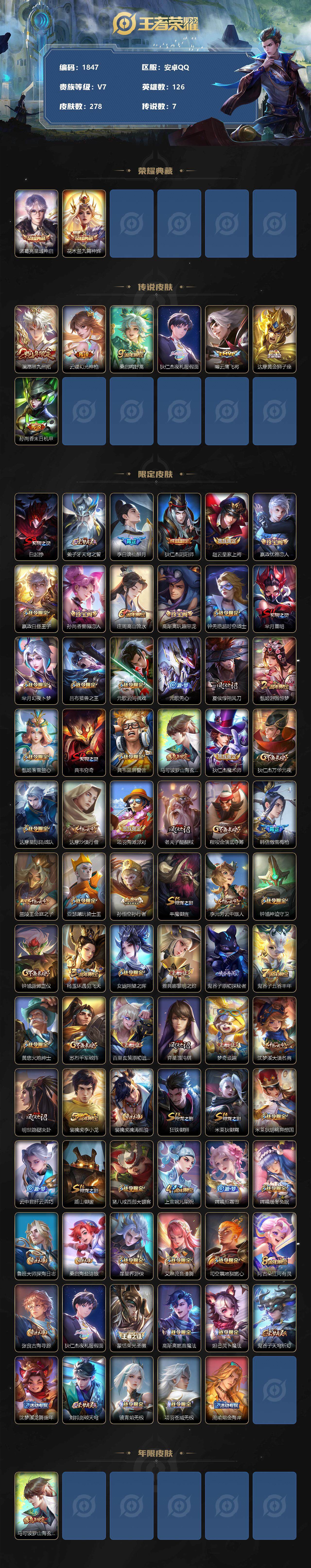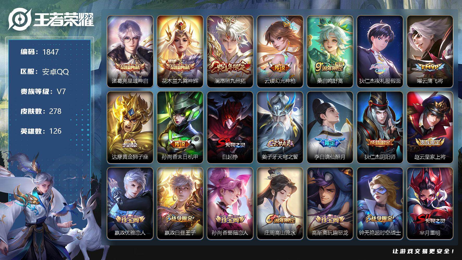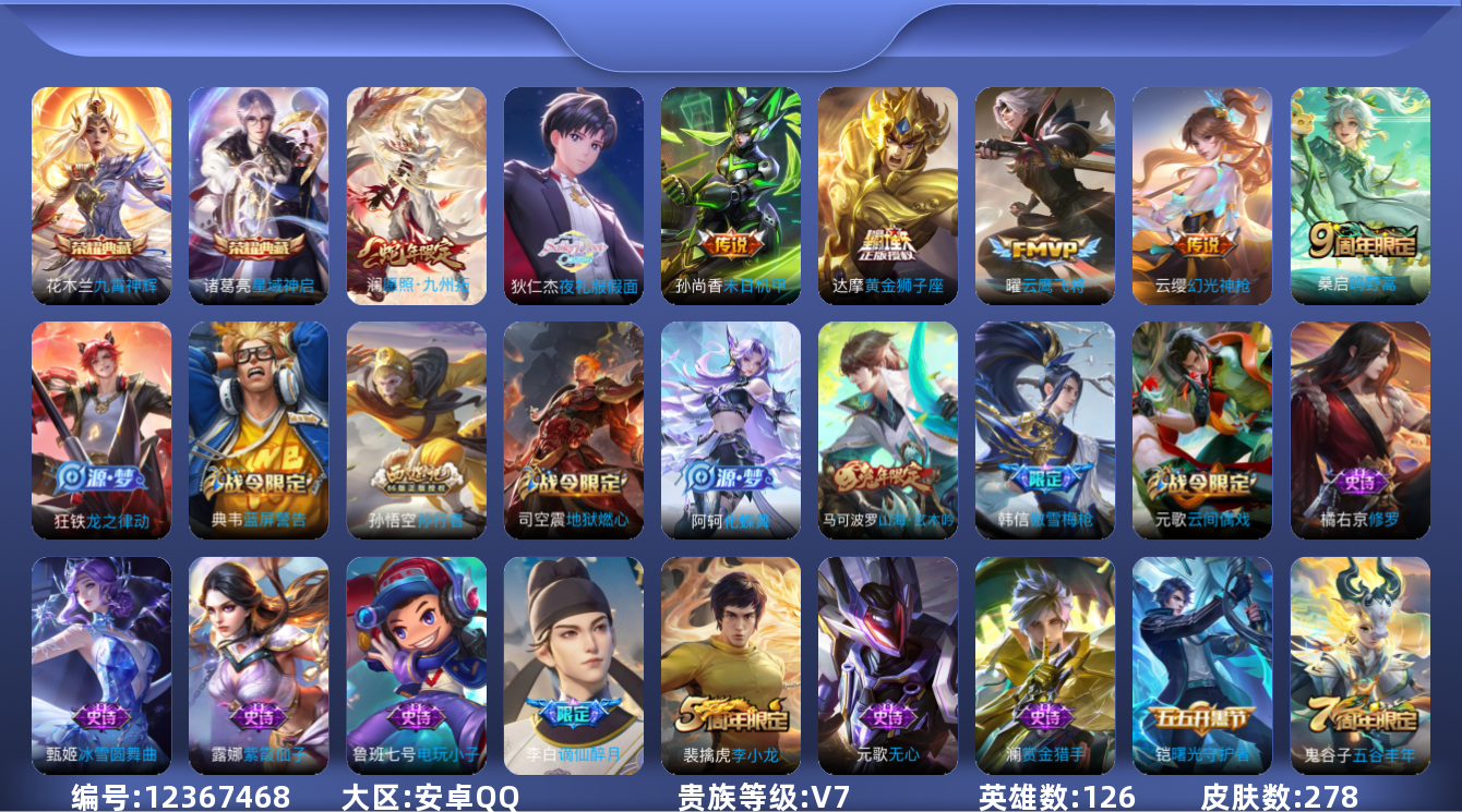 [12367468]【商品标题】:安卓Q-V7-至尊星耀II段位-126英雄-278皮肤-2典藏-0珍品无双-0无双-0珍品传说-7传说-76史诗