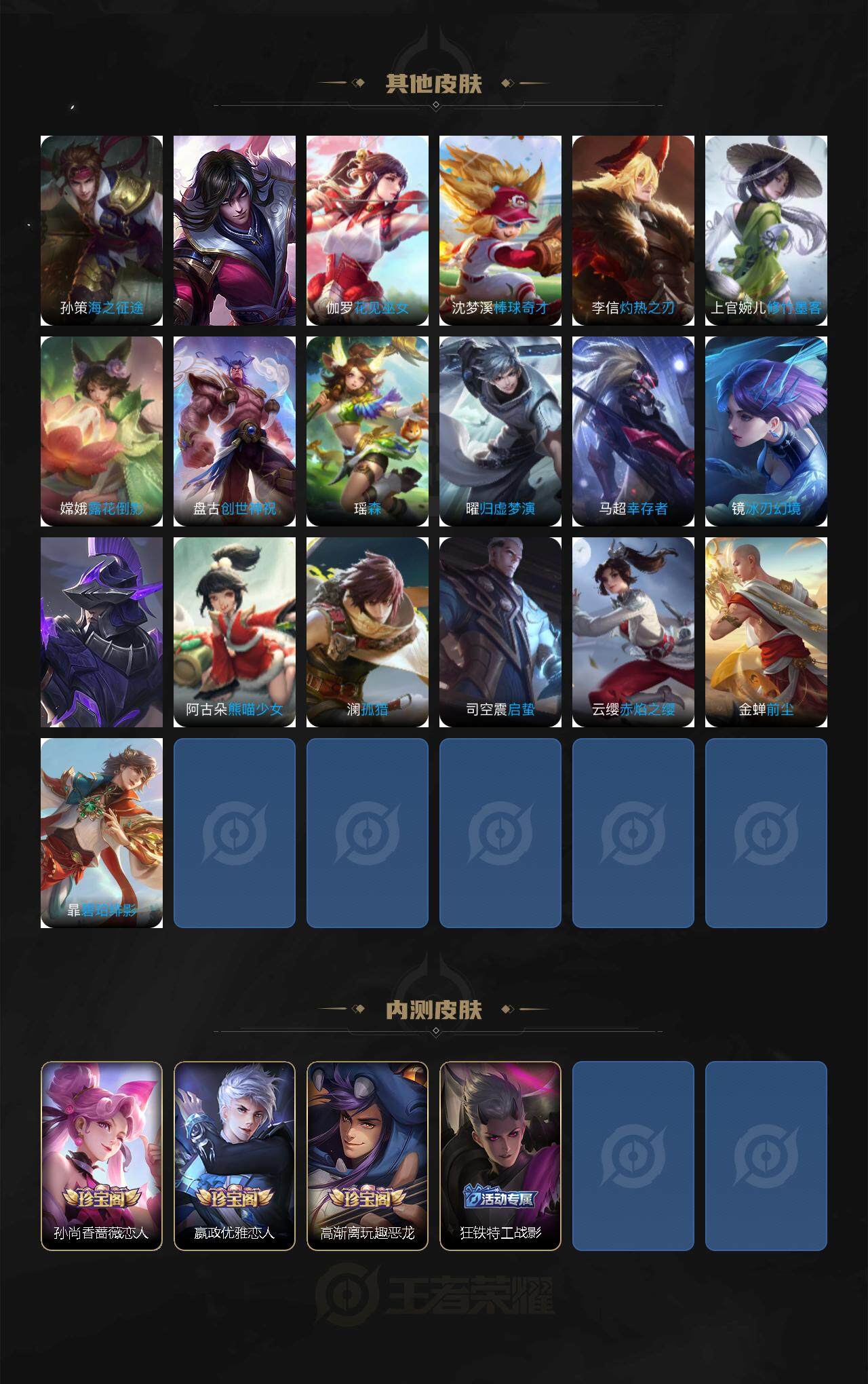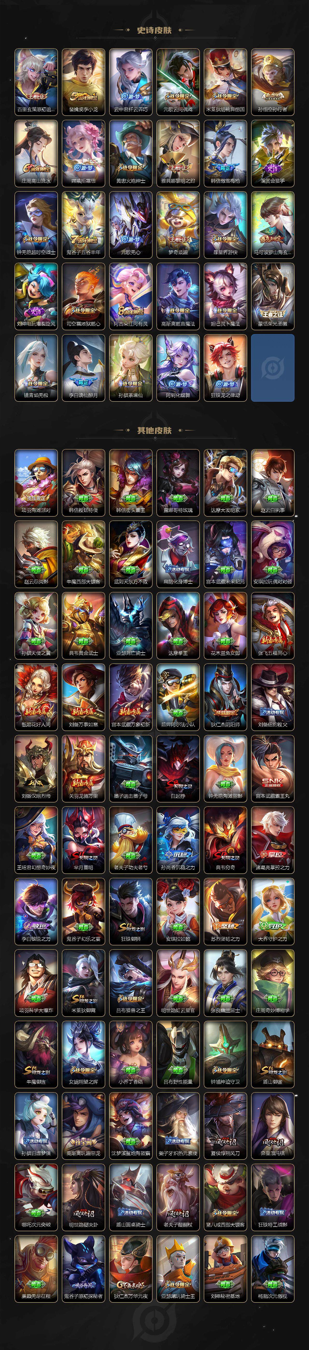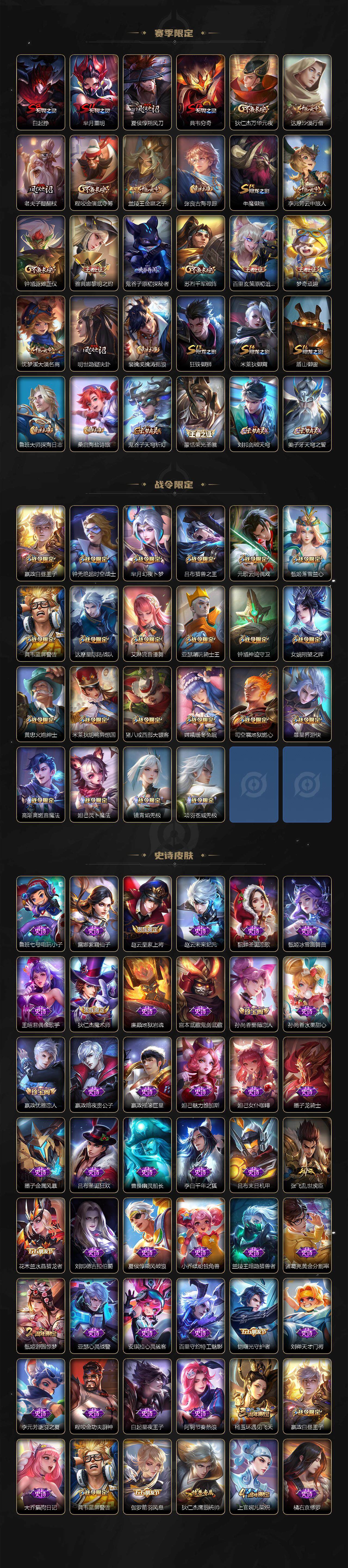 【限定皮肤】:白起狰,姜子牙天穹之誓,李白谪仙醉月,狄仁杰阴阳师,赵云皇家上将,嬴政优雅恋人,嬴政白昼王子,孙尚香蔷薇恋人,庄周高山流水,高渐离玩趣恶龙,钟无艳超时空战士,芈月重明,芈月幻夜卜梦,吕布猎兽之王,元歌云间偶戏,元歌无心,夏侯惇朔风刀,甄姬游园惊梦,甄姬落雪兰心,典韦穷奇,典韦蓝屏警告,马可波罗山海玄木吟,狄仁杰魔术师,狄仁杰万华元夜,达摩星际陆战队,达摩沙漠行僧,项羽海滩派对,老夫子醍醐杖,程咬金演武夺筹,韩信傲雪梅枪,兰陵王金庭之子,亚瑟潮玩骑士王,孙悟空孙行者,牛魔御旌,李元芳云中旅人,钟馗神迹守卫,钟馗驱傩正仪,杨玉环遇见飞天,女娲朔望之晖,雅典娜黎明之约,鬼谷子原初探秘者,鬼谷子五谷丰年,黄忠火炮绅士,苏烈千军破阵,百里玄策原初追逐者,弈星混沌棋,梦奇顽趣,沈梦溪大漠名商,明世隐疑决卦,裴擒虎李小龙,裴擒虎擒涛扼浪,狂铁御狮,米莱狄御霄,米莱狄胡桃异想国,云中君纤云弄巧,盾山御銮,猪八戒西部大镖客,上官婉儿梁祝,嫦娥拒霜思,嫦娥暖冬兔眠,鲁班大师探海日志,桑启海盐诗旅,暃星界游侠,艾琳流音漫舞,司空震地狱燃心,阿古朵江河有灵,张良古海寻踪,狄仁杰夜礼服假面,蒙恬荣光圣徽,高渐离燃音魔法,妲己灵卜魔法,鬼谷子天穹祈灯,沈梦溪龙舞盛年,刘邦剑破天穹,镜青焰无极,项羽苍威无极,周瑜熔金海岸