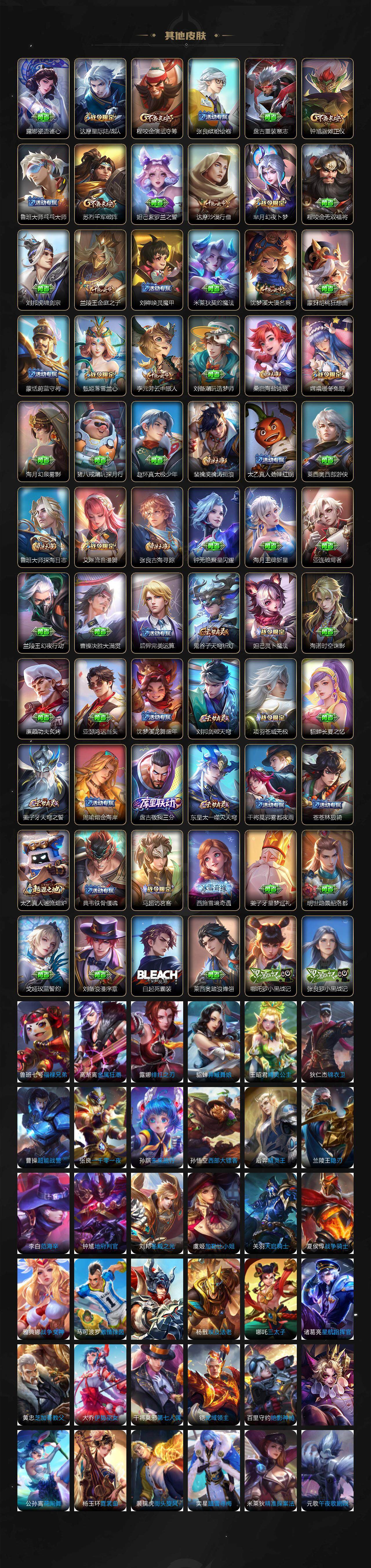 伽罗箭羽风息,李元芳逐浪之夏,大乔猫狗日记,阿轲节奏热浪,露娜紫霞仙子,诸葛亮黄金分割率,王昭君偶像歌手,吕布末日机甲,鲁班七号电玩小子,橘右京修罗,墨子龙骑士,嬴政摇滚巨星,刘禅天才门将,白起星夜王子,安琪拉心灵骇客,程咬金功夫厨神,刘邦德古拉伯爵,兰陵王暗隐猎兽者,曹操幽灵船长,宫本武藏鬼剑武藏,亚瑟心灵战警,廉颇地狱岩魂,小乔缤纷独角兽,夏侯惇乘风破浪,花木兰水晶猎龙者,铠曙光守护者,墨子金属风暴,百里玄策原初追逐者,吕布圣诞狂欢,貂蝉圣诞恋歌,百里守约特工魅影,嬴政暗夜贵公子,嫦娥拒霜思,雅典娜黎明之约,李白千年之狐,澜赏金猎手,刘禅电玩·爆裂旋风,高渐离燃音魔法,李白谪仙醉月