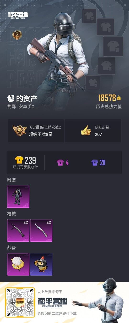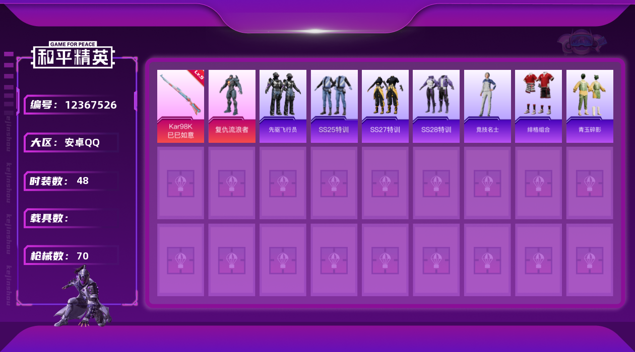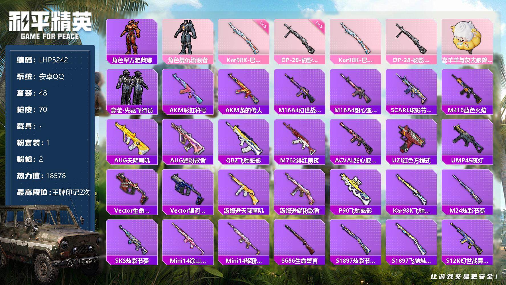 [12367526]【特价急出/详情看图】:安卓 手Q-1粉装-2特效枪-1.8w热力值-2王牌印记-48套装-70枪皮【热门品类】:角色-军刀雅典娜【粉色套装】:角色-复仇流浪者【粉色枪皮等级】:Kar98K-巳巳如意(五级),DP-28-豹影疾电(五级)