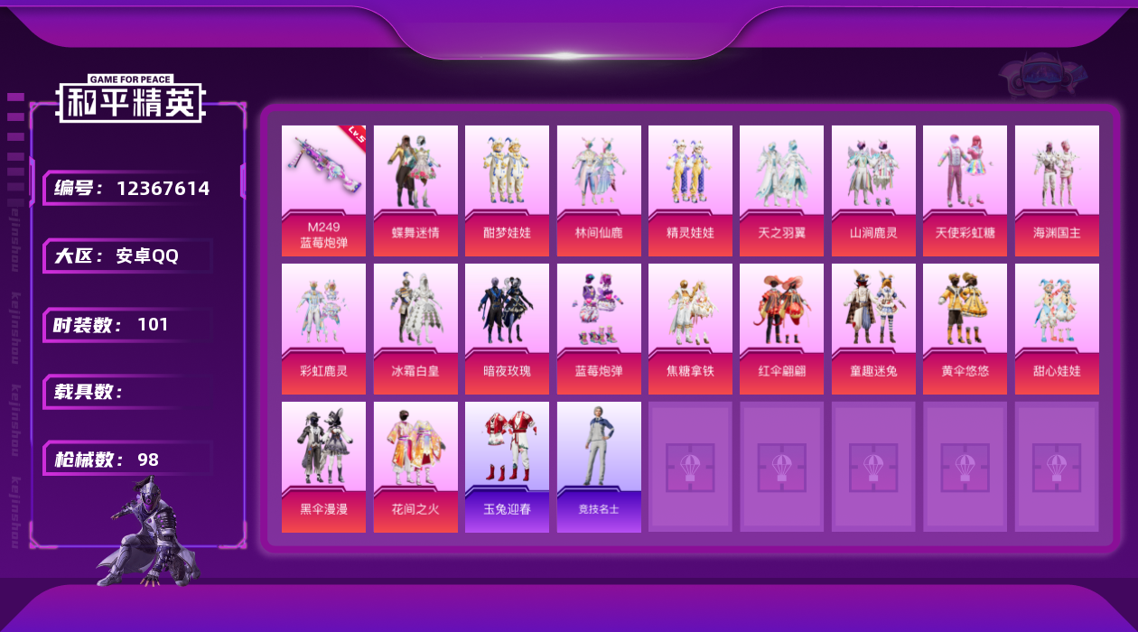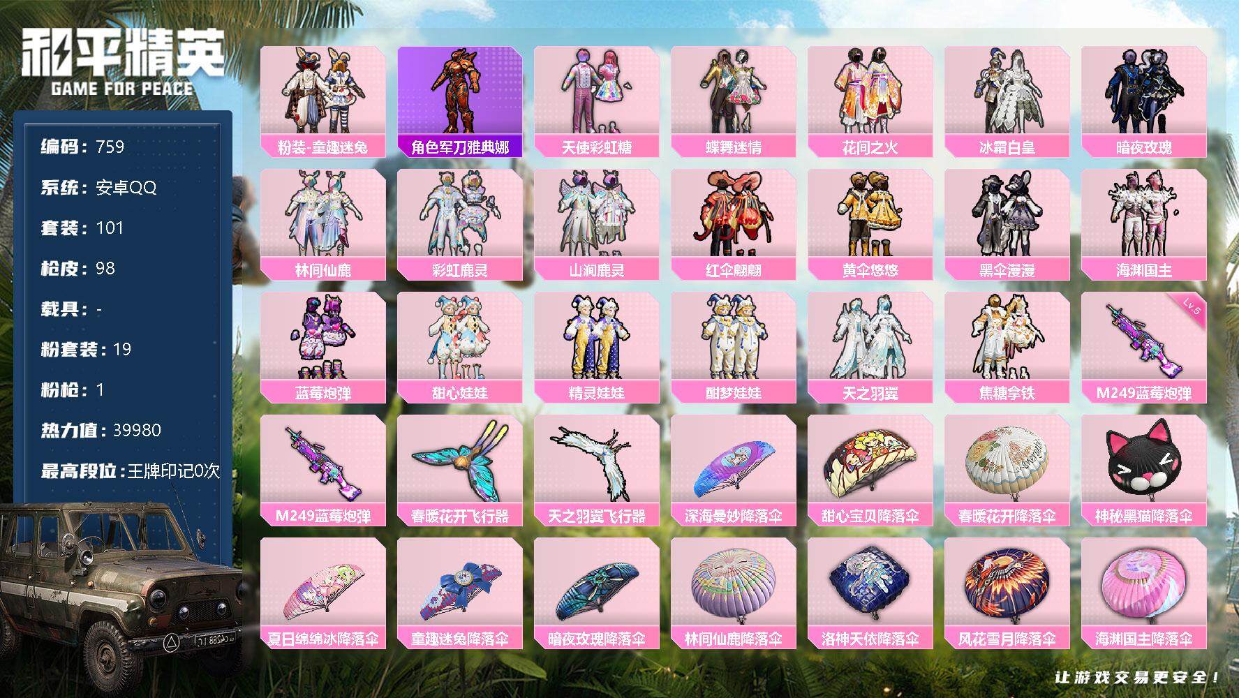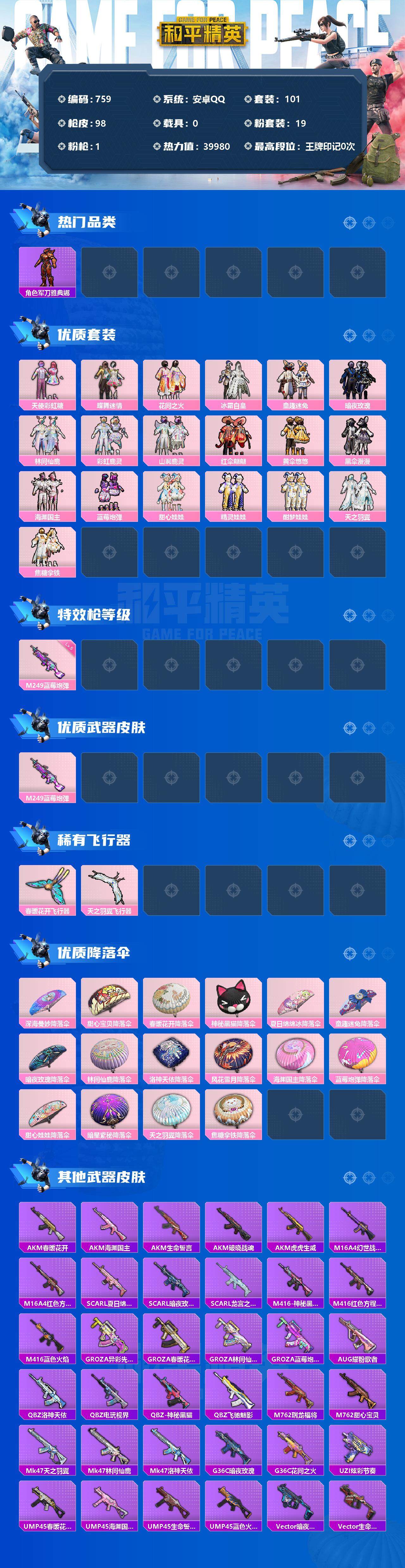 [12367614]【商品标题】:安卓 手Q-19粉装-1特效枪-0载具-2粉色飞行器-39980热力值-1王牌印记-101套装-98枪皮 【热门品类】:粉装-童趣迷兔,角色-军刀雅典娜 【粉色套装】:粉装-天使彩虹糖,粉装-蝶舞迷情,粉装-花间之火,粉装-冰霜白皇,粉装-童趣迷兔,粉装-暗夜玫瑰,粉装-林间仙鹿,粉装-彩虹鹿灵,粉装-山涧鹿灵,粉装-红伞翩翩,粉装-黄伞悠悠,粉装-黑伞漫漫,粉装-海渊国主,粉装-蓝莓炮弹,粉装-甜心娃娃,粉装-精灵娃娃,粉装-酣梦娃娃,粉装-天之羽翼,粉装-焦糖拿铁 【粉色枪皮等级】:M249-蓝莓炮弹(五级) 【粉色枪皮】:M249-蓝莓炮弹 【粉色飞行器】:春暖花开飞行器,天之羽翼飞行器 【粉色降落伞】:深海曼妙降落伞,甜心宝贝降落伞,春暖花开降落伞,神秘黑猫降落伞,夏日绵绵冰降落伞,童趣迷兔降落伞,暗夜玫瑰降落伞,林间仙鹿降落伞,洛神天依降落伞,风花雪月降落伞,海渊国主降落伞,蓝莓炮弹降落伞,甜心娃娃降落伞,暗星紫秘降落伞,天之羽翼降落伞,焦糖拿铁降落伞 【稀有枪皮】:AKM-春暖花开,AKM-海渊国主,AKM-生命誓言,AKM-破晓战魂,AKM-虎虎生威,M16A4-幻世战舞者,M16A4-红色方程式,SCAR-L-夏日绵绵冰,SCAR-L-暗夜玫瑰,SCAR-L-龙宫之主,M416-神秘黑猫,M416-红色方程式,M416-蓝色火焰,GROZA-异彩先驱,GROZA-春暖花开,GROZA-林间仙鹿,GROZA-蓝莓炮弹,AUG-耀粉歌者,QBZ-洛神天依,QBZ-电玩视界,QBZ-神秘黑猫,QBZ-飞驰魅影,M762-瑞龙福将,M762-甜心宝贝,Mk47-天之羽翼,Mk47-林间仙鹿,Mk47-洛神天依,G36C-暗夜玫瑰,G36C-花间之火,UZI-炫彩节奏,UMP45-春暖花开,UMP45-海渊国主,UMP45-生命誓言,UMP45-蓝色火焰,Vector-暗夜玫瑰,Vector-生命誓言,汤姆逊-天降萌叽,汤姆逊-异彩先驱,汤姆逊-林间仙鹿,汤姆逊-耀粉歌者,野牛-电玩视界,MP5K-异彩先驱,MP5K-蓝莓炮弹,P90-飞驰魅影,Kar98K-洛神天依,Kar98K-灵符少年,Kar98K-电玩视界,Kar98K-红伞翩翩,Kar98K-蓝莓炮弹,Kar98K-飞驰魅影,AWM-恐龙拽拽,SKS-天之羽翼,Mini14-异彩先驱