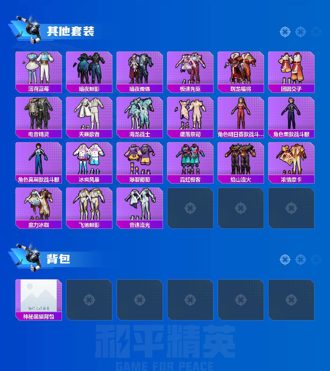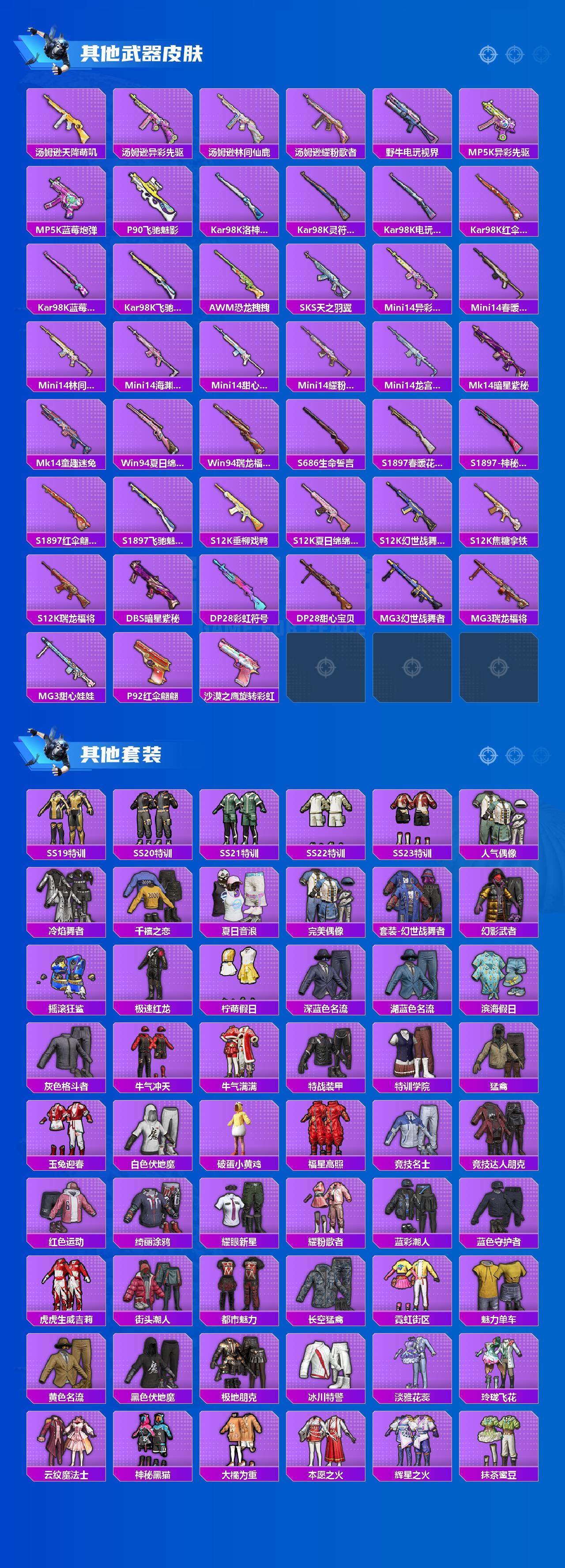 - [12084295]1红装 4粉装 2特效枪 2载具 1印记 可二次 可修改实名 连体王者 安全保护中 优质装备:最终圣卫者-帕修斯,二级最终圣卫者-帕修斯,最终圣卫者摩托车,玛莎拉蒂Quattroporte(夜幕蓝),华贵君王,SCAR-L纯梦嫁纱,Vector-最终圣卫者,冷漠罗丽 热门装扮:复仇流浪者,心之回忆,鹰眼刺客,万圣娃娃,梦魇先生,爱崽白熊 四级特效枪:四级SCAR-L-纯梦嫁纱 三级特效枪:三级Vector-最终圣卫者 紫色装扮:飞狐塔尔斯,SS23特训,幻彩翩翩,妙红点点,摩登艾咪,萌趣咩咩,SS21特训,SS3特训,SS4特训,SS5特训,冰原使者,,凛冬战士,北国孤狼,千禧之恋,云朵鹅,雪绒豹,SS33特训套装,时希公主,灵公主,SS20特训,艾克斯奥特曼,军刀雅典娜,英勇保护者,粉团憨憨,香草威化,甜心亚梦,虚音幻奏,酷潮明星,长空猛禽,雪山征服者,雪山精英,霓虹街区,迎春赐吉,蓝彩潮人,蓝色运动,西部风情,跃动心情,龙腾端午,魅力单车,黄色运动,熔岩游骑兵连帽夹克,极速红龙,深蓝色名流,圣诞大吉,坚韧舞者,夜莺强袭者,幻世战舞者,怒火燎原,战地菁英,疯狂小兔子,破蛋小黄鸡,甜蜜告白,竞技勇士朋克,红色运动,潮流先锋,灰色格斗者,燃烧卡路里,牛气满满,竞技名士,情公主,精神漫游,炽焰拳师,格斗专家,SS6特训,银河圣歌,闪耀星光,核芯基因,SS7特训,金环蜂王,黑夜传说,星光纪元,玲珑飞花,SS8特训,薄荷蓝莓,SS32特训服(SS32特训套装),冰冻风暴,弄潮海豚,冷血极客,丛林猎人,传奇侦探,特种空勤,爆竹金鼠 优质战备:精灵梦叶罗丽降落伞,最终圣卫者降落伞,终晖之翼飞行器,临安公主降落伞,环太平洋降落伞,音爆索尼克降落伞,银河战甲降落伞,阿狸红降落伞