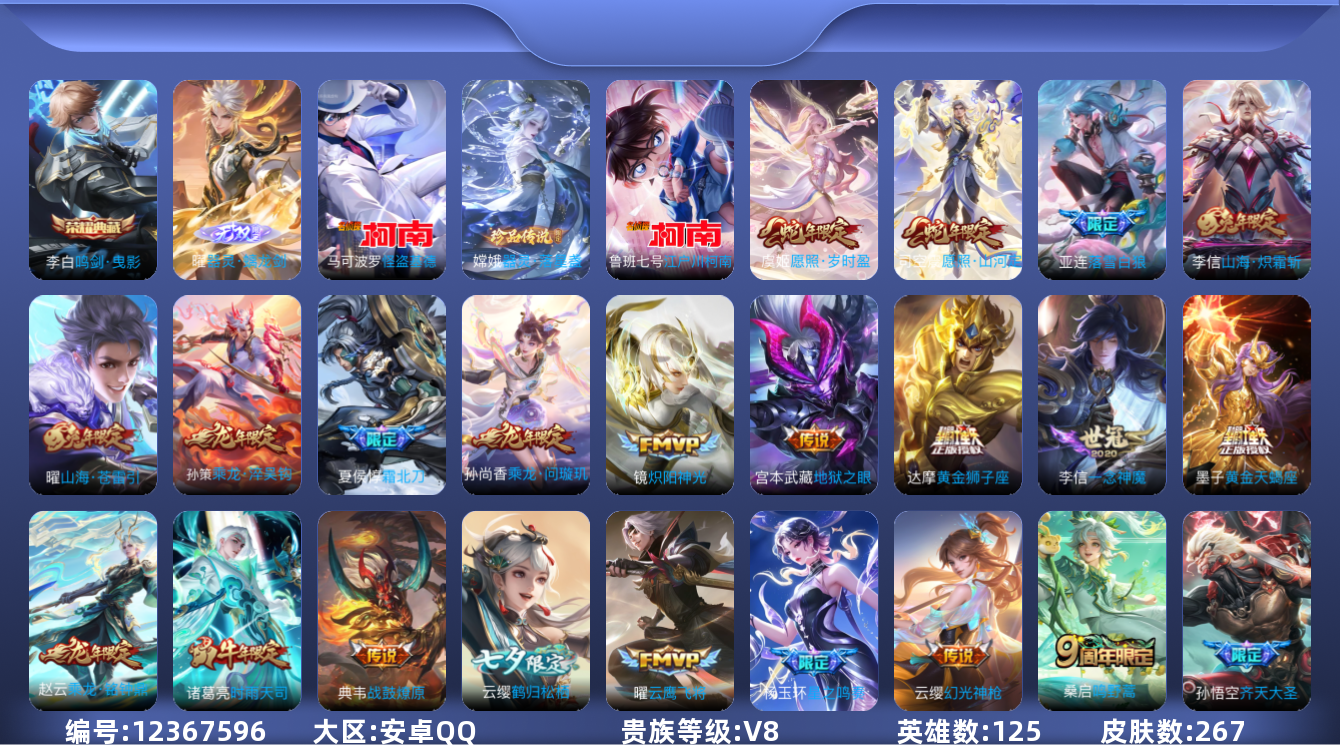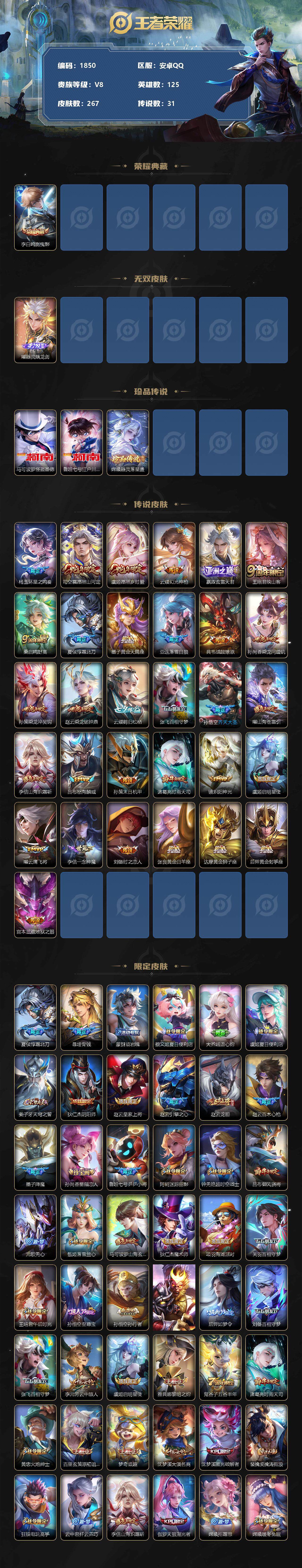 [12367596]【商品标题】:安卓Q-V4-永恒钻石I段位-125英雄-267皮肤-1典藏-0珍品无双-1无双-3珍品传说-31传说-96史诗