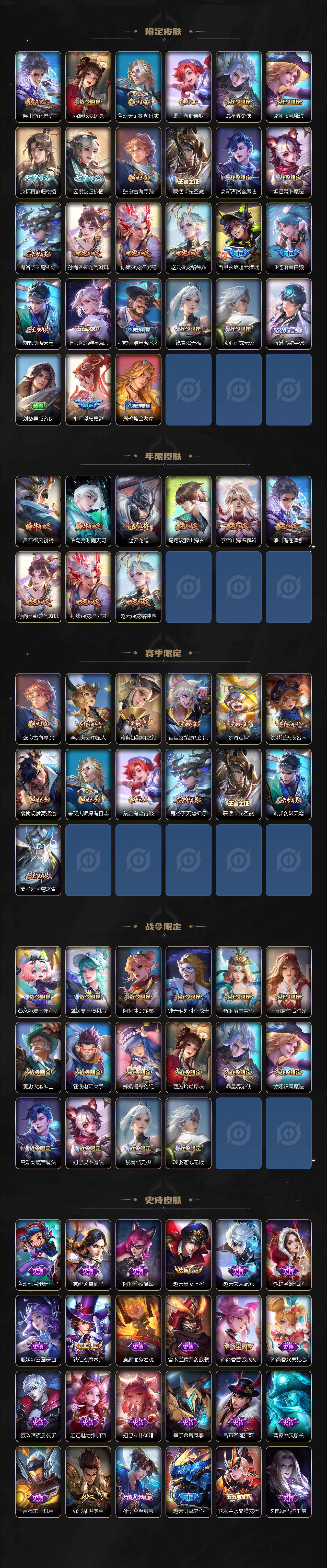 【限定皮肤】:夏侯惇霜北刀,暃埋骨钱,蒙犽顽岩魄,蔡文姬夏日便利店,大乔绒语心约,虞姬夏日便利店,姜子牙天穹之誓,狄仁杰阴阳师,赵云皇家上将,赵云引擎之心,赵云龙胆,赵云百木心枪,墨子降魔,孙尚香蔷薇恋人,鲁班七号乒乒小将,阿轲迷踪丽影,钟无艳超时空战士,吕布御风骁将,元歌无心,甄姬落雪兰心,马可波罗山海玄木吟,狄仁杰魔术师,项羽海滩派对,关羽百相守梦,王昭君午后时光,孙悟空至尊宝,孙悟空孙行者,孙悟空齐天大圣,后羿如梦令,刘备百相守梦,张飞百相守梦,李元芳云中旅人,虞姬启明星使,雅典娜黎明之约,鬼谷子五谷丰年,诸葛亮时雨天司,黄忠火炮绅士,百里玄策原初追逐者,梦奇顽趣,沈梦溪大漠名商,沈梦溪匿光破解者,裴擒虎擒涛扼浪,狂铁电玩高手,云中君纤云弄巧,李信山海炽霜斩,伽罗天狼溯光者,嫦娥拒霜思,嫦娥暖冬兔眠,曜山海苍雷引,西施玲珑珍味,鲁班大师探海日志,桑启海盐诗旅,暃星界游侠,戈娅驭风魔法,赵怀真鹤归松栖,云缨鹤归松栖,张良古海寻踪,蒙恬荣光圣徽,高渐离燃音魔法,妲己灵卜魔法,鬼谷子天穹祈灯,孙尚香乘龙问璇玑,孙策乘龙淬吴钩,赵云乘龙铭钟鼎,百里玄策超元猎域,亚连落雪白狼,刘邦剑破天穹,上官婉儿群星魔术团,程咬金群星魔术团,镜青焰无极,项羽苍威无极,海诺心动手记,刘备异域游侠,芈月浮光幕影,周瑜熔金海岸