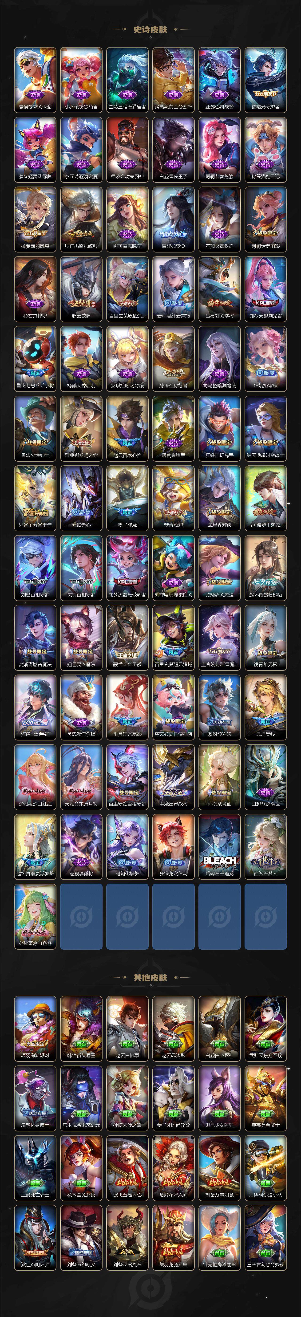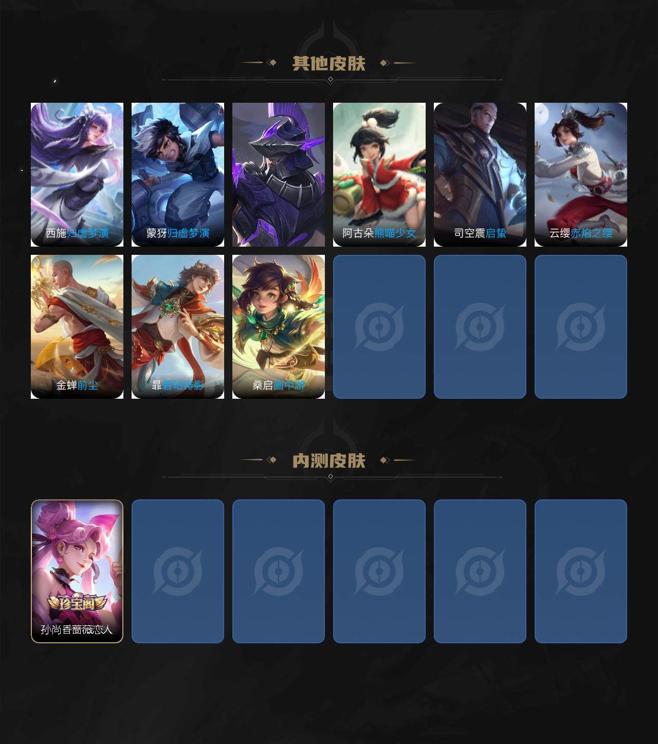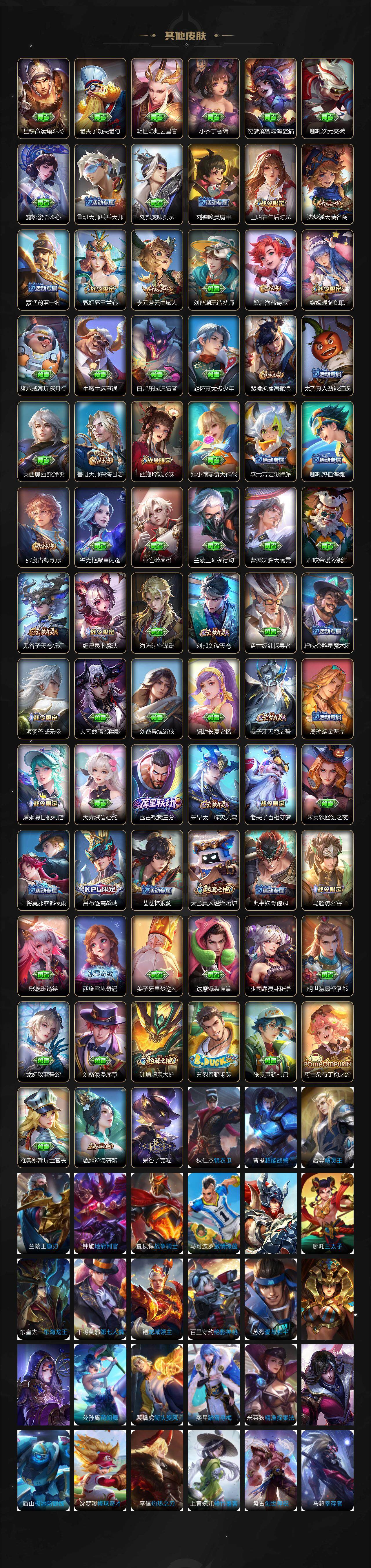 娜可露露晚萤,伽罗箭羽风息,李元芳逐浪之夏,不知火舞魅语,孙策猫狗日记,阿轲节奏热浪,露娜紫霞仙子,诸葛亮黄金分割率,阿轲暗夜猫娘,吕布末日机甲,鲁班七号电玩小子,橘右京修罗,白起星夜王子,安琪拉时之奇旅,程咬金功夫厨神,刘邦德古拉伯爵,兰陵王暗隐猎兽者,曹操幽灵船长,宫本武藏鬼剑武藏,司马懿暗渊魔法,亚瑟心灵战警,杨戬天秀·启明,蔡文姬舞动绿茵,廉颇地狱岩魂,小乔缤纷独角兽,夏侯惇乘风破浪,花木兰水晶猎龙者,铠曙光守护者,墨子金属风暴,百里玄策原初追逐者,吕布圣诞狂欢,貂蝉圣诞恋歌,嬴政暗夜贵公子,嫦娥拒霜思,雅典娜黎明之约,澜赏金猎手,刘备百相守梦,关羽百相守梦,沈梦溪匿光破解者,刘禅电玩·爆裂旋风,赵怀真鹤归松栖,高渐离燃音魔法,上官婉儿群星魔术团,海诺心动手记,白起苍鳞隐世,赵怀真器灵·浮梦炉,苍狼魂孤将