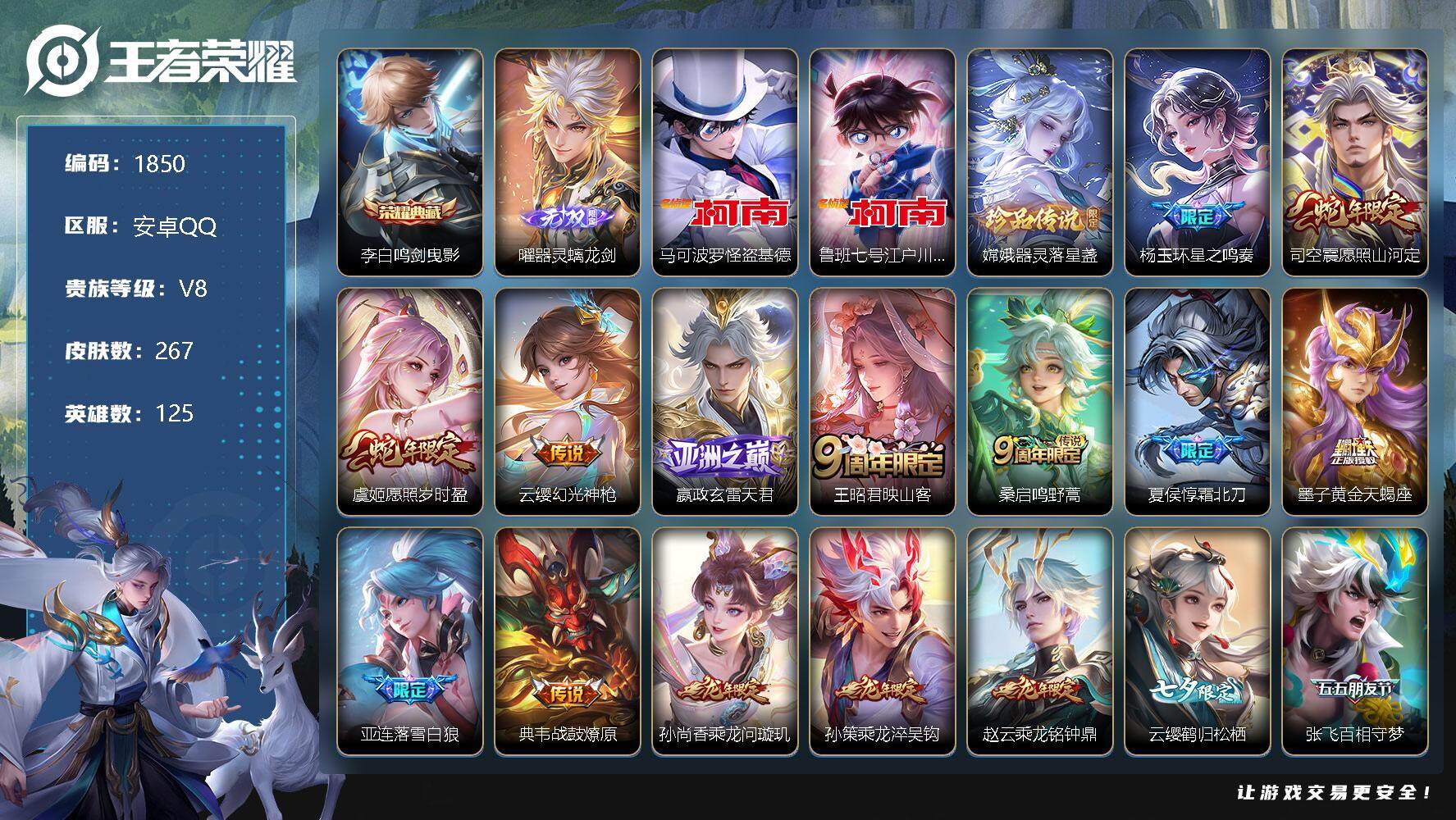 [12367596]【商品标题】:安卓Q-V4-永恒钻石I段位-125英雄-267皮肤-1典藏-0珍品无双-1无双-3珍品传说-31传说-96史诗 【英雄全皮】:刘备全皮,苍全皮,李信全皮,蒙恬全皮,赵怀真全皮,影全皮,海诺全皮,少司缘全皮 【荣耀典藏】:李白鸣剑曳影 【无双皮肤】:曜器灵螭龙剑 【珍品传说】:马可波罗怪盗基德,鲁班七号江户川柯南,嫦娥器灵落星盏 【传说皮肤】:杨玉环星之鸣奏,司空震愿照山河定,虞姬愿照岁时盈,云缨幻光神枪,嬴政玄雷天君,王昭君映山客,桑启鸣野蒿,夏侯惇霜北刀,墨子黄金天蝎座,亚连落雪白狼,典韦战鼓燎原,孙尚香乘龙问璇玑,孙策乘龙淬吴钩,赵云乘龙铭钟鼎,云缨鹤归松栖,张飞百相守梦,孙悟空齐天大圣,曜山海苍雷引,李信山海炽霜斩,吕布怒海麟威,孙策末日机甲,诸葛亮时雨天司,镜炽阳神光,虞姬启明星使,曜云鹰飞将,李信一念神魔,刘备时之恋人,张良黄金白羊座,达摩黄金狮子座,后羿黄金射手座,宫本武藏地狱之眼 【限定皮肤】:夏侯惇霜北刀,暃埋骨钱,蒙犽顽岩魄,蔡文姬夏日便利店,大乔绒语心约,虞姬夏日便利店,姜子牙天穹之誓,狄仁杰阴阳师,赵云皇家上将,赵云引擎之心,赵云龙胆,赵云百木心枪,墨子降魔,孙尚香蔷薇恋人,鲁班七号乒乒小将,阿轲迷踪丽影,钟无艳超时空战士,吕布御风骁将,元歌无心,甄姬落雪兰心,马可波罗山海玄木吟,狄仁杰魔术师,项羽海滩派对,关羽百相守梦,王昭君午后时光,孙悟空至尊宝,孙悟空孙行者,孙悟空齐天大圣,后羿如梦令,刘备百相守梦,张飞百相守梦,李元芳云中旅人,虞姬启明星使,雅典娜黎明之约,鬼谷子五谷丰年,诸葛亮时雨天司,黄忠火炮绅士,百里玄策原初追逐者,梦奇顽趣,沈梦溪大漠名商,沈梦溪匿光破解者,裴擒虎擒涛扼浪,狂铁电玩高手,云中君纤云弄巧,李信山海炽霜斩,伽罗天狼溯光者,嫦娥拒霜思,嫦娥暖冬兔眠,曜山海苍雷引,西施玲珑珍味,鲁班大师探海日志,桑启海盐诗旅,暃星界游侠,戈娅驭风魔法,赵怀真鹤归松栖,云缨鹤归松栖,张良古海寻踪,蒙恬荣光圣徽,高渐离燃音魔法,妲己灵卜魔法,鬼谷子天穹祈灯,孙尚香乘龙问璇玑,孙策乘龙淬吴钩,赵云乘龙铭钟鼎,百里玄策超元猎域,亚连落雪白狼,刘邦剑破天穹,上官婉儿群星魔术团,程咬金群星魔术团,镜青焰无极,项羽苍威无极,海诺心动手记,刘备异域游侠,芈月浮光幕影,周瑜熔金海岸 【年限皮肤】:吕布御风骁将,诸葛亮时雨天司,赵云龙胆,