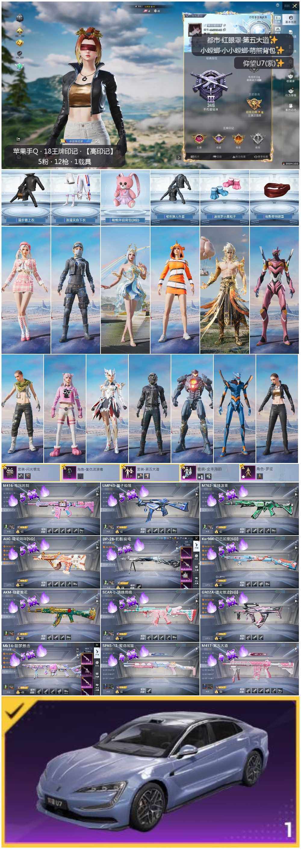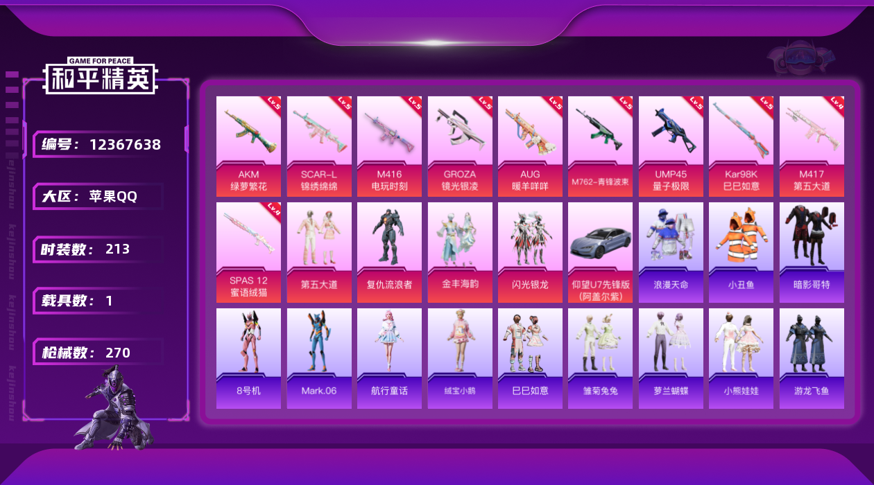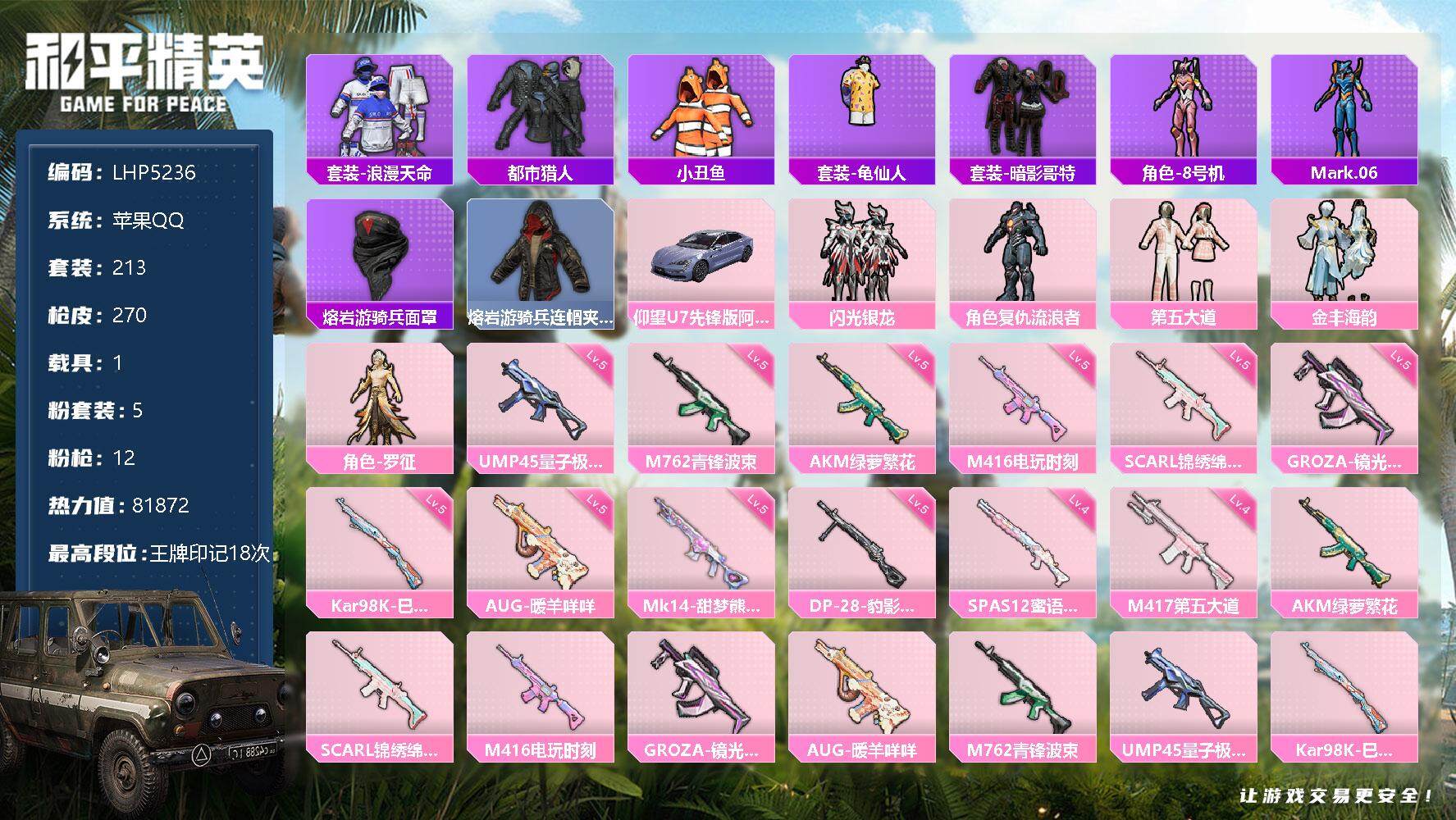 [12367638]素材身法号/地铁满天赋【特价急出/详情看图】:苹果 手Q-5粉装-12特效枪-1载具-3粉色飞行器-8.1w热力值-18王牌印记-213套装-270枪皮【热门品类】:套装-浪漫天命,套装-都市猎人,套装-小丑鱼,套装-龟仙人,套装-暗影哥特,角色-8号机,角色-Mark.06,熔岩游骑兵面罩,熔岩游骑兵连帽夹克【粉色载具】:仰望U7(阿盖尔紫)【粉色套装】:粉装-闪光银龙,角色-复仇流浪者,粉装-第五大道,粉装-金丰海韵,角色-罗征【粉色枪皮等级】:AKM-绿萝繁花(五级),SCAR-L-锦绣绵绵(五级),M416-电玩时刻(五级),GROZA-镜光银凌(五级),AUG-暖羊咩咩(五级),M762-青锋波束(五级),UMP45-量子极限(五级),Kar98K-巳巳如意(五级),Mk14-甜梦熊击(五级),M417-第五大道(四级),SPAS-12-蜜语绒猫(四级),DP-28-豹影疾电(五级)【粉色飞行器】:天之羽翼飞行器,闪光银龙飞行器