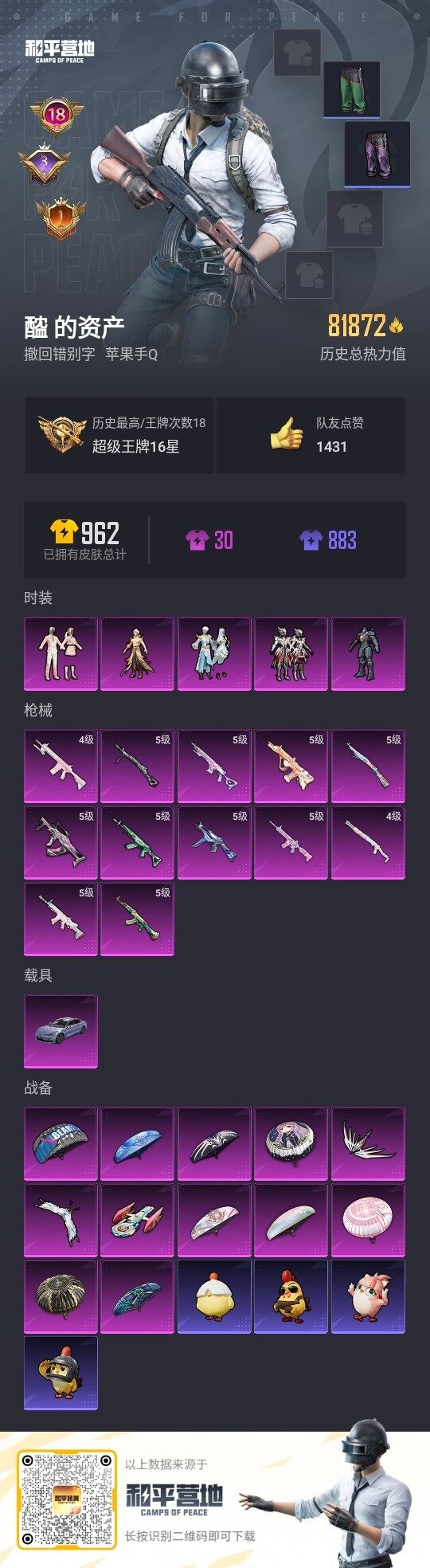 - PX_2107685-安卓QQ 历史总热力值:40616 红装数量:1 粉装数量:10 特效枪数量:5 载具数量:3 王牌印记:4 历史最高段位:绝世王牌25星 套装数量:92 时装数量:387 枪械数量:99 战备数量:106 装备数量:128 载具:保时捷Cayenne(激情红),宝马M4(圣保罗黄),霜龙神御(云雾蓝) 时装:灵猫魔法师-塞维尔(1级),套装-吟月归客,套装-放客神游,套装-