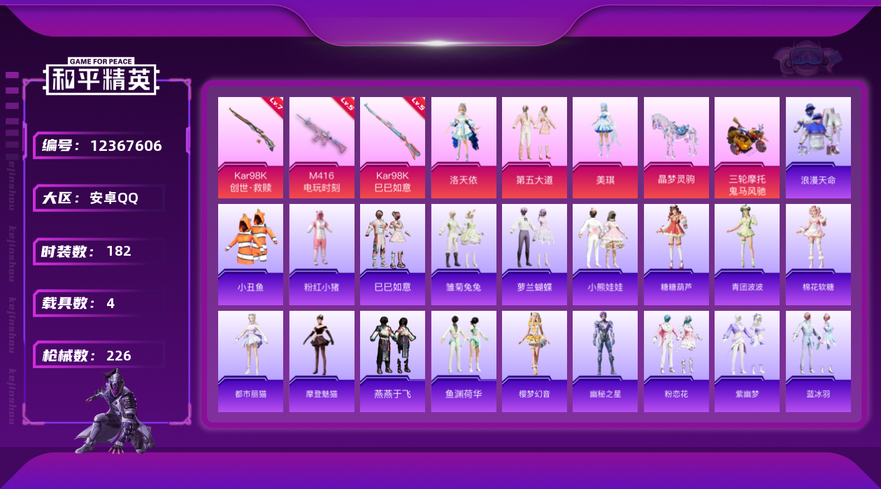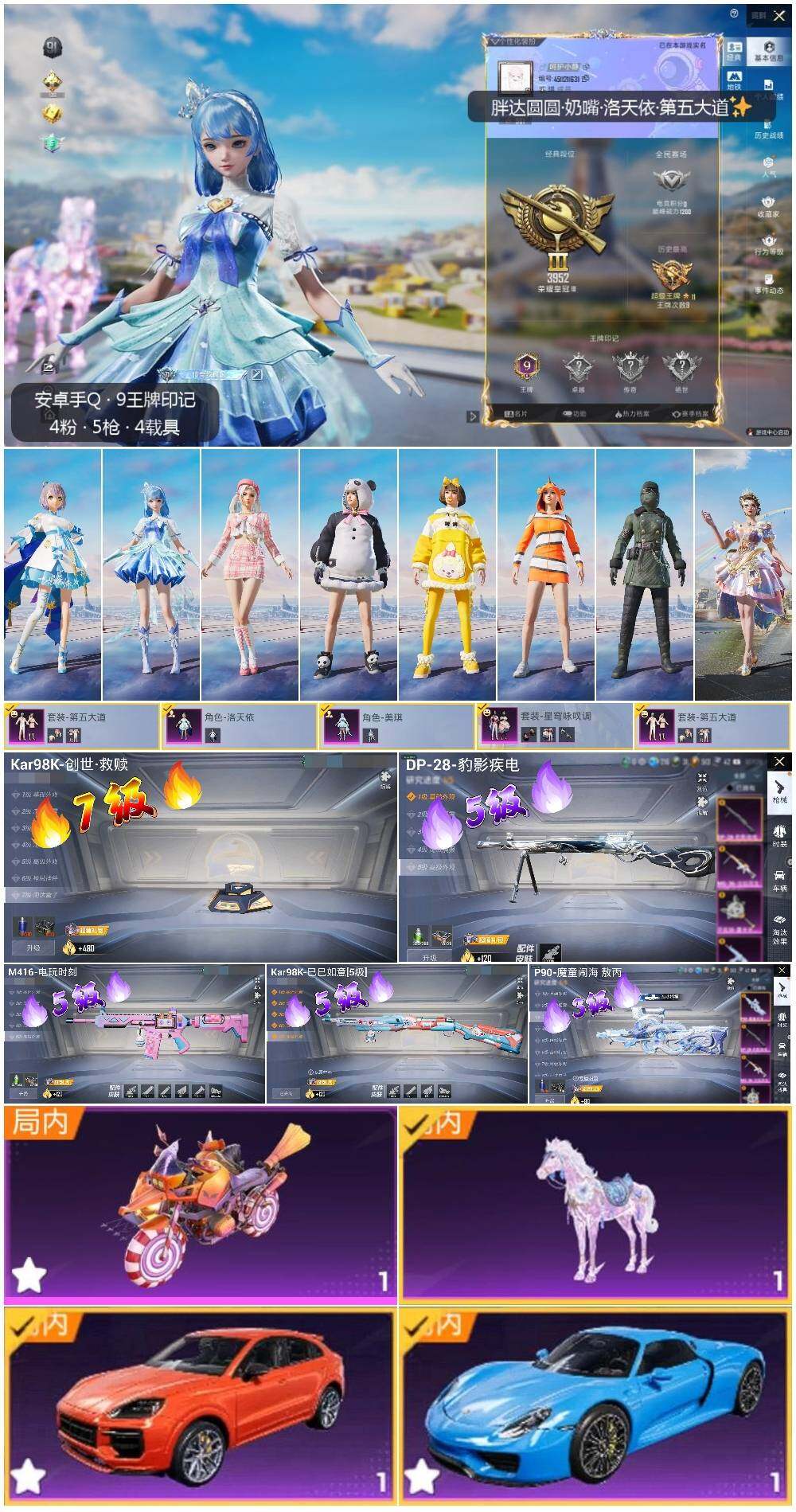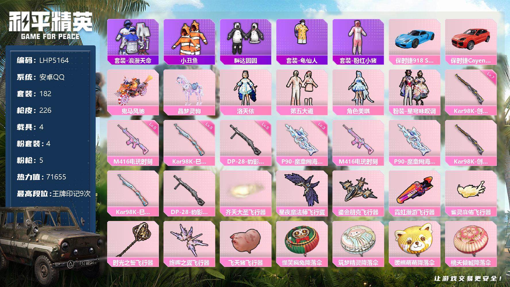 [12367606]素材身法号【特价急出/详情看图】:安卓 手Q-4粉装-5特效枪-4载具-8粉色飞行器-7.1w热力值-9王牌印记-182套装-226枪皮【热门品类】:套装-浪漫天命,套装-小丑鱼,套装-胖达圆圆,套装-龟仙人,套装-粉红小猪【粉色载具】:保时捷918 Spyder(沉静蓝),保时捷Cayenne(激情红),鬼马风驰,晶梦灵驹【粉色套装】:角色-洛天依,粉装-第五大道,角色-美琪,粉装-星穹咏叹调【粉色枪皮等级】:M416-电玩时刻(五级),P90-魔童闹海 敖丙(三级),Kar98K-创世·救赎(七级),Kar98K-巳巳如意(五级),DP-28-豹影疾电(五级)【粉色飞行器】:齐天大圣飞行器,星夜魔法师飞行翼,鎏金朋克飞行器,霓虹漫游飞行器,雀灵庇佑飞行器,时光之誓飞行器,终晖之翼飞行器,飞天猪飞行器