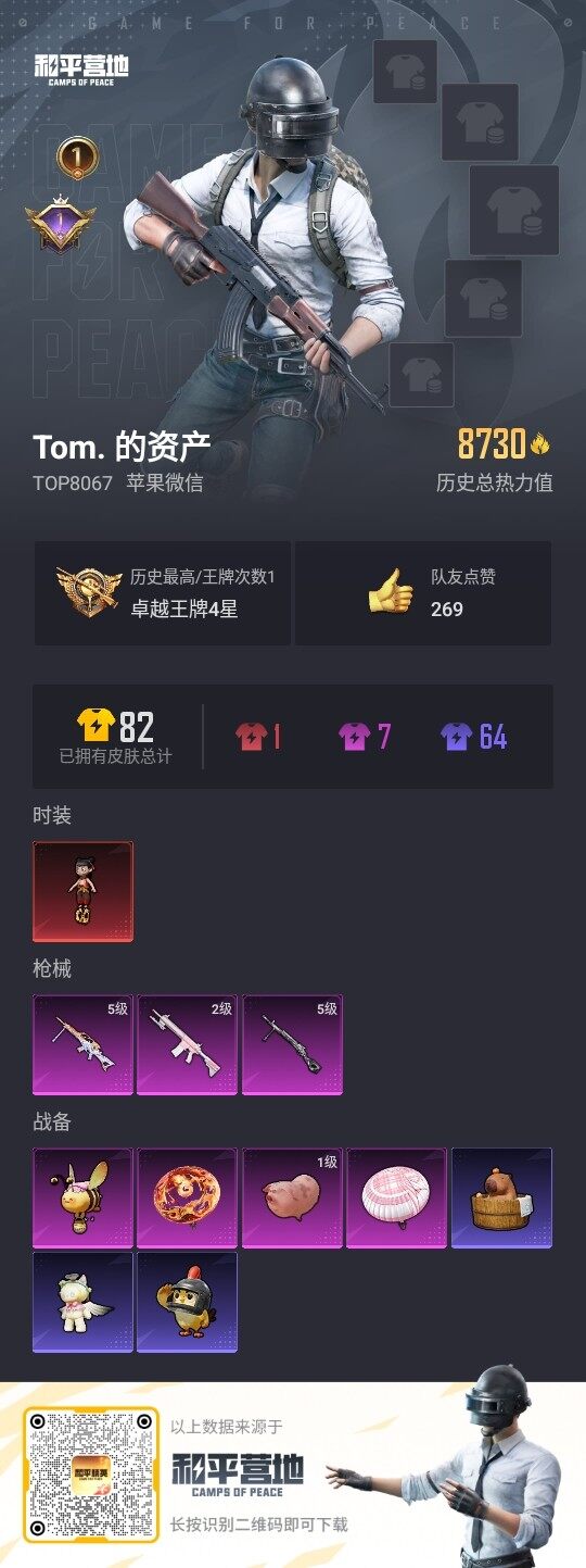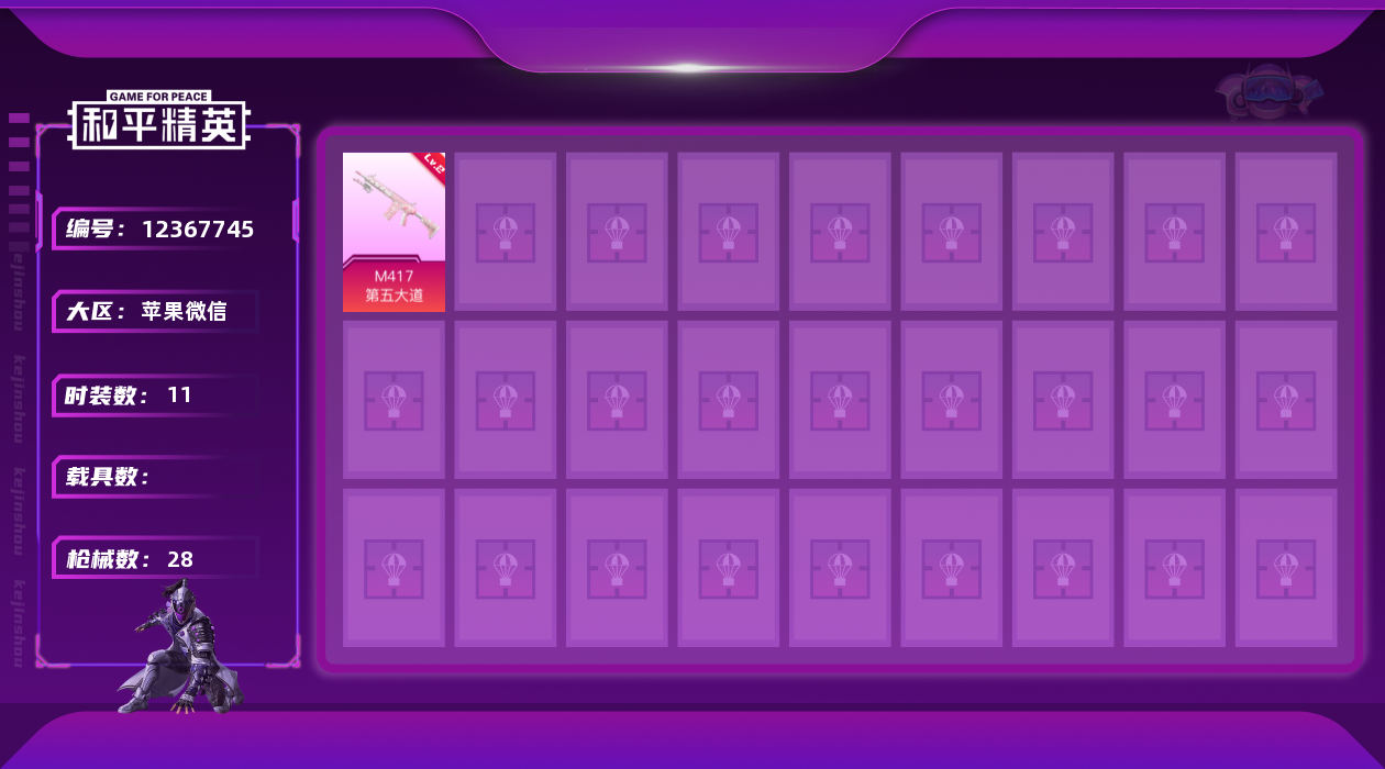 - [11254352]10粉装 7特效枪 21印记 可二次 可修改实名 优质装备:Mini14荧光虫舞,深渊皇后,宝贝奶油派,天使彩虹糖,M416风花雪月,AKM绿萝繁花,七级M416-风花雪月,七级Mini14-荧光虫舞,M416电玩时刻,AUG-暖羊咩咩,星穹咏叹调,Kar98K-巳巳如意 热门装扮:吟月归客,薄荷物语,垂柳戏鸭,飒粉甜心,光极星,金丰海韵,软萌银虎,激萌罗小黑,迅捷狂鲨,鹰眼刺客,深海小丑鱼,暗夜魅影 五级特效枪:五级Kar98K-巳巳如意,五级DP-28-豹影疾电,五级AUG-暖羊咩咩,五级M416-电玩时刻,五级AKM-绿萝繁花 紫色装扮:SS22特训,莱茵河畔,飞狐塔尔斯,妙红点点,幻彩翩翩,SS23特训,俏皮奶喵,暖心橘喵,娇憨猪猪,萌趣咩咩,SS21特训,SS30特训套装,军械专家,人气偶像,冰川特警,冷焰舞者,千禧之恋,青涩时光,SS20特训,SS31特训套装,云朵鹅,雪绒豹,SS33特训套装,顶瓜瓜,青春冒险家,潮流游乐家,SS15特训,闪银刀客,时空追击者,暴风机械师,星辰守护者,SS16特训,冰爽风暴,星梦畅游,镭射皇者,闪金天王,银白舞王,SS13特训,冰爽海盐,治愈之星,迅捷之星,科技之星,SS14特训,萌趣颜团子,特种颜团子,虚音幻奏,雪兔飞飞,飞驰魅影,音速流光,极速竞梦,SS19特训,浑天鲲鹏,甜心亚梦,豚鼠丹丹,瑞龙福将,团圆交子,SS17特训,异彩先驱,缤纷焰火,SS18特训,吉莉礼服,长空猛禽,迎春赐吉,都市魅力,酒红色名流,酷潮明星,野性战魂,雨林探路者,雪山精英,雪鹰学院,霓虹极客,霓虹街区,青年教官,缤纷果语,耀眼新星,蓝彩潮人,蓝色守护者,蓝色运动,虎虎生威吉莉,街头潮人,超能勇士,青春校园,蜜露汐语,蓝海鲸歌,风行保卫者,龙的传人,飞行日记,魅力单车,鹤鸣,麻辣教官,黄色伏地魔,黄色名流,黄色运动,黎明保卫者,黑色伏地魔,龙腾端午,龟仙人,冰河战士,龙魂突击队,蝶变,香桃花海,绮丽涂鸦,极地朋克,极速红龙,柠萌假日,棕色飞行服,橘黑制服,沙漠兵团,海岛探路者,涂山之恋,深蓝色名流,湖蓝色名流,幻世战舞者,夏日音浪,完美偶像,帅气教官,幻影武者,战地督导,探宝勇士,滨海假日,甜蜜熊情侣,登山爱好者,白熊同盟,白色伏地魔,破晓战魂,破蛋小黄鸡,王牌教练,福星高照,空岛之星,空投萌叽,竞技达人朋克,红色运动,猛禽,滨海厨神,