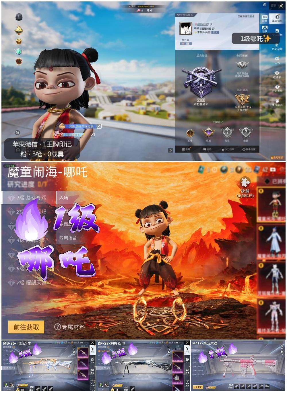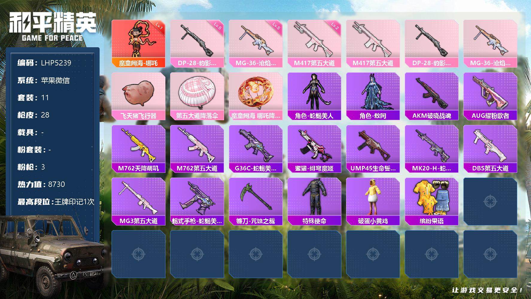 [12367745]素材身法号【特价急出/详情看图】:苹果 微信-1神装-3特效枪-2粉色飞行器-8730热力值-1王牌印记-11套装-28枪皮【红色神装等级】:魔童闹海-哪吒(一级)【粉色枪皮等级】:M417-第五大道(二级),DP-28-豹影疾电(五级),MG-36-沧焰双生(五级)【粉色飞行器】:飞天猪飞行器