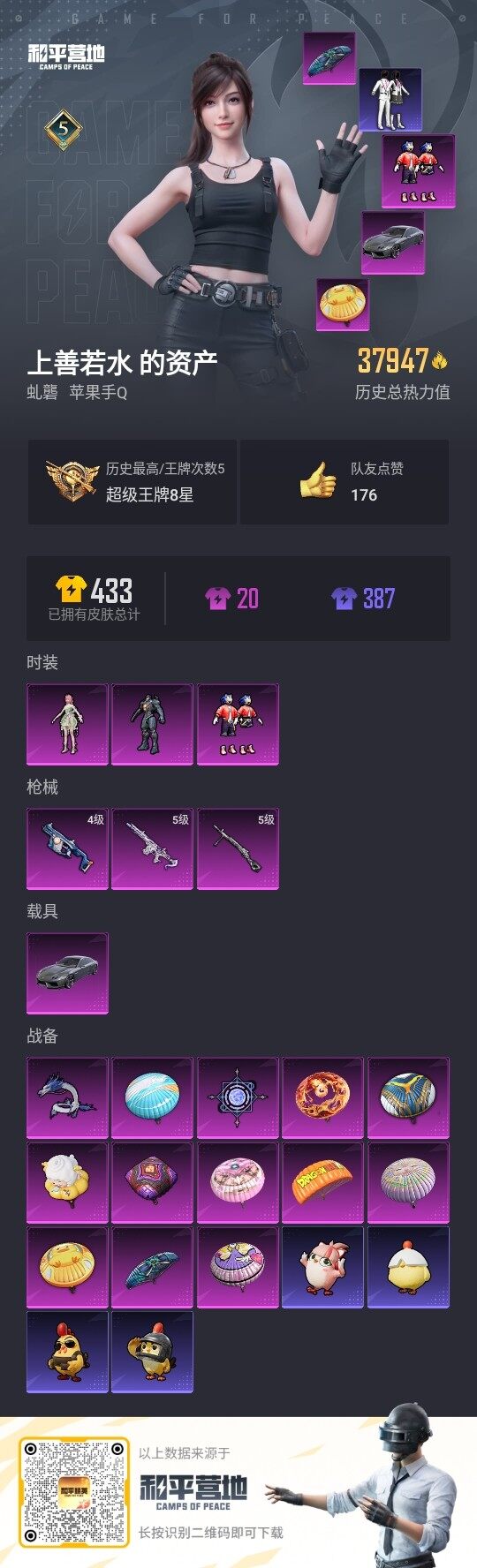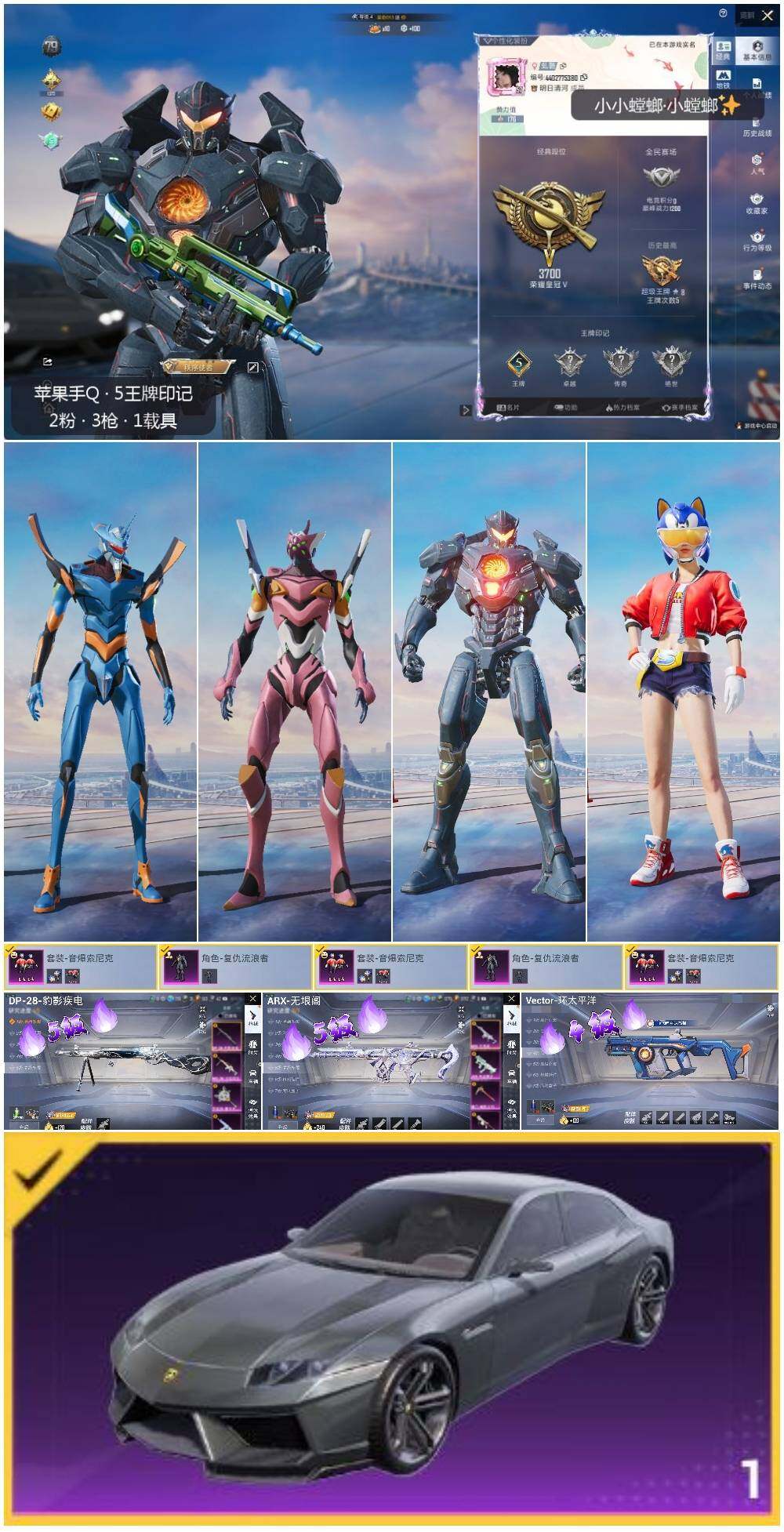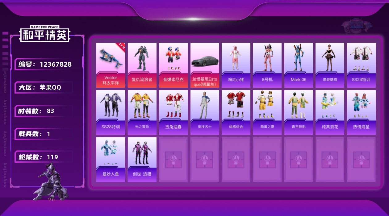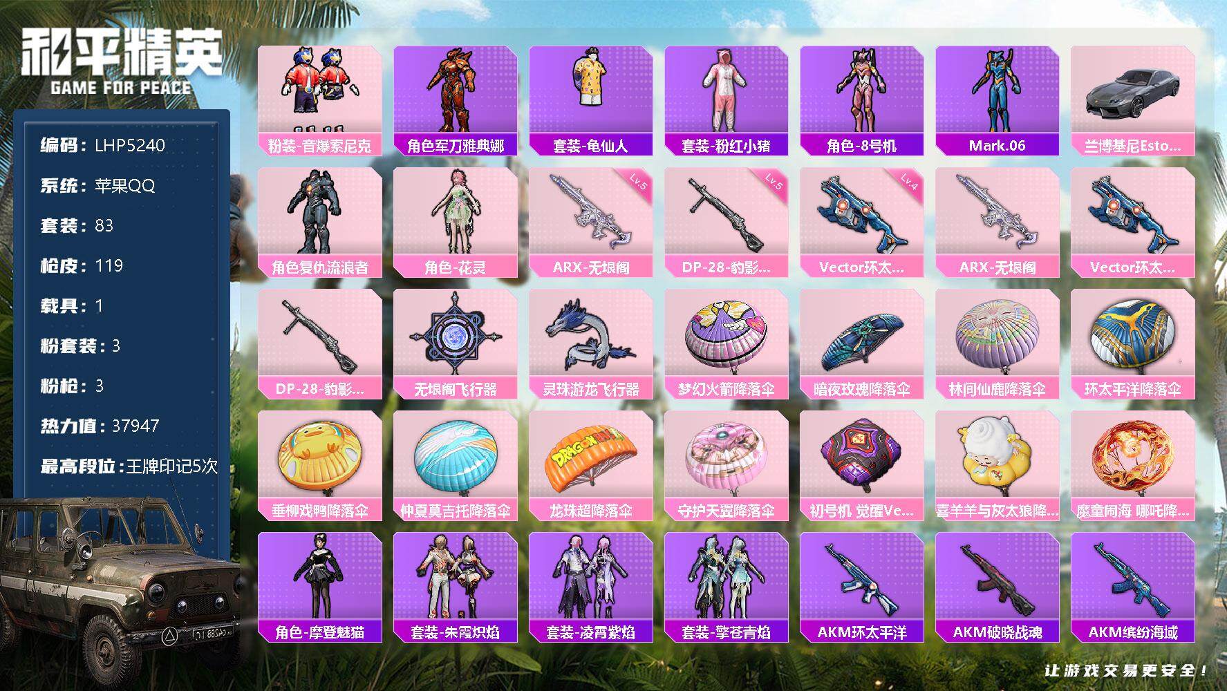 [12367828]【特价急出/详情看图】:苹果 手Q-3粉装-3特效枪-1载具-2粉色飞行器-3.7w热力值-5王牌印记-83套装-119枪皮【热门品类】:粉装-音爆索尼克,角色-军刀雅典娜,套装-龟仙人,套装-粉红小猪,角色-8号机,角色-Mark.06【粉色载具】:兰博基尼Estoque(银翼灰)【粉色套装】:角色-复仇流浪者,粉装-音爆索尼克,角色-花灵【粉色枪皮等级】:ARX-无垠阁(五级),Vector-环太平洋(四级),DP-28-豹影疾电(五级)【粉色飞行器】:无垠阁飞行器,灵珠游龙飞行器