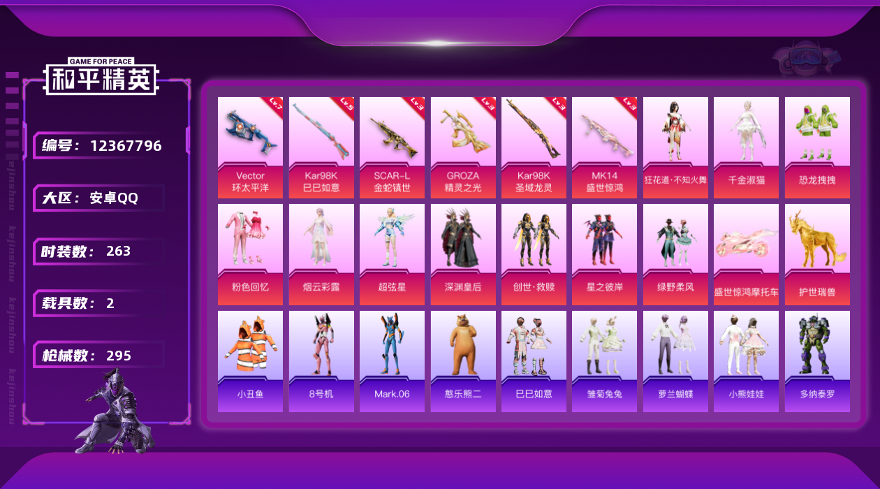 - PX_2104844- 苹果手Q-20王牌印记-14粉装-10特效枪-1载具-89435热力值-197套装-264枪皮-1卓越印记-1传奇印记 【14粉装】,梦幻火箭,天使彩虹糖,缤纷油彩,蓝莓炮弹,深海曼妙,迷蝶贵族,炙焰牛王,向日葵,霞光圣骑,寒光使者,冰霜白皇,绚金战神,香水柠檬,星之彼岸 【10特效枪】AKM-炫紫旋律-6级 SCAR-L-梦幻火箭-6级 M416-五爪金龙-1级 M416