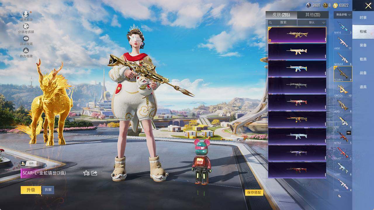 SCAR-L-金蛇镇世,GROZA-精灵之光,Vector-环太平洋,Kar98K-巳巳如意,Kar98K-圣域龙灵,Mk14-盛世惊鸿
