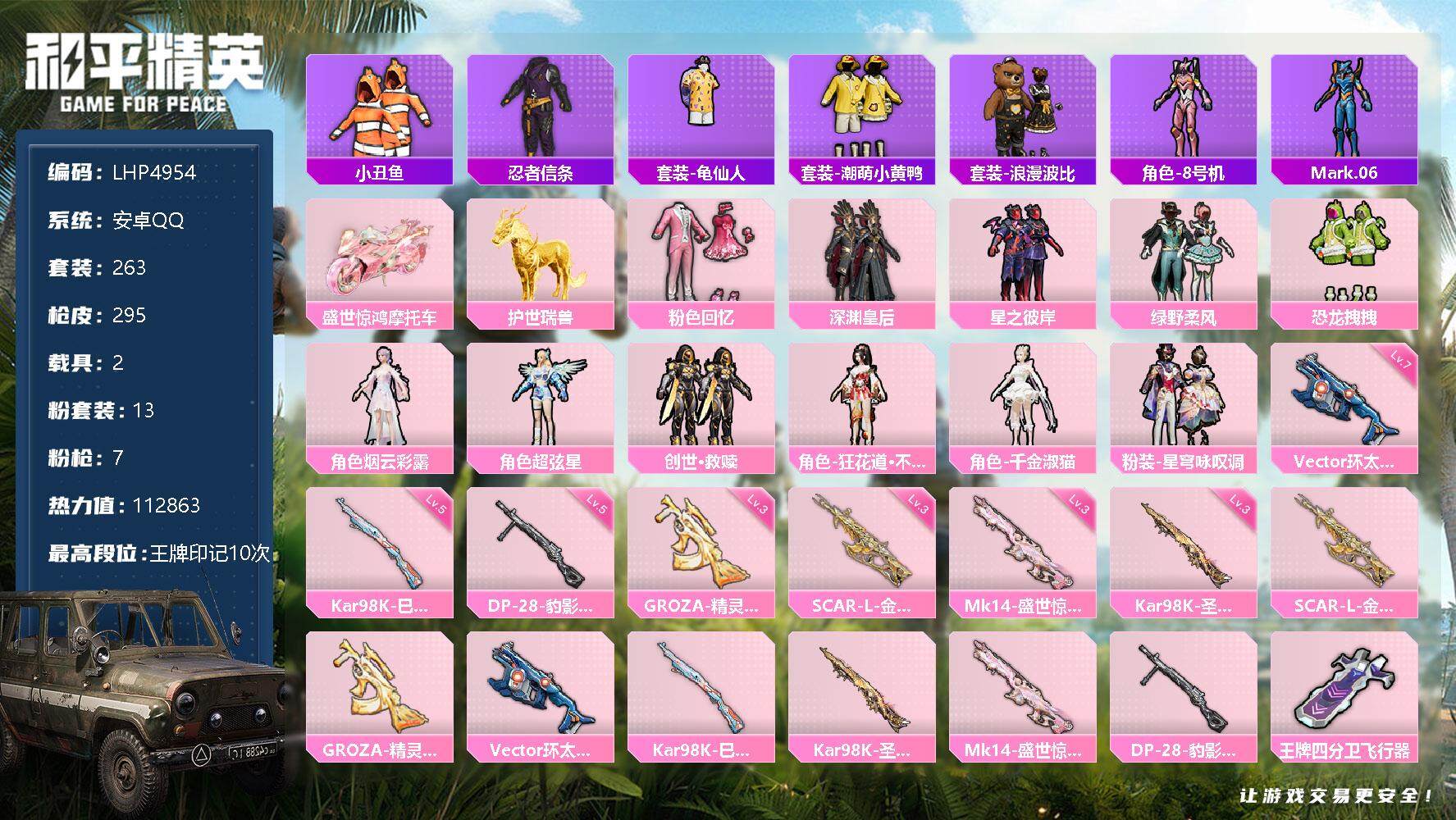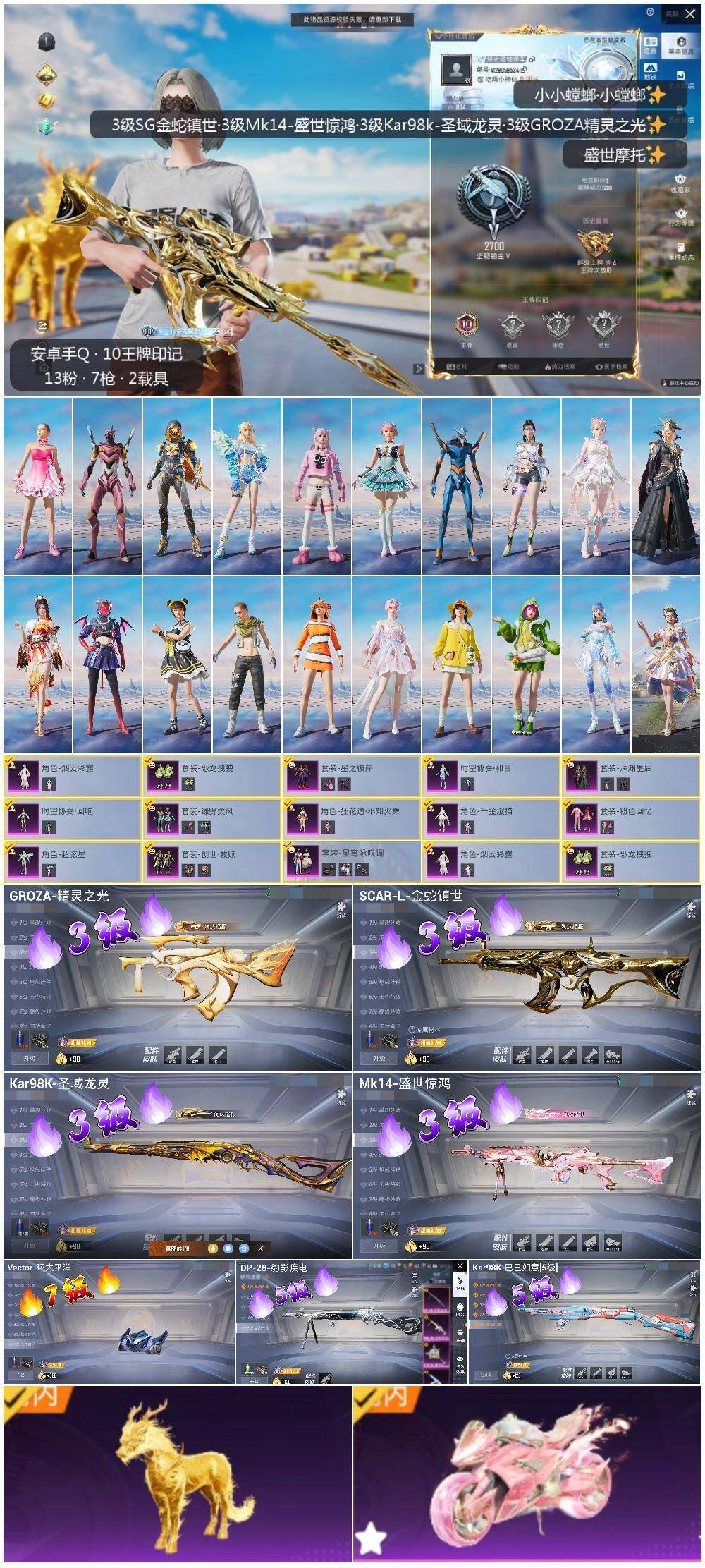[12367796]连体王者安卓Q-V9-379皮肤2典藏3珍品传说-17传说、素材身法号地铁满天赋【特价急出/详情看图】:安卓 手Q-13粉装-7特效枪-2载具-10粉色飞行器-11.2w热力值-10王牌印记-263套装-295枪皮【热门品类】:套装-小丑鱼,套装-忍者信条,套装-龟仙人,套装-潮萌小黄鸭,套装-浪漫波比,角色-8号机,角色-Mark.06【粉色载具】:盛世惊鸿摩托车,护世瑞兽【粉色套装】:粉装-粉色回忆,粉装-深渊皇后,粉装-星之彼岸,粉装-绿野柔风,粉装-恐龙拽拽,角色-烟云彩露,角色-超弦星,套装-创世·救赎,角色-狂花道·不知火舞,角色-千金淑猫,粉装-星穹咏叹调【粉色枪皮等级】:SCAR-L-金蛇镇世(三级),GROZA-精灵之光(三级),Vector-环太平洋(七级),Kar98K-巳巳如意(五级),Kar98K-圣域龙灵(三级),Mk14-盛世惊鸿(三级),DP-28-豹影疾电(五级)【粉色飞行器】:王牌四分卫飞行器,星之彼岸飞行器,相思残雪飞行器,镜域双华-灵镜之阶,电糖天使飞行器,龙翔九天飞行器,深渊漩涡飞行器,凤舞九天飞行器,万象金身飞行器,圣域金龙飞行器