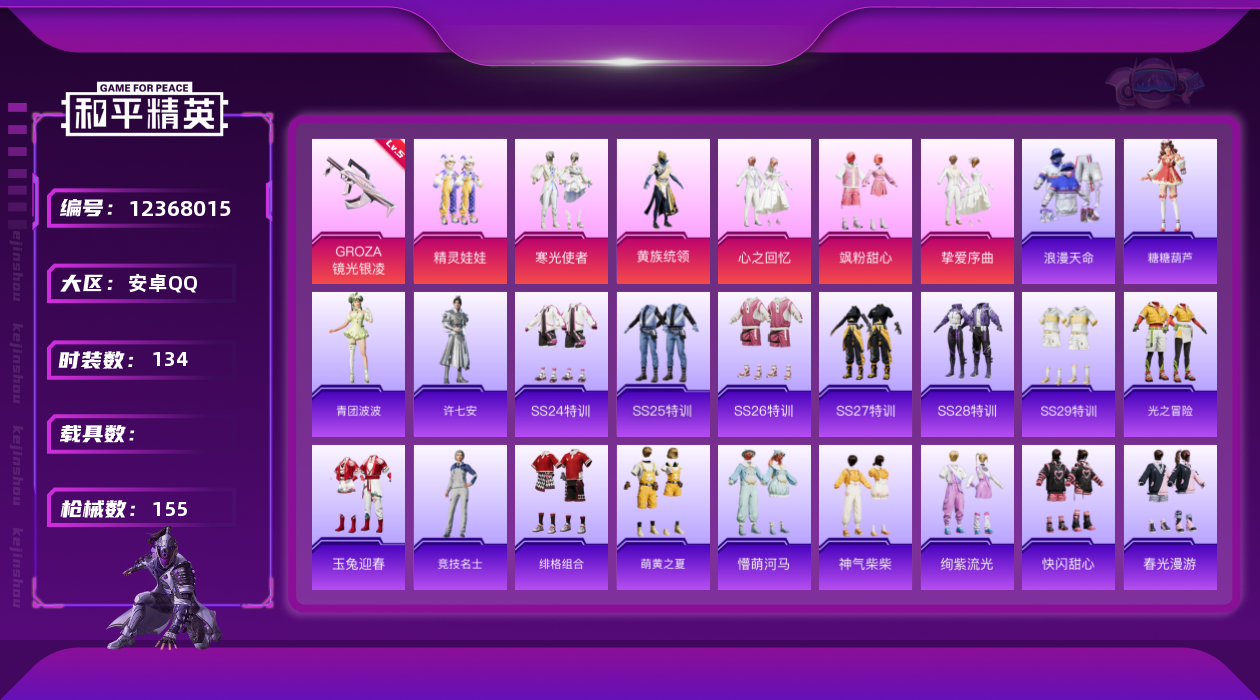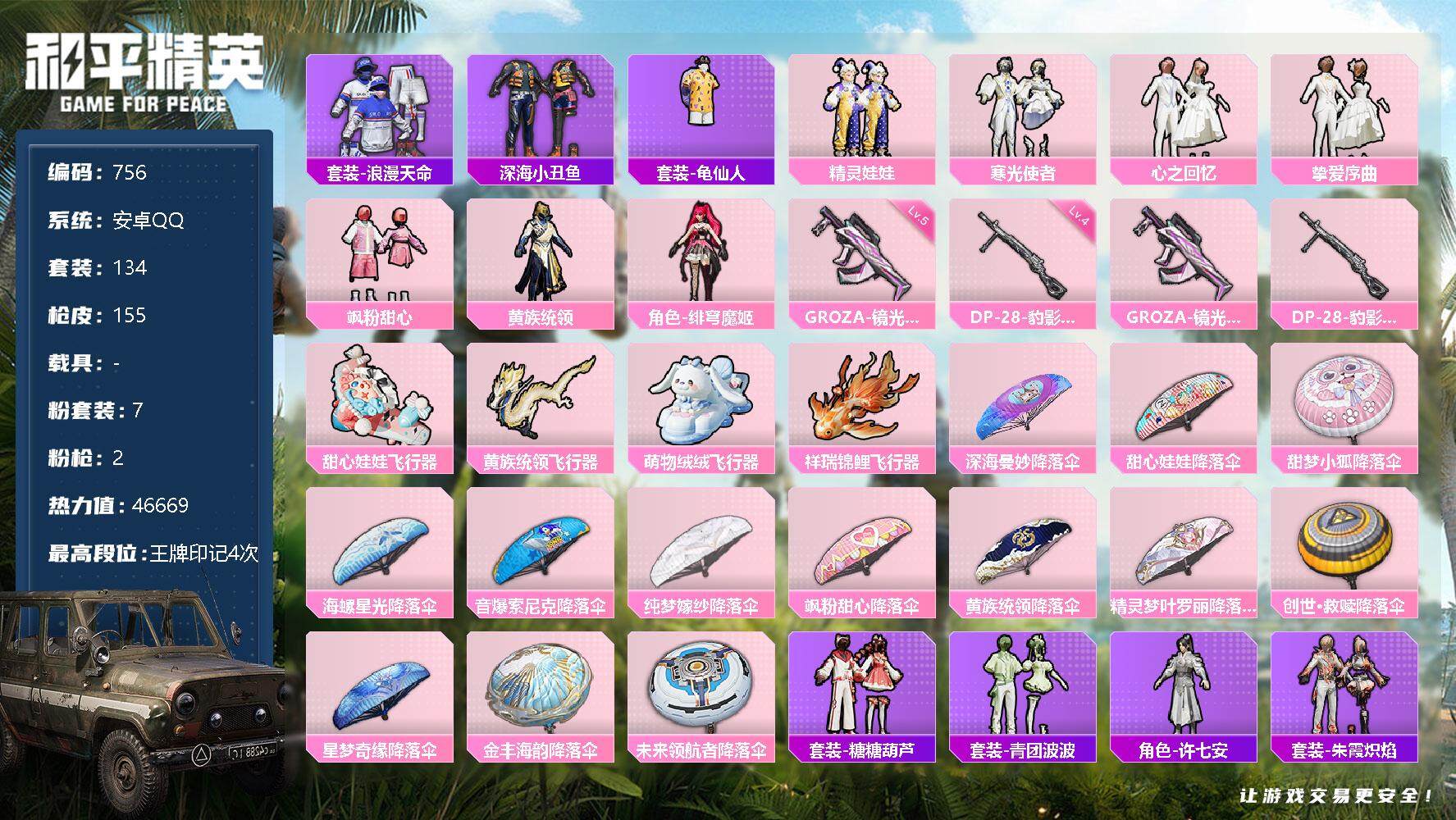 [12368015]【商品标题】:安卓 手Q-7粉装-2特效枪-0载具-4粉色飞行器-46669热力值-4王牌印记-134套装-155枪皮