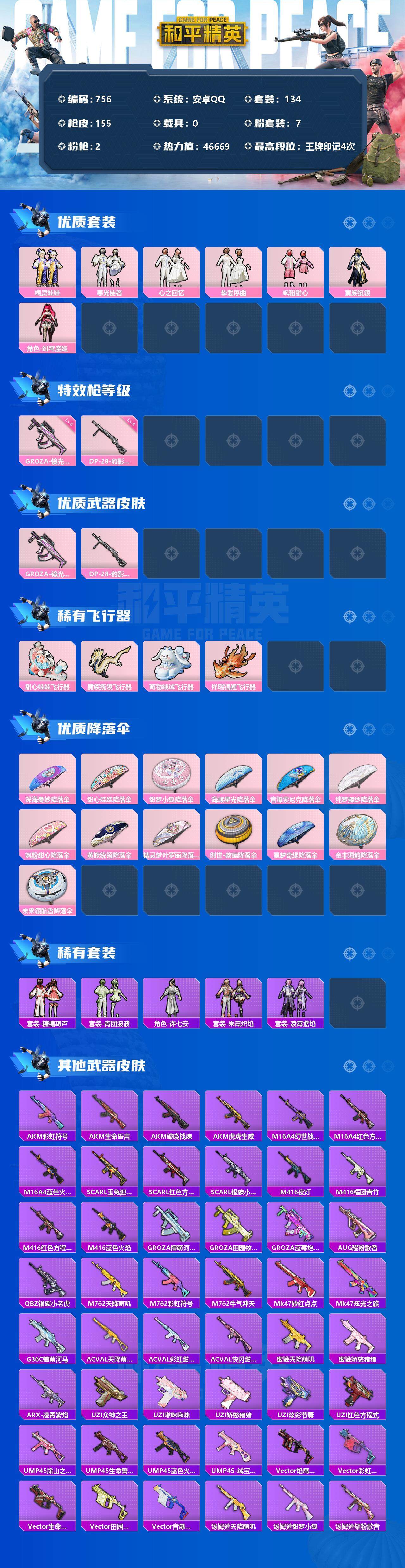 [12368015]【商品标题】:安卓 手Q-7粉装-2特效枪-0载具-4粉色飞行器-46669热力值-4王牌印记-134套装-155枪皮 【热门品类】:套装-浪漫天命,套装-深海小丑鱼,套装-龟仙人 【粉色套装】:粉装-精灵娃娃,粉装-寒光使者,粉装-心之回忆,粉装-挚爱序曲,粉装-飒粉甜心,粉装-黄族统领,角色-绯穹魔姬 【粉色枪皮等级】:GROZA-镜光银凌(五级),DP-28-豹影疾电(四级) 【粉色枪皮】:GROZA-镜光银凌,DP-28-豹影疾电 【粉色飞行器】:甜心娃娃飞行器,黄族统领飞行器,萌物绒绒飞行器,祥瑞锦鲤飞行器 【粉色降落伞】:深海曼妙降落伞,甜心娃娃降落伞,甜梦小狐降落伞,海螺星光降落伞,音爆索尼克降落伞,纯梦嫁纱降落伞,飒粉甜心降落伞,黄族统领降落伞,精灵梦叶罗丽降落伞,创世·救赎降落伞,星梦奇缘降落伞,金丰海韵降落伞,未来领航者降落伞 【稀有套装】:套装-龟仙人,套装-糖糖葫芦,套装-青团波波,角色-许七安,套装-朱霞炽焰,套装-凌霄紫焰 【稀有枪皮】:AKM-彩虹符号,AKM-生命誓言,AKM-破晓战魂,AKM-虎虎生威,M16A4-幻世战舞者,M16A4-红色方程式,M16A4-蓝色火焰,SCAR-L-玉兔迎春,SCAR-L-红色方程式,SCAR-L-银碳小老虎,M416-夜灯,M416-糯团青竹,M416-红色方程式,M416-蓝色火焰,GROZA-懵萌河马,GROZA-田园牧歌,GROZA-蓝莓炮弹,AUG-耀粉歌者,QBZ-银碳小老虎,M762-天降萌叽,M762-彩虹符号,M762-牛气冲天,Mk47-妙红点点,Mk47-炫光之旅,G36C-懵萌河马,AC-VAL-天降萌叽,AC-VAL-彩虹甜喵,AC-VAL-快闪甜心,蜜獾-天降萌叽,蜜獾-娇憨猪猪,ARX-凌霄紫焰,UZI-众神之王,UZI-啾咪啾咪,UZI-娇憨猪猪,UZI-炫彩节奏,UZI-红色方程式,UMP45-涂山之恋,UMP45-生命誓言,UMP45-蓝色火焰,UMP45-绒宝小鹅,Vector-焰鹰斗篷,Vector-彩虹符号,Vector-生命誓言,Vector-田园牧歌,Vector-音爆索尼克,汤姆逊-天降萌叽,汤姆逊-甜梦小狐,汤姆逊-耀粉歌者,MP5K-众神之王,MP5K-飒粉甜心,JS9-凌霄紫焰,P90-快闪甜心,P90-巳巳如意,Kar98K-彩虹符号,Ka