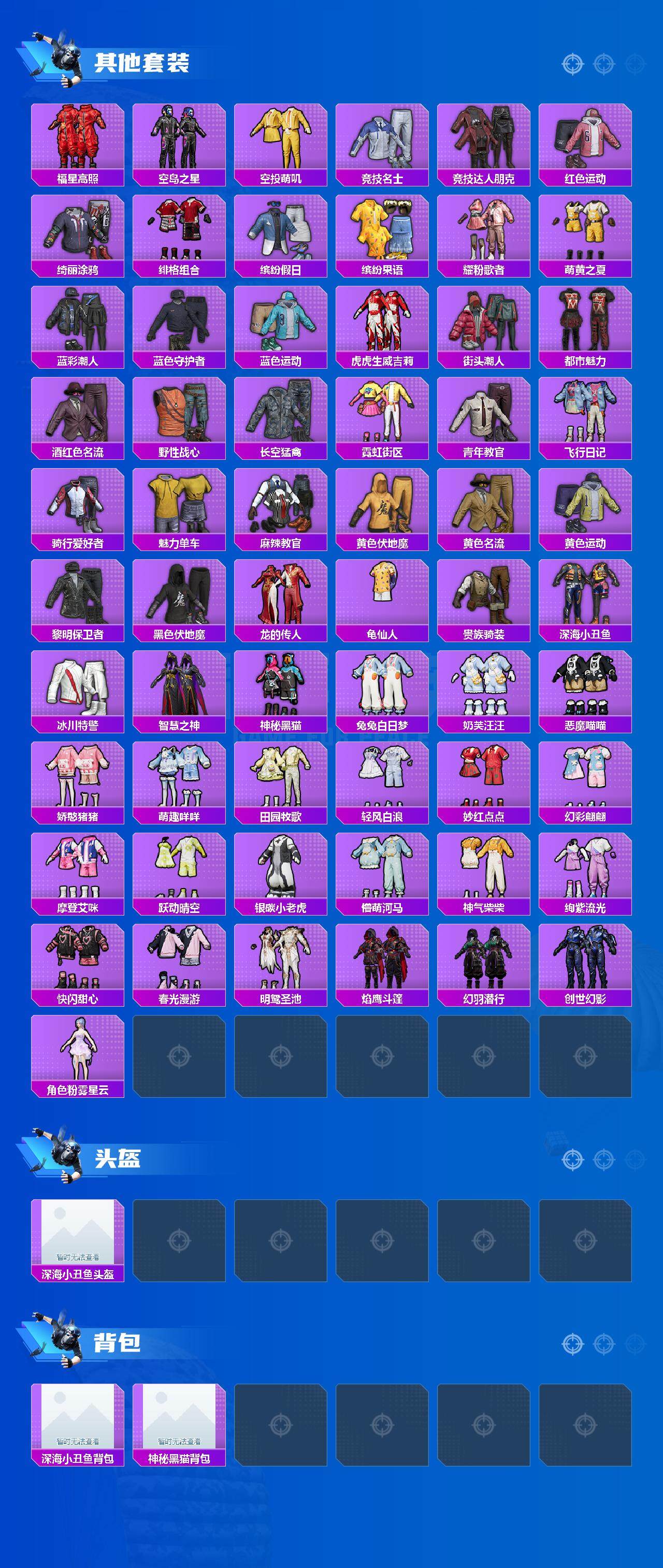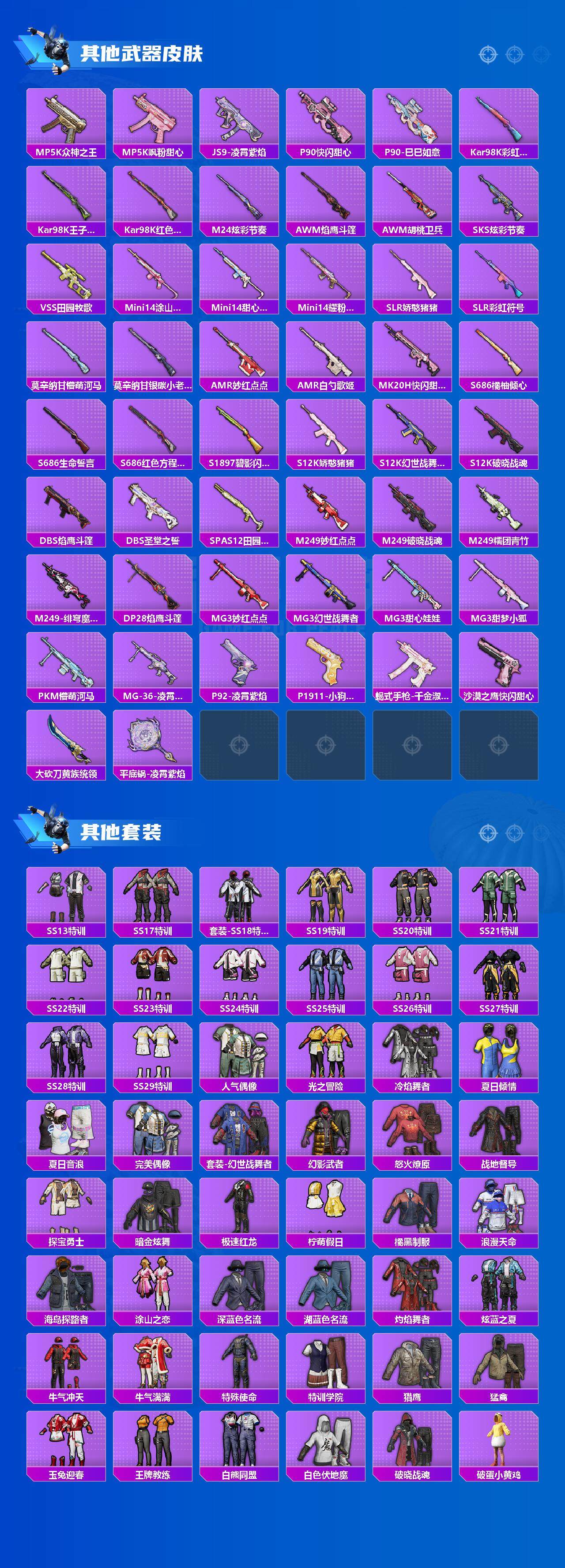 - [11970591]1粉装 4特效枪 15印记 可二次 可修改实名 身法装备:Mark.06(新蓝螳螂) 优质装备:AKM炫紫旋律,M416五爪金龙,七级AKM-炫紫旋律,七级M416-五爪金龙,Kar98K-巳巳如意 热门装扮:电波星,万圣娃娃 稀有枪皮:DP-28-豹影疾电 五级特效枪:五级Kar98K-巳巳如意,五级DP-28-豹影疾电 紫色装扮:SS23特训,SS30特训套装,SS31特训套装,SS33特训套装,SS21特训,SS22特训,顶瓜瓜,吉莉礼服,夏日音浪,闪银刀客,时空追击者,暴风机械师,SS16特训,电音精灵,瑞龙福将,团圆交子,SS17特训,艾克斯奥特曼,萌趣颜团子,特种颜团子,青春冒险家,潮流游乐家,SS15特训,SS20特训,甜心亚梦,虚音幻奏,SS18特训,飞驰魅影,音速流光,极速竞梦,SS19特训,黄色名流,飞行日记,魅力单车,麻辣教官,黄色运动,黑色伏地魔,龟仙人,童心宝龙,冰河战士,龙魂突击队,蝶变,香桃花海,长空猛禽,深蓝色名流,灰色守护者,炫蓝之夏,热血青春,燃烧卡路里,牛气冲天,探宝勇士,柠萌假日,格斗先锋,竞技达人朋克,缤纷果语,耀眼新星,蓝色守护者,空投萌叽,特殊使命,特训学院,猛禽,王牌教练,登山爱好者,福星高照,萝兰蝴蝶,SS29特训,小熊娃娃,星途旅人,雏菊兔兔,热情海星,SS28特训,创世·幻影,Mark.06(新蓝螳螂),白光莹,巳巳如意,青团波波,糖糖葫芦,棉花软糖,竞技名士,摩登魅猫,街头风暴,光矢逐梦,纯真浪花,粉红小猪,SS24特训(SS24特训套装),SS25特训,SS27特训,焰鹰斗篷,幻羽潜行,幽夜迷踪,情公主,SS26特训,大橘大利,SS32特训服(SS32特训套装),青玉碎影,绯格组合,恋语绒绒,光之冒险,漫步者,冰冻风暴 优质战备:星空武士飞行器,星途旅人降落伞,未来领航者降落伞,太空嘟嘟降落伞,王牌四分卫降落伞,飞行器-齐天大圣
