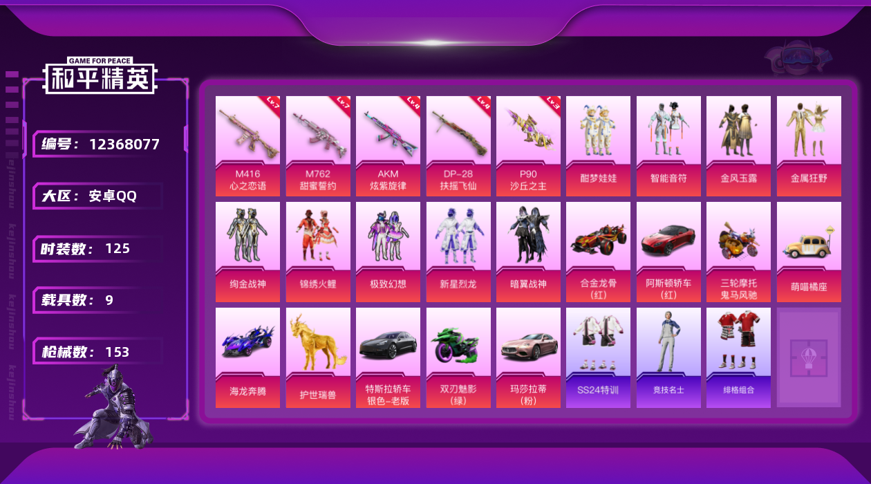 [12368077]【商品标题】:安卓 手Q-10粉装-5特效枪-9载具-7粉色飞行器-71906热力值-1王牌印记-125套装-153枪皮